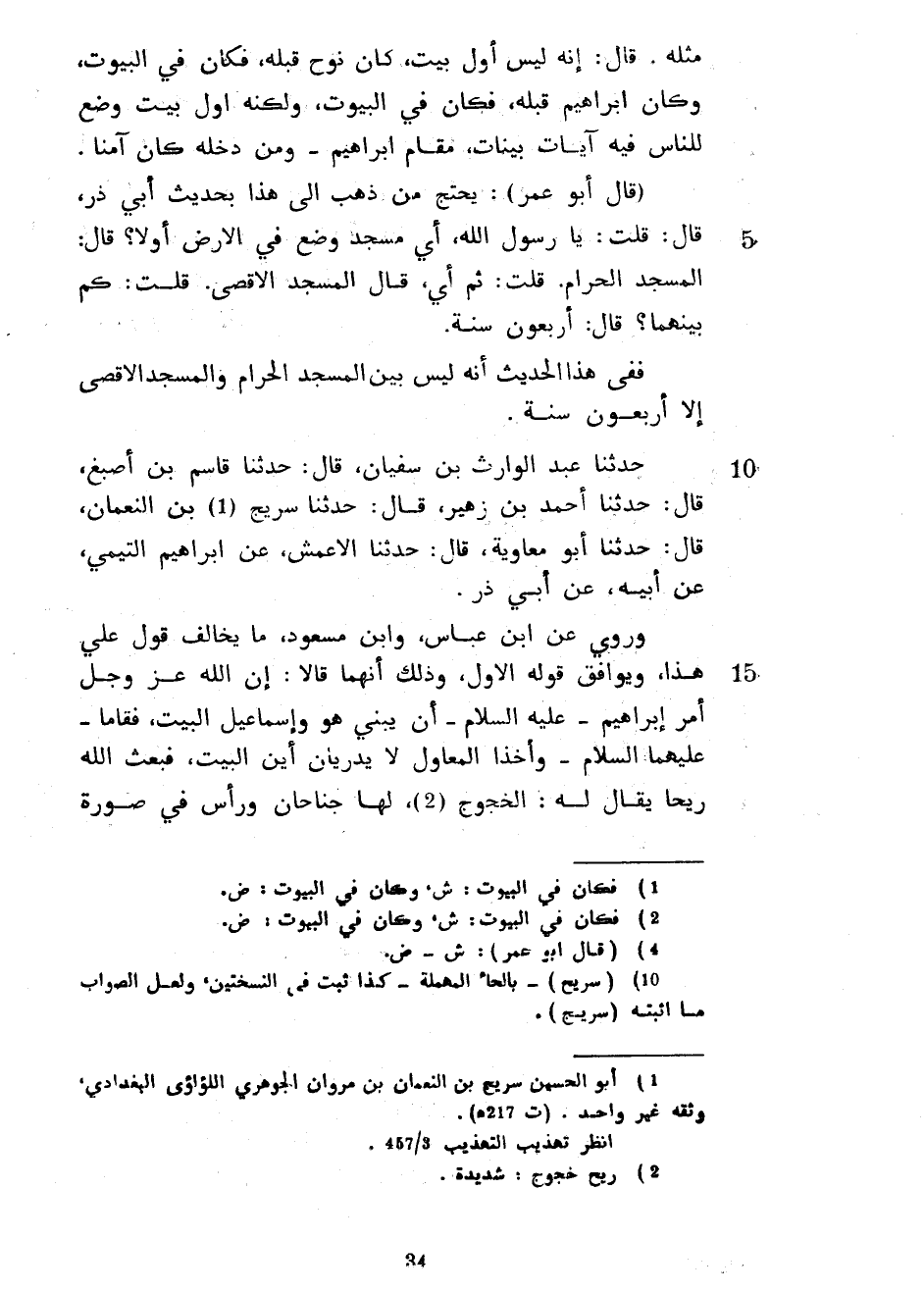 مِثْلَهُ قَالَ إِنَّهُ لَيْسَ أَوَّلُ بَيْتٍ كَانَ نُوحٌ قَبْلَهُ فَكَانَ فِي الْبُيُوتِ وَكَانَ إِبْرَاهِيمُ قَبْلَهُ فَكَانَ فِي الْبُيُوتِ وَلَكِنَّهُ أَوَّلُ بَيْتٍ وُضِعَ لِلنَّاسِ فِيهِ آيَاتٌ بَيِّنَاتٌ مَقَامُ إِبْرَاهِيمَ وَمَنْ دَخَلَهُ كَانَ آمِنًا (قَالَ أَبُو عُمَرَ) يَحْتَجُّ مَنْ ذَهَبَ إِلَى هَذَا بِحَدِيثِ أَبِي ذَرٍّ قَالَ قُلْتُ يَا رَسُولَ اللَّهِ أَيُّ مَسْجِدٍ وُضِعَ فِي الْأَرْضِ أَوَّلًا قَالَ الْمَسْجِدُ الْحَرَامُ قُلْتُ ثُمَّ أَيٌّ قَالَ الْمَسْجِدُ الْأَقْصَى قُلْتُ كَمْ بَيْنَهُمَا قَالَ أَرْبَعُونَ سَنَةً فَفِي هذا الحديث أنه ليس بين المسجد والحرام وَالْمَسْجِدِ الْأَقْصَى إِلَّا أَرْبَعُونَ سَنَةً حَدَّثَنَا عَبْدُ الْوَارِثِ بْنُ سُفْيَانَ قَالَ حَدَّثَنَا قَاسِمُ بْنُ أَصْبَغَ قَالَ حَدَّثَنَا أَحْمَدُ بْنُ زُهَيْرٍ قَالَ حَدَّثَنَا سُرَيْجُ بْنُ النُّعْمَانِ قَالَ حَدَّثَنَا أَبُو مُعَاوِيَةَ قَالَ حَدَّثَنَا الْأَعْمَشُ عَنْ إِبْرَاهِيمَ التَّيْمِيِّ عَنْ أَبِيهِ عَنْ أَبِي ذَرٍّ وَرُوِيَ عَنِ ابْنِ عَبَّاسٍ وَابْنِ مَسْعُودٍ مَا يُخَالِفُ قَوْلَ عَلِيٍّ هَذَا وَيُوَافِقُ قَوْلَهُ الْأَوَّلَ وَذَلِكَ أَنَّهُمَا قَالَا إِنَّ اللَّهَ عَزَّ وَجَلَّ أَمَرَ إِبْرَاهِيمَ عَلَيْهِ السَّلَامُ أَنْ يَبْنِيَ هُوَ وَإِسْمَاعِيلُ الْبَيْتَ فَقَامَا عَلَيْهِمَا السَّلَامُ وَأَخَذَا الْمَعَاوِلَ لَا يَدْرِيَانِ أَيْنَ الْبَيْتُ فَبَعَثَ اللَّهِ رِيحًا يُقَالُ لَهُ الْخَجُوجُ لَهَا جَنَاحَانِ وَرَأْسٌ فِي صُورَةِ