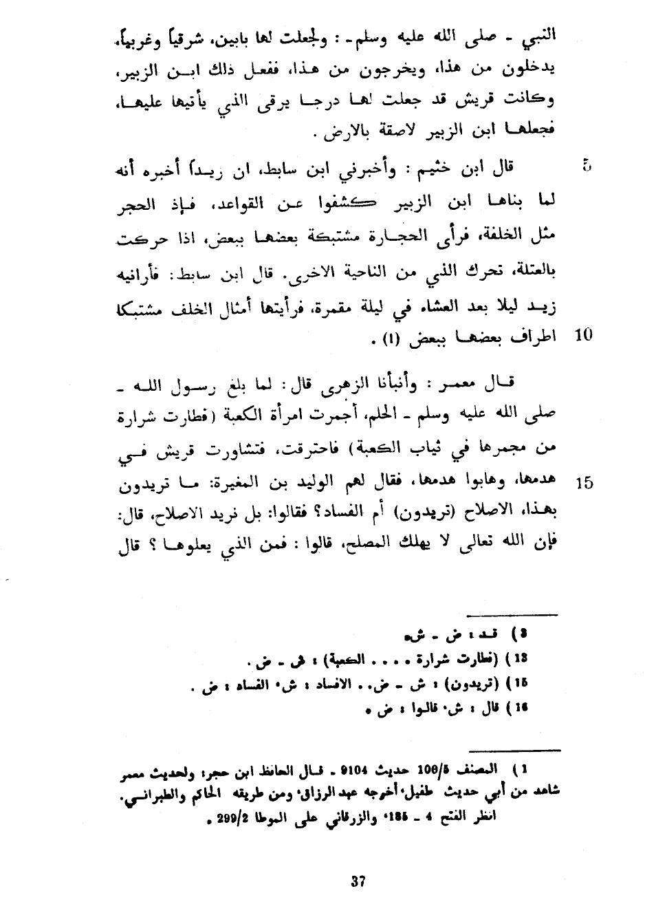 النَّبِيُّ صَلَّى اللَّهُ عَلَيْهِ وَسَلَّمَ وَلَجَعَلْتُ لَهَا بَابَيْنِ شَرْقِيًّا وَغَرْبِيًّا يَدْخُلُونَ مِنْ هَذَا وَيَخْرُجُونَ مِنْ هَذَا فَفَعَلَ ذَلِكَ ابْنُ الزُّبَيْرِ وَكَانَتْ قُرَيْشٌ قَدْ جَعَلَتْ لَهَا دُرْجًا يَرْقَى الَّذِي يَأْتِيهَا عَلَيْهَا فَجَعَلَهَا ابْنُ الزُّبَيْرِ لَاصِقَةً بِالْأَرْضِ قَالَ ابْنُ خُثَيْمٍ وَأَخْبَرَنِي ابْنُ سَابِطٍ أَنَّ زَيْدًا أَخْبَرَهُ أَنَّهُ لَمَّا بَنَاهَا ابْنُ الزُّبَيْرِ كَشَفُوا عَنِ الْقَوَاعِدِ فَإِذِ الْحَجَرُ مِثْلَ الْخِلْفَةِ فَرَأَى الْحِجَارَةَ مُشْتَبِكَةً بَعْضُهَا بِبَعْضٍ إِذَا حُرِّكَتْ بِالْعَتَلَةِ تَحَرَّكَ الَّذِي مِنَ النَّاحِيَةِ الْأُخْرَى قَالَ ابْنُ سَابِطٍ فَأَرَانِيهِ زَيْدٌ لَيْلًا بَعْدَ الْعِشَاءِ فِي لَيْلَةٍ مُقْمِرَةٍ فَرَأَيْتُهَا أَمْثَالَ الْخِلْفِ مُشْتَبِكًا أَطْرَافُ بَعْضِهَا بِبَعْضٍ قَالَ مَعْمَرٌ وَأَنْبَأَنَا الزُّهْرِيُّ قَالَ لَمَّا بَلَغَ رَسُولُ اللَّهِ صَلَّى اللَّهُ عَلَيْهِ وَسَلَّمَ الْحُلَمَ أَجْمَرَتِ امْرَأَةٌ الْكَعْبَةَ (فَطَارَتْ شَرَارَةٌ مِنْ مِجْمَرِهَا فِي ثِيَابِ الْكَعْبَةِ) فَاحْتَرَقَتْ فَتَشَاوَرَتْ قُرَيْشٌ فِي هَدْمِهَا وَهَابُوا هَدْمَهَا فَقَالَ لَهُمُ الْوَلِيدُ بْنُ الْمُغِيرَةِ مَا تُرِيدُونَ بِهَذَا الْإِصْلَاحُ (تُرِيدُونَ) أَمِ الْفَسَادُ فَقَالُوا بَلْ نُرِيدُ الْإِصْلَاحَ قَالَ فَإِنَّ اللَّهَ تَعَالَى لَا يُهْلِكُ الْمُصْلِحَ قَالُوا فَمَنِ الَّذِي يَعْلُوهَا قَالَ