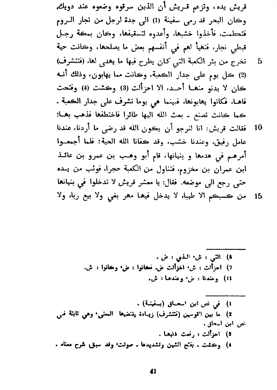 قُرَيْشٌ يَدَهُ وَتَزْعُمُ قُرَيْشٌ أَنَّ الَّذِينَ سَرَقُوهُ وَضَعُوهُ عِنْدَ دُوَيْكٍ وَكَانَ الْبَحْرُ قَدْ رَمَى سَفِينَةً إِلَى جُدَّةَ لِرَجُلٍ مِنْ تُجَّارِ الرُّومِ فتحطمت فأخدوا خَشَبَهَا وَأَعَدُّوهُ لِتَسْقِيفِهَا وَكَانَ بِمَكَّةَ رَجُلٌ قِبْطِيٌّ نَجَّارٌ فَتَهَيَّأَ لَهُمْ فِي أَنْفُسِهِمْ بَعْضَ مَا يُصْلِحُهَا وَكَانَتْ حَيَّةٌ تَخْرُجُ مِنْ بِئْرِ الْكَعْبَةِ الَّتِي كَانَ يُطْرَحُ فِيهَا مَا يُهْدَى لَهَا (فَتَتَشَرَّفُ) كُلَّ يَوْمٍ عَلَى جِدَارِ الْكَعْبَةِ وَكَانَتْ مِمَّا يَهَابُونَ وَذَلِكَ أَنَّهُ كَانَ لَا يَدْنُو مِنْهَا أَحَدٌ إِلَّا احْزَأَلَّتْ وَكَشَّتْ وَفَتَحَتْ فَاهَا فَكَانُوا يَهَابُونَهَا فَبَيْنَمَا هِيَ يَوْمًا تَشْرُفُ عَلَى جِدَارِ الْكَعْبَةِ كَمَا كَانَتْ تَصْنَعُ بَعَثَ اللَّهُ إِلَيْهَا طَائِرًا فَاخْتَطَفَهَا فَذَهَبَ بِهَا فَقَالَتْ قُرَيْشٌ إِنَّا لَنَرْجُوَ أَنْ يَكُونَ اللَّهُ قَدْ رَضِيَ مَا أَرَدْنَا عِنْدَنَا عَامِلٌ رَفِيقٌ وَعِنْدَنَا خَشَبٌ وَقَدْ كَفَانَا اللَّهُ الْحَيَّةَ فَلَمَّا أَجْمَعُوا أَمْرَهُمْ فِي هَدْمِهَا وَبُنْيَانِهَا قَامَ أَبُو وَهْبِ بْنِ عَمْرِو بْنِ عَائِذِ بْنِ عِمْرَانَ بْنِ مَخْزُومٍ فَتَنَاوَلَ مِنَ الْكَعْبَةِ حَجَرًا فَوَثَبَ مِنْ يَدِهِ حَتَّى رَجَعَ إِلَى مَوْضِعِهِ فَقَالَ يَا مَعْشَرَ قُرَيْشٍ لَا تُدْخِلُوا فِي بُنْيَانِهَا مِنْ كَسْبِكُمْ إِلَّا طَيِّبًا لَا يَدْخُلُ فِيهَا مَهْرُ بَغِيٍّ وَلَا بَيْعُ رِبَا وَلَا