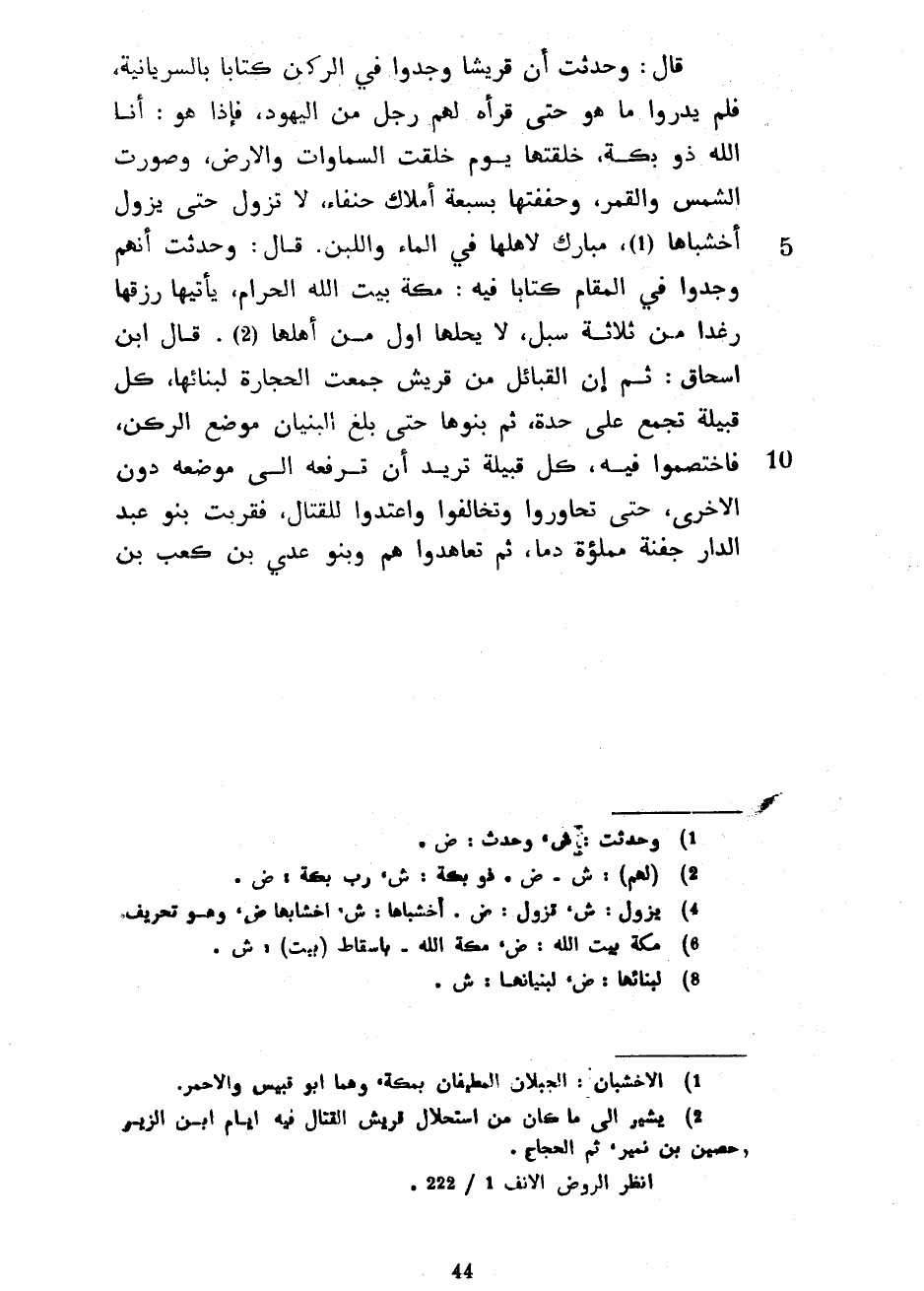 قَالَ وَحُدِّثْتُ أَنَّ قُرَيْشًا وَجَدُوا فِي الرُّكْنِ كِتَابًا بِالسُّرْيَانِيَّةِ فَلَمْ يَدْرُوا مَا هُوَ حَتَّى قَرَأَهُ لَهُمْ رَجُلٌ مِنَ الْيَهُودِ فَإِذَا هُوَ أَنَا اللَّهُ ذُو بَكَّةَ خَلَقْتُهَا يَوْمَ خَلَقْتُ السَّمَاوَاتِ وَالْأَرْضَ وَصَوَّرْتُ الشَّمْسَ وَالْقَمَرَ وَحَفَفْتُهَا بِسَبْعَةِ أَمْلَاكٍ حُنَفَاءَ لَا تَزُولُ حَتَّى يَزُولَ أَخْشَبَاهَا مُبَارَكٌ لِأَهْلِهَا فِي الْمَاءِ وَاللَّبَنِ قَالَ وَحُدِّثْتُ أَنَّهُمْ وَجَدُوا فِي الْمَقَامِ كِتَابًا فِيهِ مَكَّةُ بَيْتُ اللَّهِ الْحَرَامُ يَأْتِيهَا رِزْقُهَا رَغَدًا مِنْ ثَلَاثَةِ سُبُلٍ لَا يَحِلُّهَا أَوَّلُ مَنْ أَهَلَّهَا قَالَ ابْنُ إِسْحَاقَ ثُمَّ إِنَّ الْقَبَائِلَ مِنْ قُرَيْشٍ جَمَعَتِ الْحِجَارَةَ لِبِنَائِهَا كُلُّ قَبِيلَةٍ تَجْمَعُ عَلَى حِدَةٍ ثُمَّ بَنَوْهَا حَتَّى بَلَغَ الْبُنْيَانُ مَوْضِعَ الرُّكْنِ فَاخْتَصَمُوا فِيهِ كُلُّ قَبِيلَةٍ تُرِيدُ أَنْ تَرْفَعَهُ إِلَى مَوْضِعِهِ دُونَ الْأُخْرَى حَتَّى تَحَاوَرُوا وَتَخَالَفُوا وَاعْتَدُّوا لِلْقِتَالِ فَقَرَّبَتْ بَنُو عَبْدِ الدَّارِ جَفْنَةً مَمْلُوءَةً دَمًا ثُمَّ تَعَاهَدُوا هُمْ وَبَنُو عَدِيِّ بْنِ كَعْبِ بْنِ