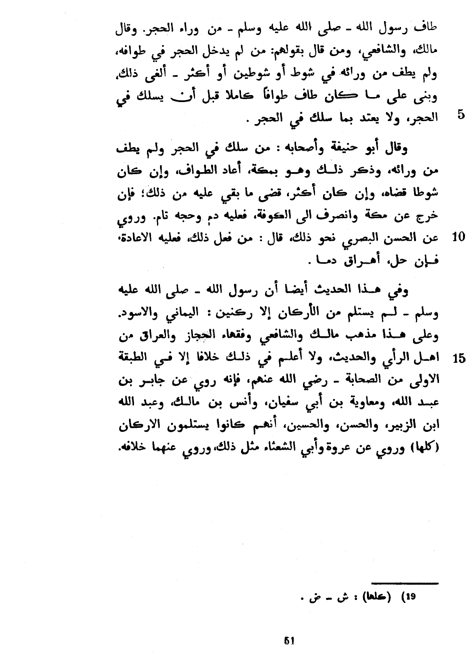 طَافَ رَسُولُ اللَّهِ صَلَّى اللَّهُ عَلَيْهِ وَسَلَّمَ مِنْ وَرَاءِ الْحِجْرِ وَقَالَ مَالِكٌ وَالشَّافِعِيُّ وَمَنْ قَالَ بِقَوْلِهِمْ مَنْ لَمْ يُدْخِلِ الْحِجْرَ فِي طَوَافِهِ وَلَمْ يَطُفْ مِنْ وَرَائِهِ فِي شَوْطٍ أَوْ شَوْطَيْنِ أَوْ أَكْثَرَ أَلْغَى ذَلِكَ وَبَنَى عَلَى مَا كَانَ طَافَ طَوَافًا كَامِلًا قَبْلَ أَنْ يَسَلُكَ فِي الْحِجْرِ وَلَا يَعْتَدُّ بِمَا سَلَكَ فِي الْحِجْرِ وَقَالَ أَبُو حَنِيفَةَ وَأَصْحَابُهُ مَنْ سَلَكَ فِي الْحِجْرِ وَلَمْ يَطُفْ مِنْ وَرَائِهِ وَذَكَرَ ذَلِكَ وَهُوَ بِمَكَّةَ أَعَادَ الطَّوَافَ وَإِنْ كَانَ شَوْطًا قَضَاهُ وَإِنْ كَانَ أَكْثَرَ قَضَى مَا بَقِيَ عَلَيْهِ مِنْ ذَلِكَ فَإِنْ خَرَجَ عَنْ مَكَّةَ وَانْصَرَفَ إِلَى الْكُوفَةِ فَعَلَيْهِ دَمٌ وَحَجُّهُ تَامٌّ وَرُوِيَ عَنِ الْحَسَنِ الْبَصْرِيِّ نَحْوَ ذَلِكَ قَالَ مَنْ فَعَلَ ذَلِكَ فَعَلَيْهِ الْإِعَادَةُ فَإِنْ حَلَّ أَهْرَاقَ دَمًا وَفِي هَذَا الْحَدِيثِ أَيْضًا أَنَّ رَسُولَ اللَّهِ صَلَّى اللَّهُ عَلَيْهِ وَسَلَّمَ لَمْ يَسْتَلِمْ مِنَ الْأَرْكَانِ إِلَّا رُكْنَيْنِ الْيَمَانِيَّ وَالْأَسْوَدَ وَعَلَى هَذَا مَذْهَبُ مَالِكٍ وَالشَّافِعِيِّ وَفُقَهَاءِ الْحِجَازِ وَالْعِرَاقِ مِنْ أَهْلِ الرَّأْيِ وَالْحَدِيثِ وَلَا أَعْلَمُ فِي ذَلِكَ خِلَافًا إِلَّا فِي الطَّبَقَةِ الْأُولَى مِنَ الصَّحَابَةِ رَضِيَ اللَّهُ عَنْهُمْ فَإِنَّهُ رُوِيَ عَنْ جَابِرِ بْنِ عَبْدِ اللَّهِ وَمُعَاوِيَةَ بْنِ أَبِي سُفْيَانَ وَأَنَسِ بْنِ مَالِكٍ وَعَبْدِ اللَّهِ بْنِ الزُّبَيْرِ وَالْحَسَنِ وَالْحُسَيْنِ أَنَّهُمْ كَانُوا يَسْتَلِمُونَ الْأَرْكَانَ (كُلَّهَا) وَرُوِيَ عَنْ عُرْوَةَ وَأَبِي الشَّعْثَاءِ مِثْلَ ذَلِكَ وَرُوِيَ عَنْهُمَا خلافه