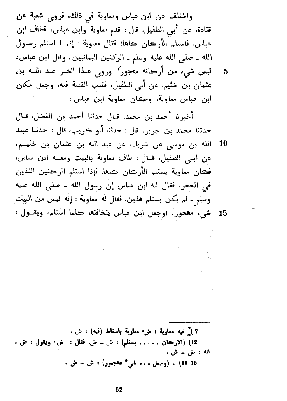 وَاخْتُلِفَ عَنِ ابْنِ عَبَّاسٍ وَمُعَاوِيَةَ فِي ذَلِكَ فَرَوَى شُعْبَةُ عَنْ قَتَادَةَ عَنْ أَبِي الطُّفَيْلِ قَالَ قَدِمَ مُعَاوِيَةُ وَابْنُ عَبَّاسٍ فَطَافَ ابْنُ عَبَّاسٍ فَاسْتَلَمَ الْأَرْكَانَ كُلَّهَا فَقَالَ مُعَاوِيَةُ إِنَّمَا اسْتَلَمَ رَسُولُ اللَّهِ صَلَّى اللَّهُ عَلَيْهِ وَسَلَّمَ الرُّكْنَيْنِ الْيَمَانِيَيْنِ وَقَالَ ابْنُ عَبَّاسٍ لَيْسَ شَيْءٌ مِنْ أَرْكَانِهِ مَهْجُورًا وَرَوَى هَذَا الْخَبَرَ عَبْدِ اللَّهِ بْنِ عُثْمَانَ بْنِ خُثَيْمٍ عَنْ أبي الطُّفَيْلِ فَقَلَّبَ الْقِصَّةَ فِيهِ وَجَعَلَ مَكَانَ ابْنِ عَبَّاسٍ مُعَاوِيَةَ وَمَكَانَ مُعَاوِيَةَ ابْنَ عَبَّاسٍ أَخْبَرَنَا أَحْمَدُ بْنُ مُحَمَّدٍ قَالَ حَدَّثَنَا أَحْمَدُ بْنُ الْفَضْلِ قَالَ حَدَّثَنَا مُحَمَّدُ بْنُ جَرِيرٍ قَالَ حَدَّثَنَا أَبُو كُرَيْبٍ قَالَ حَدَّثَنَا عُبَيْدُ اللَّهِ بْنُ مُوسَى عَنْ شَرِيكٍ عَنْ عَبْدِ اللَّهِ بْنِ عُثْمَانَ بْنِ خُثَيْمٍ عن أبي الطفيل قَالَ طَافَ مُعَاوِيَةُ بِالْبَيْتِ وَمَعَهُ ابْنُ عَبَّاسٍ فَكَانَ مُعَاوِيَةُ يَسْتَلِمُ الْأَرْكَانَ كُلَّهَا فَإِذَا اسْتَلَمَ الرُّكْنَيْنِ اللَّذَيْنِ فِي الْحِجْرِ فَقَالَ لَهُ ابْنُ عَبَّاسٍ أَنَّ رَسُولَ اللَّهِ صَلَّى اللَّهُ عليه وَسَلَّمَ لَمْ يَكُنْ يَسْتَلِمُ هَذَيْنِ فَقَالَ لَهُ مُعَاوِيَةُ إِنَّهُ لَيْسَ مِنَ الْبَيْتِ شَيْءٌ مَهْجُورٌ (وَجَعَلَ ابْنُ عَبَّاسٍ يَتَخَافَتُهَا كُلَّمَا اسْتَلَمَ وَيَقُولُ
