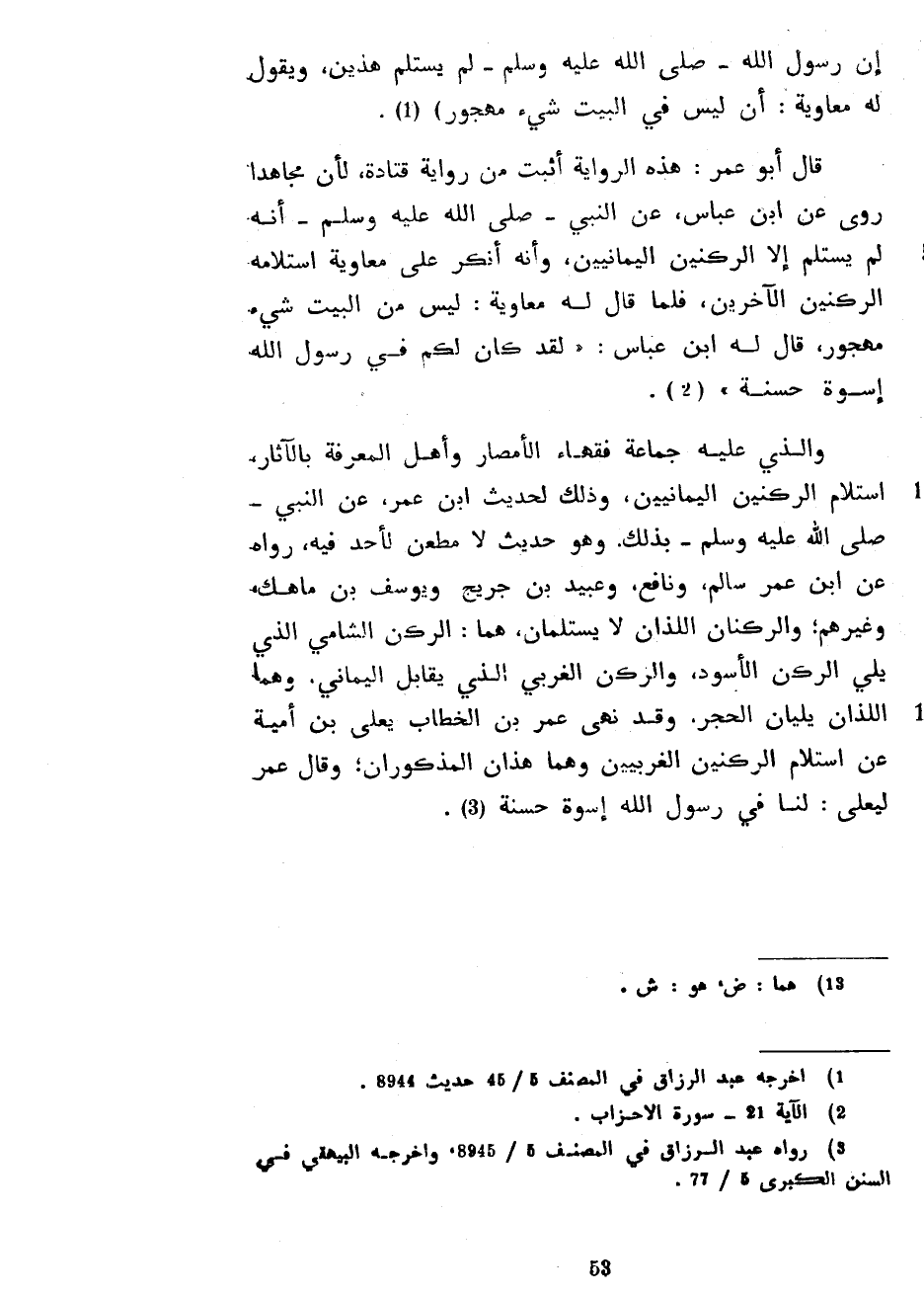 أَنَّ رَسُولَ اللَّهِ صَلَّى اللَّهُ عَلَيْهِ وَسَلَّمَ لَمْ يَسْتَلِمْ هَذَيْنِ وَيَقُولُ لَهُ مُعَاوِيَةُ أَنْ لَيْسَ فِي الْبَيْتِ شَيْءٌ مَهْجُورٌ) قَالَ أَبُو عُمَرَ هَذِهِ الرِّوَايَةُ أَثْبَتُ مِنْ رِوَايَةِ قَتَادَةَ لِأَنَّ مُجَاهِدًا رُوِيَ عَنِ ابْنِ عَبَّاسٍ عَنِ النَّبِيِّ صَلَّى اللَّهُ عليه وَسَلَّمَ أَنَّهُ لَمْ يَسْتَلِمْ إِلَّا الرُّكْنَيْنِ الْيَمَانِيَيْنِ وأنه أنكر على معاوية استلامه الركنين الآخرين فَلَمَّا قَالَ لَهُ مُعَاوِيَةُ لَيْسَ مِنَ الْبَيْتِ شَيْءٌ مَهْجُورٌ قَالَ لَهُ ابْنُ عَبَّاسٍ لَقَدْ كَانَ لَكُمْ فِي رَسُولِ اللَّهِ أُسْوَةٌ حَسَنَةٌ وَالَّذِي عَلَيْهِ جَمَاعَةُ فُقَهَاءِ الْأَمْصَارِ وَأَهْلُ الْمَعْرِفَةِ بِالْآثَارِ اسْتِلَامُ الرُّكْنَيْنِ الْيَمَانِيَيْنِ وَذَلِكَ لِحَدِيثِ ابْنِ عُمَرَ عَنِ النَّبِيِّ صَلَّى اللَّهُ عَلَيْهِ وَسَلَّمَ بِذَلِكَ وَهُوَ حَدِيثٌ لَا مَطْعَنَ لِأَحَدٍ فِيهِ رَوَاهُ عَنِ ابْنِ عُمَرَ سَالِمٌ وَنَافِعٌ وَعُبَيْدُ بْنُ جُرَيْجٍ وَيُوسُفُ بْنُ مَاهِكٍ وَغَيْرُهُمْ وَالرُّكْنَانِ اللَّذَانِ لَا يَسْتَلِمَانِ هُمَا الرُّكْنُ الشَّامِيُّ الَّذِي يَلِي الرُّكْنُ الْأَسْوَدُ وَالرُّكْنُ الْغَرْبِيُّ الَّذِي يُقَابِلُ الْيَمَانِيُّ وَهُمَا اللَّذَانِ يَلِيَانِ الْحِجْرَ وَقَدْ نَهَى عُمَرُ بْنُ الْخَطَّابِ يَعْلَى بْنَ أُمَيَّةَ عَنِ اسْتِلَامِ الرُّكْنَيْنِ الْغَرْبِيَّيْنِ وَهُمَا هَذَانِ الْمَذْكُورَانِ وَقَالَ عُمَرُ لِيَعْلَى لَنَا فِي رَسُولِ اللَّهِ أُسْوَةٌ حسنة