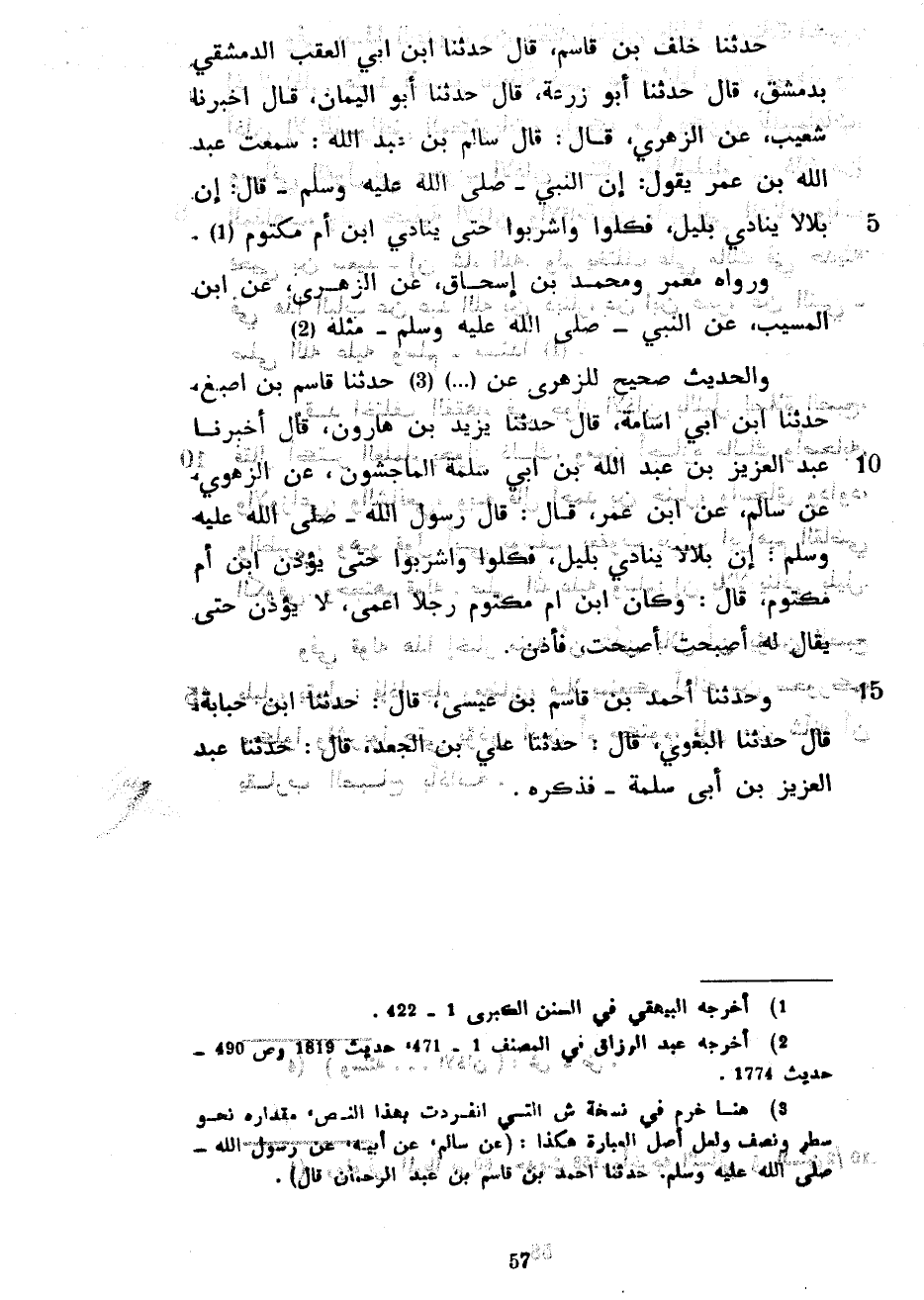 حَدَّثَنَا خَلَفُ بْنُ قَاسِمٍ قَالَ حَدَّثَنَا ابْنُ أَبِي الْعَقَبِ الدِّمَشْقِيُّ بِدِمَشْقَ قَالَ حَدَّثَنَا أَبُو زُرْعَةَ قَالَ حَدَّثَنَا أَبُو الْيَمَانِ قَالَ أَخْبَرَنَا شُعَيْبٌ عَنِ الزُّهْرِيِّ قَالَ قَالَ سَالِمُ بْنُ عَبْدِ اللَّهِ سَمِعْتُ عَبْدَ اللَّهِ بْنَ عُمَرَ يَقُولُ إِنَّ النَّبِيَّ صَلَّى اللَّهُ عَلَيْهِ وَسَلَّمَ قَالَ إِنَّ بِلَالًا يُنَادِي بِلَيْلٍ فَكُلُوا وَاشْرَبُوا حَتَّى يُنَادِيَ ابْنُ أُمِّ مَكْتُومٍ وَرَوَاهُ مَعْمَرٌ وَمُحَمَّدُ بْنُ إِسْحَاقَ عَنِ الزُّهْرِيِّ عَنِ ابْنِ الْمُسَيَّبِ عَنِ النَّبِيِّ صَلَّى اللَّهُ عَلَيْهِ وَسَلَّمَ مثله والحديث صحيح اللزهري عَنْ () حَدَّثَنَا قَاسِمُ بْنُ أَصْبَغَ حَدَّثَنَا ابْنُ أَبِي أُسَامَةَ قَالَ حَدَّثَنَا يَزِيدُ بْنُ هَارُونَ قَالَ أَخْبَرَنَا عَبْدُ الْعَزِيزِ بْنُ عَبْدِ اللَّهِ بْنِ أَبِي سلمة الماجشون عَنِ الزُّهْرِيِّ عَنْ سَالِمٍ عَنِ ابْنِ عُمَرَ قَالَ قَالَ رَسُولُ اللَّهِ صَلَّى اللَّهُ عَلَيْهِ وَسَلَّمَ إِنَّ بِلَالًا يُنَادِي بِلَيْلٍ فَكُلُوا وَاشْرَبُوا حَتَّى يُؤَذِّنَ ابْنُ أُمِّ مَكْتُومٍ قَالَ وَكَانَ ابْنُ أُمِّ مَكْتُومٍ رجلا أعمى لَا يُؤَذِّنُ حَتَّى يُقَالَ لَهُ أَصْبَحْتَ أَصْبَحْتَ فَأَذِّنْ وَحَدَّثَنَا أَحْمَدُ بْنُ قَاسِمِ بْنِ عِيسَى قَالَ حَدَّثَنَا ابْنُ حُبَابَةَ قَالَ حَدَّثَنَا الْبَغَوِيُّ قَالَ حَدَّثَنَا عَلِيُّ بْنُ الْجَعْدِ قَالَ حَدَّثَنَا عَبْدُ الْعَزِيزِ بْنُ أَبِي سَلَمَةَ فَذَكَرَهُ