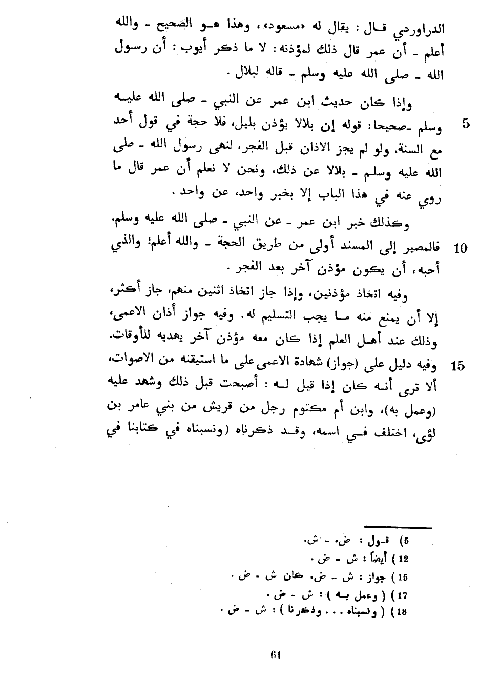 الدَّرَاوَرْدِيَّ قَالَ يُقَالُ لَهُ مَسْعُودٌ وَهَذَا هُوَ الصَّحِيحُ وَاللَّهُ أَعْلَمُ أَنَّ عُمَرَ قَالَ ذَلِكَ لِمُؤَذِّنِهِ لَا مَا ذَكَرَ أَيُّوبُ أَنَّ رَسُولَ اللَّهِ صَلَّى اللَّهُ عَلَيْهِ وَسَلَّمَ قَالَهُ لِبِلَالٍ وَإِذَا كَانَ حَدِيثِ ابْنِ عُمَرَ عَنِ النَّبِيِّ صَلَّى اللَّهُ عَلَيْهِ وَسَلَّمَ صَحِيحًا قَوْلُهُ إِنَّ بِلَالًا يُؤَذِّنُ بِلَيْلٍ فَلَا حُجَّةَ فِي قَوْلِ أَحَدٍ مَعَ السُّنَّةِ وَلَوْ لَمْ يَجُزِ الْأَذَانَ قَبْلَ الْفَجْرِ لِنَهْيِ رَسُولِ اللَّهِ صَلَّى اللَّهُ عَلَيْهِ وَسَلَّمَ بِلَالًا عَنْ ذَلِكَ وَنَحْنُ لَا نَعْلَمُ أَنَّ عُمَرَ قَالَ مَا رُوِيَ عَنْهُ فِي هَذَا الْبَابِ إِلَّا بِخَبَرٍ وَاحِدٍ عَنْ وَاحِدٍ وَكَذَلِكَ خَبَرُ ابْنِ عُمَرَ عَنِ النَّبِيِّ صَلَّى اللَّهُ عَلَيْهِ وَسَلَّمَ فَالْمَصِيرُ إِلَى الْمُسْنَدِ أَوْلَى مِنْ طَرِيقِ الْحُجَّةِ وَاللَّهُ أَعْلَمُ وَالَّذِي أُحِبُّهُ أَنْ يَكُونَ مُؤَذِّنٌ آخَرُ بَعْدَ الْفَجْرِ وَفِيهِ اتِّخَاذُ مُؤَذِّنَيْنِ وَإِذَا جَازَ اتِّخَاذُ اثْنَيْنِ مِنْهُمْ جَازَ أَكْثَرُ إِلَّا أَنْ يَمْنَعَ مِنْهُ مَا يَجِبُ التَّسْلِيمُ لَهُ وَفِيهِ جَوَازُ أَذَانِ الْأَعْمَى وَذَلِكَ عِنْدَ أَهْلِ الْعِلْمِ إِذَا كَانَ مَعَهُ مُؤَذِّنٌ آخَرُ يَهْدِيهِ لِلْأَوْقَاتِ وَفِيهِ دَلِيلٌ عَلَى (جَوَازِ) شَهَادَةِ الْأَعْمَى عَلَى مَا اسْتَيْقَنَهُ مِنَ الْأَصْوَاتِ أَلَا تَرَى أَنَّهُ كَانَ إِذَا قِيلَ لَهُ أَصْبَحْتَ قَبْلَ ذَلِكَ وَشَهِدَ عَلَيْهِ (وَعَمِلَ بِهِ) وَابْنُ أُمِّ مَكْتُومٍ رَجُلٌ مِنْ قُرَيْشٍ مِنْ بَنِي عَامِرِ بْنِ لُؤَيٍّ اخْتُلِفَ فِي اسْمِهِ وَقَدْ ذَكَرْنَاهُ (وَنَسَبْنَاهُ فِي كِتَابِنَا في