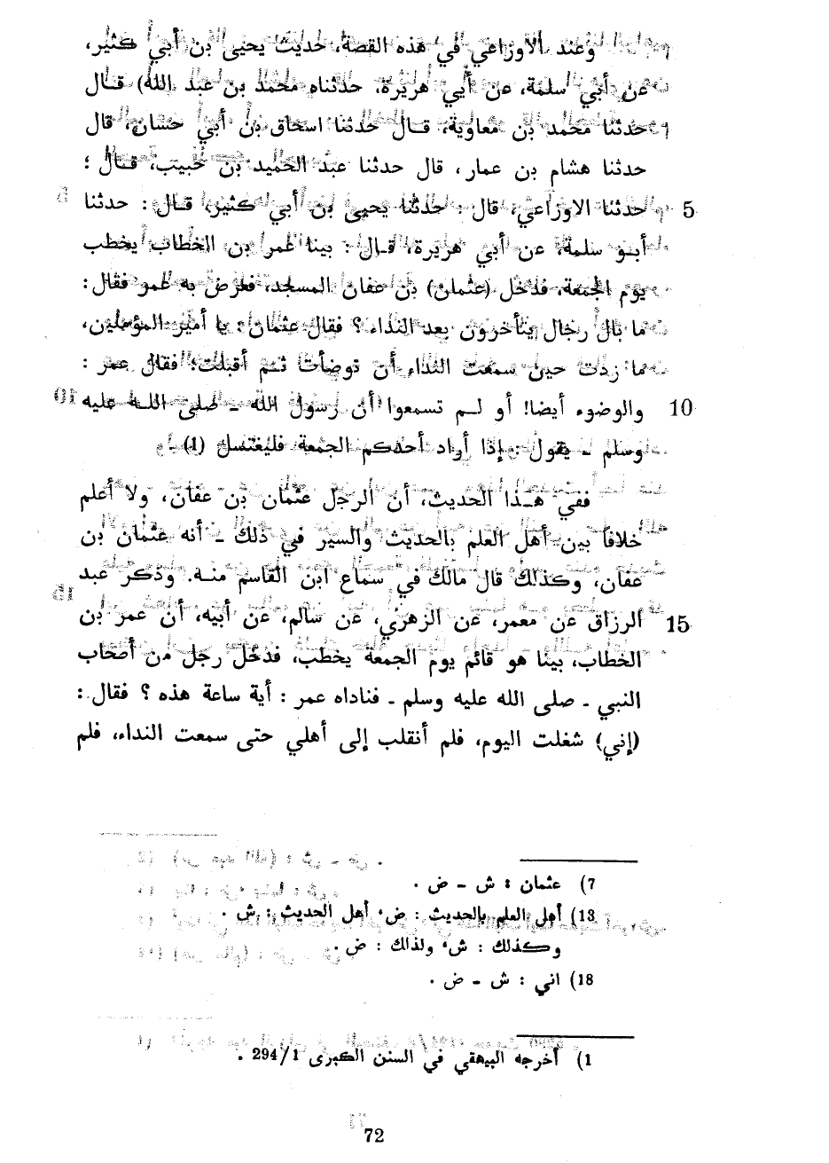 وَعِنْدَ الْأَوْزَاعِيِّ فِي هَذِهِ الْقِصَّةِ حَدِيثَ يَحْيَى بْنِ أَبِي كَثِيرٍ عَنْ أَبِي سَلَمَةَ عَنْ أَبِي هُرَيْرَةَ حَدَّثَنَاهُ مُحَمَّدُ بْنُ عَبْدِ اللَّهِ) قَالَ حَدَّثَنَا مُحَمَّدُ بْنُ مُعَاوِيَةَ قَالَ حَدَّثَنَا إِسْحَاقُ بْنُ أَبِي حَسَّانَ قَالَ حَدَّثَنَا هِشَامُ بْنُ عَمَّارٍ قَالَ حَدَّثَنَا عَبْدُ الْحَمِيدِ بْنُ حَبِيبٍ قَالَ حَدَّثَنَا الْأَوْزَاعِيُّ قَالَ حَدَّثَنَا يَحْيَى بْنُ أَبِي كَثِيرٍ قَالَ حَدَّثَنَا أَبُو سَلَمَةَ عَنْ أَبِي هُرَيْرَةَ قَالَ بَيْنَا عُمَرُ بْنُ الْخَطَّابِ يَخْطُبُ يَوْمَ الْجُمُعَةِ فَدَخَلَ (عُثْمَانُ) بْنُ عَفَّانَ الْمَسْجِدَ فَعَرَّضَ بِهِ عُمَرُ فَقَالَ مَا بَالُ رِجَالٍ يَتَأَخَّرُونَ بَعْدَ النِّدَاءِ فَقَالَ عُثْمَانُ يَا أَمِيرَ الْمُؤْمِنِينَ مَا زِدْتُ حِينَ سَمِعْتُ النِّدَاءَ أَنْ تَوَضَّأْتُ ثُمَّ أَقْبَلْتُ فَقَالَ عُمَرُ والوضوء أيضا أو لم تَسْمَعُوا أَنَّ رَسُولَ اللَّهِ صَلَّى اللَّهُ عَلَيْهِ وَسَلَّمَ يَقُولُ إِذَا أَرَادَ أَحَدُكُمُ الْجُمُعَةَ فَلْيَغْتَسِلْ فَفِي هَذَا الْحَدِيثِ أَنَّ الرَّجُلَ عُثْمَانُ بْنُ عَفَّانَ وَلَا أَعْلَمُ خِلَافًا بَيْنَ أَهْلِ الْعِلْمِ بِالْحَدِيثِ وَالسِّيَرِ فِي ذَلِكَ أَنَّهُ عُثْمَانُ بْنُ عَفَّانَ وَكَذَلِكَ قَالَ مَالِكٌ فِي سَمَاعِ ابْنِ الْقَاسِمِ مِنْهُ وَذَكَرَ عَبْدُ الرَّزَّاقِ عَنْ مَعْمَرٍ عَنِ الزُّهْرِيِّ عَنْ سَالِمٍ عَنْ أَبِيهِ أَنَّ عُمَرَ بْنَ الْخَطَّابِ بَيْنَا هُوَ قَائِمٌ يَوْمَ الْجُمُعَةِ يَخْطُبُ فَدَخَلَ رَجُلٌ مِنْ أَصْحَابِ النَّبِيِّ صَلَّى اللَّهُ عَلَيْهِ وَسَلَّمَ فَنَادَاهُ عُمَرُ أَيَّةُ سَاعَةٍ هَذِهِ فَقَالَ (إِنِّي) شُغِلْتُ الْيَوْمَ فَلَمْ أَنْقَلِبْ إِلَى أَهْلِي حَتَّى سَمِعْتُ النِّدَاءَ فَلَمْ