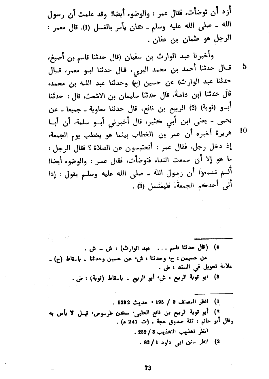 أَزِدْ أَنْ تَوَضَّأْتُ فَقَالَ عُمَرُ وَالْوُضُوءُ أَيْضًا وَقَدْ عَلِمْتُ أَنَّ رَسُولَ اللَّهِ صَلَّى اللَّهُ عَلَيْهِ وَسَلَّمَ كَانَ يَأْمُرُ بِالْغُسْلِ قَالَ مَعْمَرٌ الرَّجُلُ هُوَ عُثْمَانُ بْنُ عَفَّانَ وَأَخْبَرَنَا عَبْدُ الْوَارِثِ بْنُ سُفْيَانَ (قَالَ حَدَّثَنَا قَاسِمُ بْنُ أَصْبَغَ قَالَ حَدَّثَنَا أَحْمَدُ بْنُ مُحَمَّدٍ الْبُرِّيُّ قَالَ حَدَّثَنَا أَبُو مَعْمَرٍ قَالَ حَدَّثَنَا عَبْدُ الوارث) عن حسين وَحَدَّثَنَا عَبْدُ اللَّهِ بْنُ مُحَمَّدٍ قَالَ حَدَّثَنَا ابْنُ دَاسَةَ قَالَ حَدَّثَنَا سُلَيْمَانُ بْنُ الْأَشْعَثِ قَالَ حَدَّثَنَا أَبُو (تَوْبَةَ) الرَّبِيعُ بْنُ نَافِعٍ قَالَ حَدَّثَنَا مُعَاوِيَةُ جَمِيعًا عَنْ يَحْيَى يَعْنِي ابْنَ أَبِي كَثِيرٍ قَالَ أَخْبَرَنِي أَبُو سَلَمَةَ أَنَّ أَبَا هُرَيْرَةَ أَخْبَرَهُ أَنَّ عُمَرَ بْنَ الْخَطَّابِ بَيْنَمَا هُوَ يَخْطُبُ يَوْمَ الْجُمُعَةِ إِذْ دَخَلَ رَجُلٌ فَقَالَ عُمَرُ أَتَحْتَبِسُونَ عَنِ الصَّلَاةِ فَقَالَ الرَّجُلُ مَا هُوَ إِلَّا أَنْ سَمِعْتُ النِّدَاءَ فَتَوَضَّأْتُ فَقَالَ عُمَرُ وَالْوُضُوءُ أَيْضًا أَلَمْ تَسْمَعُوا أَنَّ رَسُولَ اللَّهِ صَلَّى اللَّهُ عَلَيْهِ وَسَلَّمَ يَقُولُ إِذَا أَتَى أَحَدُكُمُ الْجُمُعَةَ فَلْيَغْتَسِلْ