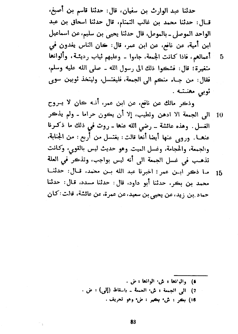 حَدَّثَنَا عَبْدُ الْوَارِثِ بْنُ سُفْيَانَ قَالَ حَدَّثَنَا قَاسِمُ بْنُ أَصْبَغَ قَالَ حَدَّثَنَا مُحَمَّدُ بْنُ غَالِبٍ التَّمْتَامُ قَالَ حَدَّثَنَا إِسْحَاقُ بْنُ عَبْدِ الْوَاحِدِ الْمَوْصِلِيُّ بِالْمَوْصِلِ قَالَ حَدَّثَنَا يَحْيَى بْنُ سُلَيْمٍ عَنْ إِسْمَاعِيلَ بْنِ أُمَيَّةَ عَنْ نَافِعٍ عَنِ ابْنِ عُمَرَ قَالَ كَانَ النَّاسُ يَغْدُونَ فِي أَعْمَالِهِمْ فَإِذَا كَانَتِ الْجُمُعَةُ جَاءُوا وَعَلَيْهِمْ ثِيَابٌ رَدِيئَةٌ وَأَلْوَانُهَا مُتَغَيِّرَةٌ قَالَ فَشَكَوْا ذَلِكَ إِلَى رَسُولِ اللَّهِ صَلَّى اللَّهُ عَلَيْهِ وَسَلَّمَ فَقَالَ مَنْ جَاءَ مِنْكُمْ إِلَى الْجُمُعَةِ فَلْيَغْتَسِلْ وَلْيَتَّخِذْ ثَوْبَيْنِ سِوَى ثَوْبَيْ مَهْنَتِهِ وَذَكَرَ مَالِكٌ عَنْ نَافِعٍ عَنِ ابْنِ عُمَرَ أَنَّهُ كَانَ لَا يَرُوحُ إِلَى الْجُمُعَةِ إِلَّا ادَّهَنَ وَتَطَيَّبَ إِلَّا أَنْ يَكُونَ حَرَامًا وَلَمْ يَذْكُرِ الْغُسْلَ وَهَذِهِ عَائِشَةُ رَضِيَ اللَّهُ عَنْهَا رَوَتْ فِي ذَلِكَ مَا ذَكَرْنَا عَنْهَا وَرُوِيَ عَنْهَا أَيْضًا أَنَّهَا قَالَتْ يُغْتَسَلُ مِنْ أَرْبَعٍ مِنَ الْجَنَابَةِ وَالْجُمُعَةِ وَالْحِجَامَةِ وَغَسْلِ الْمَيِّتِ وَهُوَ حَدِيثٌ لَيْسَ بِالْقَوِيِّ وَكَانَتْ تَذْهَبُ فِي غُسْلِ الْجُمُعَةِ إِلَى أَنَّهُ لَيْسَ بِوَاجِبٍ وَتَذْكُرُ فِي الْعِلَّةِ مَا ذَكَرَ ابْنُ عُمَرَ أَخْبَرَنَا عَبْدُ اللَّهِ بْنُ مُحَمَّدٍ قَالَ حَدَّثَنَا مُحَمَّدُ بْنُ بَكْرٍ قَالَ حَدَّثَنَا أَبُو دَاوُدَ قَالَ حَدَّثَنَا مُسَدَّدٌ قَالَ حَدَّثَنَا حَمَّادُ بْنُ زَيْدٍ عَنْ يَحْيَى بْنِ سَعِيدٍ عَنْ عَمْرَةَ عَنْ عَائِشَةَ قَالَتْ كَانَ