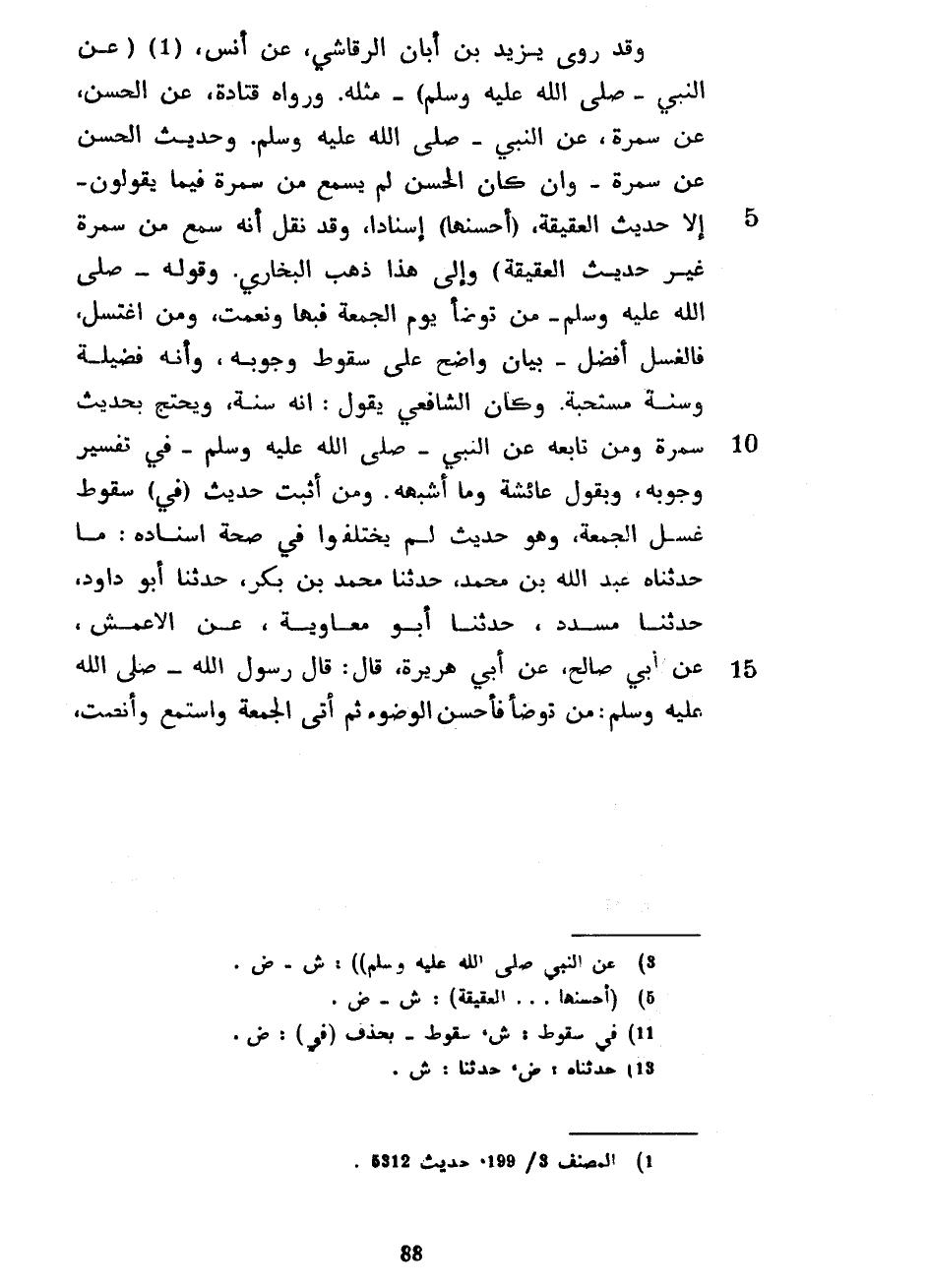 وَقَدْ رَوَى يَزِيدُ بْنُ أَبَانَ الرَّقَاشِيُّ عَنْ أَنَسٍ (عَنِ النَّبِيِّ صَلَّى اللَّهُ عَلَيْهِ وَسَلَّمَ) مِثْلَهُ وَرَوَاهُ قَتَادَةُ عَنِ الْحَسَنِ عَنْ سَمُرَةَ عَنِ النَّبِيِّ صَلَّى اللَّهُ عَلَيْهِ وَسَلَّمَ وَحَدِيثُ الْحَسَنِ عَنْ سَمُرَةَ وَإِنْ كَانَ الْحَسَنُ لَمْ يَسْمَعْ مِنْ سَمُرَةَ فِيمَا يَقُولُونَ إِلَّا حَدِيثَ الْعَقِيقَةِ (أَحْسَنُهَا) إِسْنَادًا وَقَدْ نُقِلَ أَنَّهُ سَمِعَ مِنْ سَمُرَةَ غَيْرَ حَدِيثِ الْعَقِيقَةِ) وَإِلَى هَذَا ذَهَبَ الْبُخَارِيُّ وَقَوْلُهُ صَلَّى اللَّهُ عَلَيْهِ وَسَلَّمَ مَنْ تَوَضَّأَ يَوْمَ الْجُمُعَةِ فَبِهَا وَنِعْمَتْ وَمَنِ اغْتَسَلَ فَالْغُسْلُ أَفْضَلُ بَيَانٌ وَاضِحٌ عَلَى سُقُوطِ وُجُوبِهِ وَأَنَّهُ فَضِيلَةٌ وَسُنَّةٌ مُسْتَحَبَّةٌ وَكَانَ الشَّافِعِيُّ يَقُولُ إِنَّهُ سُنَّةٌ وَيَحْتَجُّ بِحَدِيثِ سَمُرَةَ وَمَنْ تَابَعَهُ عَنِ النَّبِيِّ صَلَّى اللَّهُ عَلَيْهِ وَسَلَّمَ فِي تَفْسِيرِ وُجُوبِهِ وَبِقَوْلِ عَائِشَةَ وَمَا أَشْبَهَهُ وَمَنْ أَثْبَتِ حَدِيثٍ (فِي) سُقُوطِ غُسْلِ الْجُمُعَةِ وَهُوَ حَدِيثٌ لَمْ يَخْتَلِفُوا فِي صِحَّةِ إِسْنَادِهِ مَا حَدَّثَنَاهُ عَبْدُ اللَّهِ بْنُ مُحَمَّدٍ حَدَّثَنَا مُحَمَّدُ بْنُ بَكْرٍ حَدَّثَنَا أَبُو دَاوُدَ حَدَّثَنَا مُسَدَّدٌ حَدَّثَنَا أَبُو مُعَاوِيَةَ عَنِ الْأَعْمَشِ عَنْ أَبِي صَالِحٍ عَنْ أَبِي هُرَيْرَةَ قَالَ قَالَ رَسُولُ اللَّهِ صَلَّى اللَّهُ عَلَيْهِ وَسَلَّمَ مَنْ تَوَضَّأَ فَأَحْسَنَ الْوُضُوءَ ثُمَّ أَتَى الْجُمُعَةَ وَاسْتَمَعَ وأنصت