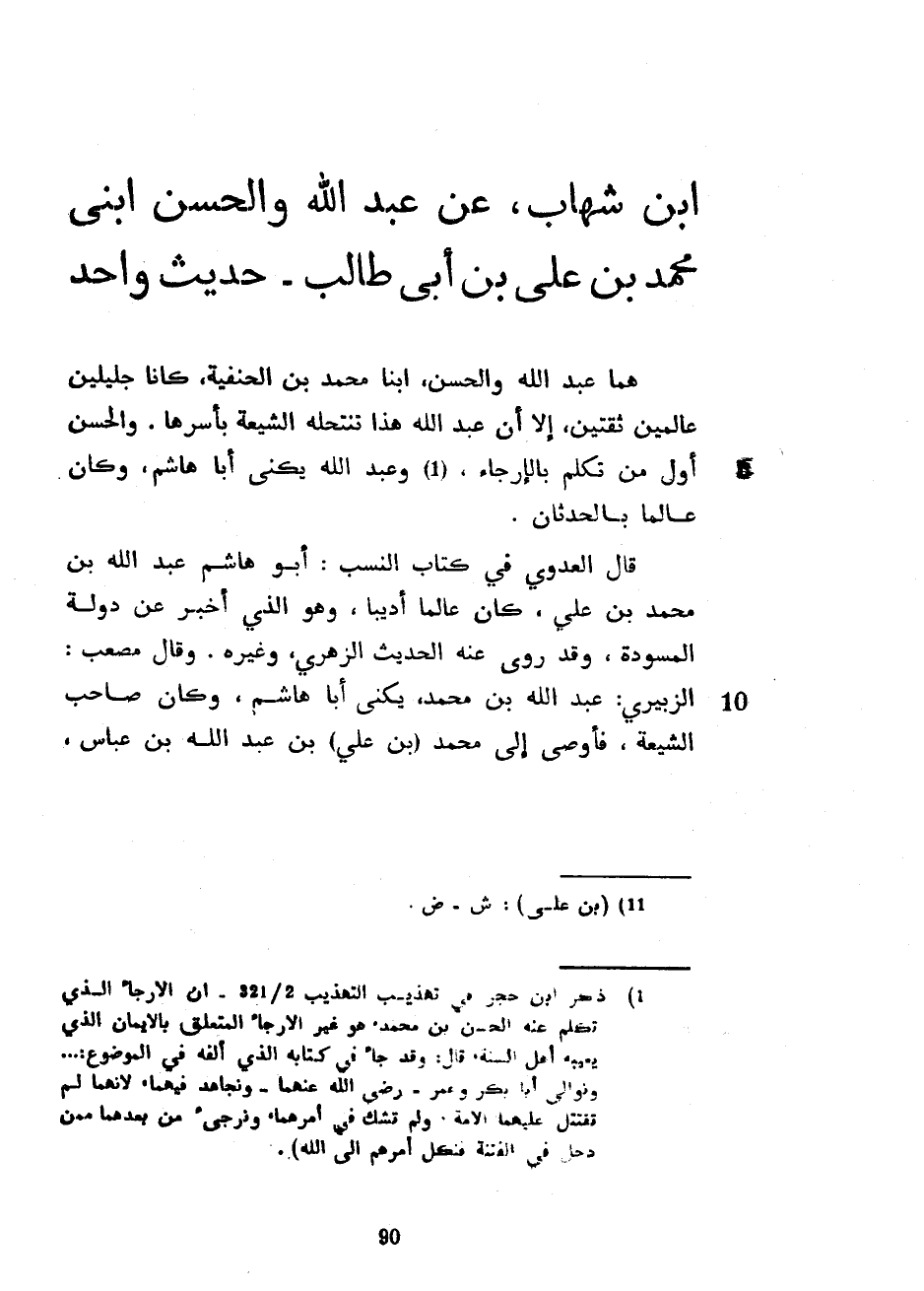 ابن شهاب عن عبد الله والحسن ابني مُحَمَّدِ بْنِ عَلِيِّ بْنِ أَبِي طَالِبٍ حَدِيثٌ وَاحِدٌ هُمَا عَبْدُ اللَّهِ وَالْحَسَنُ ابْنَا مُحَمَّدِ بْنِ الْحَنَفِيَّةِ كَانَا جَلِيلَيْنِ عَالِمَيْنِ ثِقَتَيْنِ إِلَّا أَنَّ عَبْدَ اللَّهِ هَذَا تَنْتَحِلُهُ الشِّيعَةُ بِأَسْرِهَا وَالْحَسَنُ أَوَّلُ مَنْ تَكَلَّمَ بِالْإِرْجَاءِ وَعَبْدُ اللَّهِ يُكَنَّى أَبَا هَاشِمٍ وَكَانَ عَالِمًا بِالْحَدَثَانِ قَالَ الْعَدَوِيُّ فِي كِتَابِ النَّسَبِ أَبُو هَاشِمٍ عَبْدُ اللَّهِ بْنُ مُحَمَّدِ بْنِ عَلِيٍّ كَانَ عَالِمًا أَدِيبًا وَهُوَ الَّذِي أَخْبَرَ عَنْ دَوْلَةِ الْمُسَوَّدَةِ وَقَدْ رَوَى عَنْهُ الْحَدِيثَ الزُّهْرِيُّ وَغَيْرُهُ وَقَالَ مُصْعَبٌ الزُّبَيْرِيُّ عَبْدُ اللَّهِ بْنُ مُحَمَّدٍ يُكَنَّى أَبَا هَاشِمٍ وَكَانَ صَاحِبُ الشِّيعَةِ فَأَوْصَى إِلَى مُحَمَّدِ (بْنِ عَلِيِّ) بْنِ عَبْدِ اللَّهِ بْنِ عباس