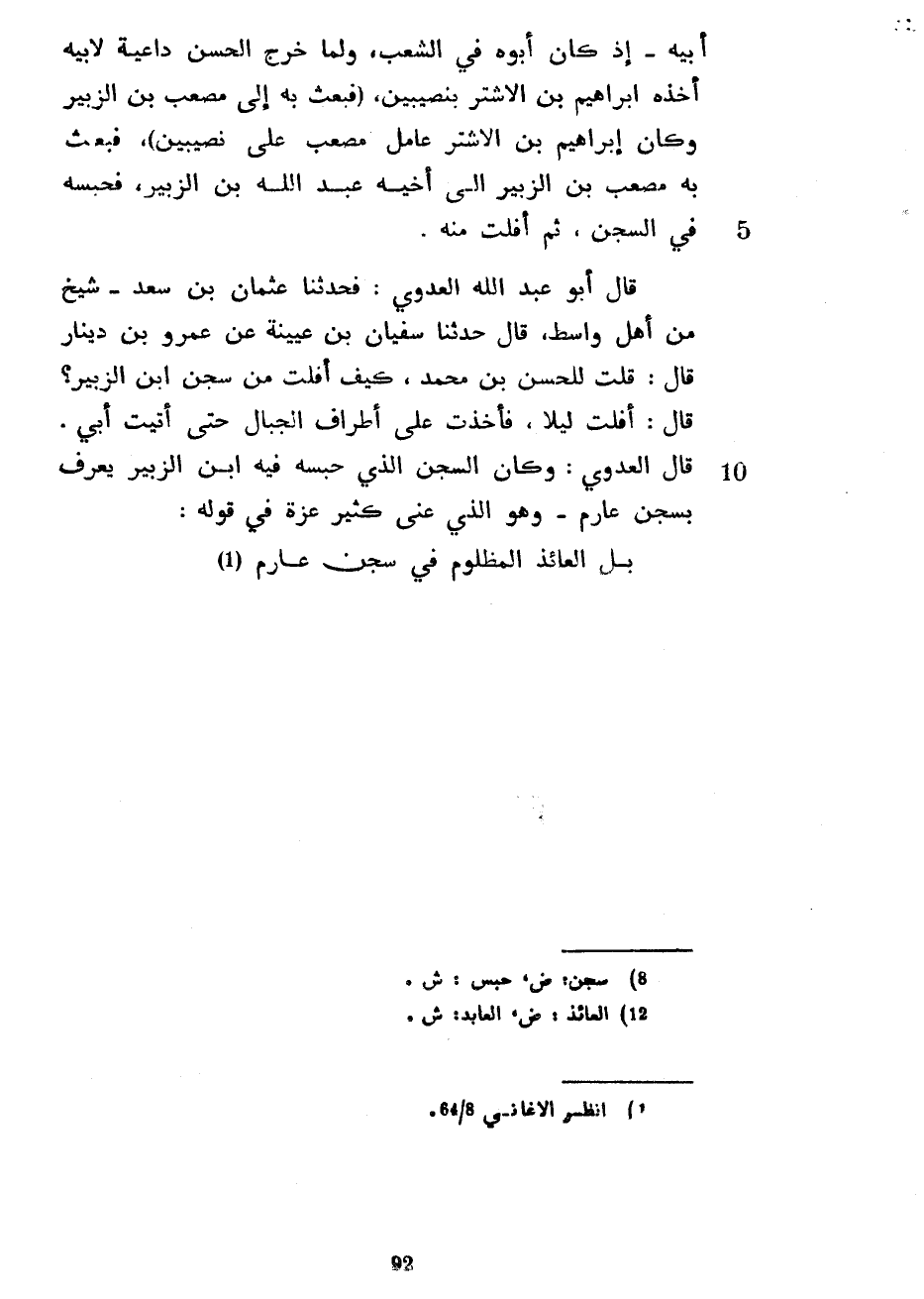 أَبِيهِ إِذْ كَانَ أَبُوهُ فِي الشِّعْبِ وَلَمَّا خَرَجَ الْحَسَنُ دَاعِيَةً لِأَبِيهِ أَخَذَهُ إِبْرَاهِيمُ بْنُ الْأَشْتَرِ بِنَصِيبِينَ (فَبَعَثَ بِهِ إِلَى مُصْعَبِ بْنِ الزُّبَيْرِ وَكَانَ إِبْرَاهِيمُ بْنُ الْأَشْتَرِ عَامِلَ مُصْعَبٍ عَلَى نَصِيبِينَ) فَبَعَثَ بِهِ مُصْعَبُ بْنُ الزُّبَيْرِ إِلَى أَخِيهِ عَبْدِ اللَّهِ بْنِ الزُّبَيْرِ فَحَبَسَهُ فِي السِّجْنِ ثُمَّ أَفْلَتَ مِنْهُ قَالَ أَبُو عَبْدِ اللَّهِ الْعَدَوِيُّ فَحَدَّثَنَا عُثْمَانُ بْنُ سَعْدٍ شَيْخٌ مِنْ أَهْلِ وَاسِطٍ قَالَ حَدَّثَنَا سُفْيَانُ بْنُ عُيَيْنَةَ عَنْ عَمْرِو بْنِ دِينَارٍ قَالَ قُلْتُ لِلْحَسَنِ بْنِ مُحَمَّدٍ كَيْفَ أَفْلَتَّ مِنْ سِجْنِ ابْنِ الزُّبَيْرِ قَالَ أَفْلَتُّ لَيْلًا فَأَخَذْتُ عَلَى أَطْرَافِ الْجِبَالِ حَتَّى أَتَيْتُ أَبِي قَالَ الْعَدَوِيُّ وَكَانَ السِّجْنُ الَّذِي حَبَسَهُ فِيهِ ابْنُ الزُّبَيْرِ يُعْرَفُ بِسِجْنِ عَارِمٍ وَهُوَ الَّذِي عَنَى كُثَيِّرُ عَزَّةَ فِي قَوْلِهِ ... بَلِ الْعَائِذُ الْمَظْلُومُ فِي سِجْنِ عَارِمٍ