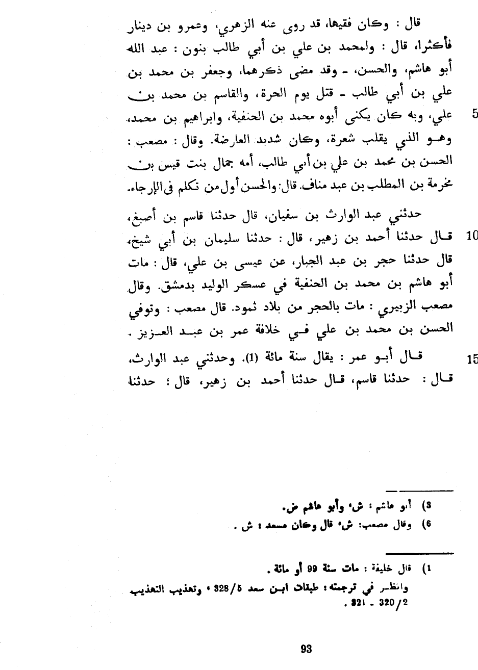 قَالَ وَكَانَ فَقِيهًا قَدْ رَوَى عَنْهُ الزُّهْرِيُّ وَعَمْرُو بْنُ دِينَارٍ فَأَكْثَرَا قَالَ وَلِمُحَمَّدِ بْنِ عَلِيِّ بْنِ أَبِي طَالِبٍ بِنُونٍ عَبْدُ اللَّهِ أَبُو هَاشِمٍ وَالْحَسَنُ وَقَدْ مَضَى ذِكْرُهُمَا وَجَعْفَرُ بن محمد بن علي بن أبي طالب قُتِلَ يَوْمَ الْحَرَّةِ وَالْقَاسِمُ بْنُ مُحَمَّدِ بْنِ عَلِيٍّ وَبِهِ كَانَ يُكَنَّى أَبُوهُ مُحَمَّدُ بْنُ الحنفية وإبراهيم بن محمد وهو الذي يقلب شَعْرَةً وَكَانَ شَدِيدَ الْعَارِضَةِ وَقَالَ مُصْعَبٌ الْحَسَنُ بن محمد بن علي بن أبي طالب أَمُّهُ جَمَالُ بِنْتُ قَيْسِ بْنِ مَخْرَمَةَ بْنِ الْمُطَّلِبِ بْنِ عَبْدِ مَنَافٍ قَالَ وَالْحَسَنُ أَوَّلُ مَنْ تَكَلَّمَ فِي الْإِرْجَاءِ حَدَّثَنِي عَبْدُ الْوَارِثِ بْنُ سُفْيَانَ قَالَ حَدَّثَنَا قَاسِمُ بْنُ أَصْبَغَ قَالَ حَدَّثَنَا أَحْمَدُ بْنُ زُهَيْرٍ قَالَ حَدَّثَنَا سُلَيْمَانُ بْنُ أَبِي شَيْخٍ قَالَ حَدَّثَنَا حُجْرُ بْنُ عَبْدِ الْجَبَّارِ عَنْ عِيسَى بْنِ عَلِيٍّ قَالَ مَاتَ أَبُو هَاشِمِ بْنُ مُحَمَّدِ بْنِ الْحَنَفِيَّةِ فِي عَسْكَرِ الْوَلِيدِ بِدِمَشْقَ وَقَالَ مُصْعَبٌ الزُّبَيْرِيُّ مَاتَ بِالْحِجْرِ مِنْ بِلَادِ ثَمُودَ قَالَ مُصْعَبٌ وَتُوُفِّيَ الْحَسَنُ بْنُ مُحَمَّدِ بْنِ عَلِيٍّ فِي خِلَافَةِ عُمَرَ بْنِ عَبْدِ الْعَزِيزِ قَالَ أَبُو عُمَرَ يُقَالُ سَنَةُ مِائَةٍ وَحَدَّثَنِي عَبْدُ الْوَارِثِ قَالَ حَدَّثَنَا قَاسِمٌ قَالَ حَدَّثَنَا أَحْمَدُ بْنُ زُهَيْرٍ قَالَ حَدَّثَنَا