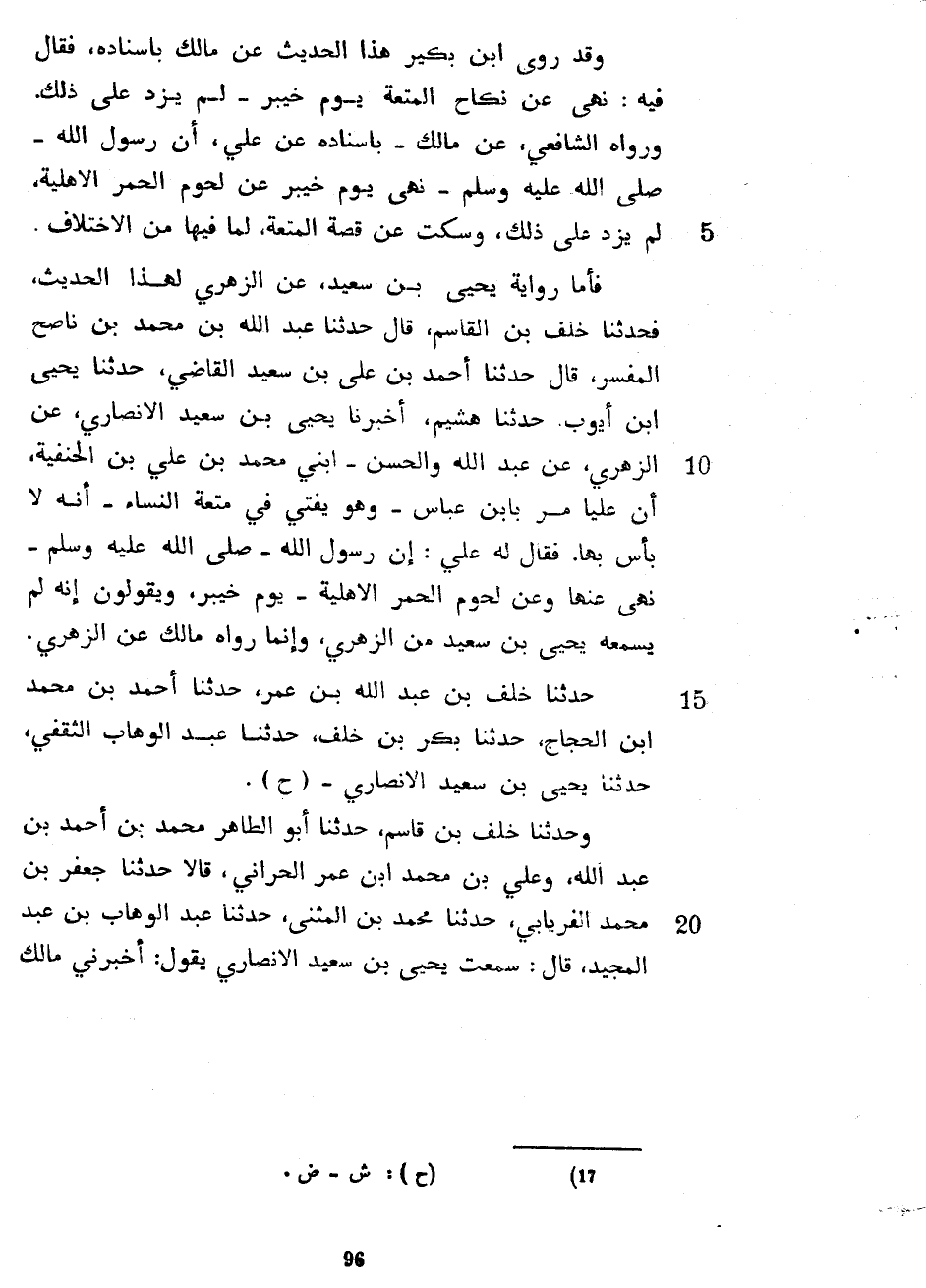 وقد روى ابن بكير هذا عَنْ مَالِكٍ بِإِسْنَادِهِ فَقَالَ فِيهِ نَهَى عَنْ نِكَاحِ الْمُتْعَةِ يَوْمَ خَيْبَرَ لَمْ يَزِدْ عَلَى ذَلِكَ وَرَوَاهُ الشَّافِعِيُّ عَنْ مَالِكٍ بِإِسْنَادِهِ عَنْ عَلَى أَنَّ رَسُولَ اللَّهِ صَلَّى اللَّهُ عَلَيْهِ وَسَلَّمَ نَهَى يَوْمَ خَيْبَرَ عَنْ لُحُومِ الْحُمُرِ الْأَهْلِيَّةِ لَمْ يَزِدْ عَلَى ذَلِكَ وَسَكَتَ عَنْ قِصَّةِ الْمُتْعَةِ لِمَا فِيهَا مِنَ الِاخْتِلَافِ فَأَمَّا رِوَايَةُ يَحْيَى بْنِ سَعِيدٍ عَنِ الزُّهْرِيِّ لِهَذَا الْحَدِيثِ فَحَدَّثَنَا خَلَفُ بْنُ الْقَاسِمِ قَالَ حَدَّثَنَا عَبْدُ اللَّهِ بْنُ مُحَمَّدِ بْنِ نَاصِحٍ الْمُفَسِّرُ قَالَ حَدَّثَنَا أَحْمَدُ بْنُ عَلِيِّ بْنِ سَعِيدٍ الْقَاضِي حَدَّثَنَا يَحْيَى بْنُ أَيُّوبَ حَدَّثَنَا هُشَيْمٌ أَخْبَرَنَا يَحْيَى بْنُ سَعِيدٍ الْأَنْصَارِيُّ عَنِ الزُّهْرِيِّ عَنْ عَبْدِ اللَّهِ وَالْحَسَنِ ابْنَيْ مُحَمَّدِ بْنِ عَلِيِّ بْنِ الْحَنَفِيَّةِ أَنَّ عَلِيًّا مَرَّ بِابْنِ عَبَّاسٍ وَهُوَ يُفْتِي فِي مُتْعَةِ النِّسَاءِ أَنَّهُ لَا بَأْسَ بِهَا فَقَالَ لَهُ عَلَى أَنَّ رَسُولَ اللَّهِ صَلَّى اللَّهُ عَلَيْهِ وسلم نهى عَنْهَا وَعَنْ لُحُومِ الْحُمُرِ الْأَهْلِيَّةِ يَوْمَ خَيْبَرَ وَيَقُولُونَ إِنَّهُ لَمْ يَسْمَعْهُ يَحْيَى بْنُ سَعِيدٍ مِنَ الزُّهْرِيِّ وَإِنَّمَا رَوَاهُ مَالِكٌ عَنِ الزُّهْرِيِّ حَدَّثَنَا خَلَفُ بْنُ عَبْدِ اللَّهِ بْنِ عُمَرَ حَدَّثَنَا أَحْمَدُ بْنُ مُحَمَّدِ بْنِ الْحَجَّاجِ حَدَّثَنَا بَكْرُ بْنُ خَلَفٍ حَدَّثَنَا عَبْدُ الْوَهَّابِ الثَّقَفِيُّ حدثنا يحيى بن سعيد الأنصاري وَحَدَّثَنَا خَلَفُ بْنُ قَاسِمٍ حَدَّثَنَا أَبُو الطَّاهِرِ مُحَمَّدَ بْنَ أَحْمَدَ بْنِ عَبْدِ اللَّهِ وَعَلِيُّ بْنُ مُحَمَّدِ بْنِ عُمَرَ الْحَرَّانِيُّ قَالَا حَدَّثَنَا جَعْفَرُ بْنُ مُحَمَّدٍ الْفِرْيَابِيُّ حَدَّثَنَا مُحَمَّدُ بْنُ الْمُثَنَّى حَدَّثَنَا عَبْدُ الْوَهَّابِ بْنُ عَبْدِ الْمَجِيدِ قَالَ سَمِعْتُ يَحْيَى بْنَ سَعِيدٍ الْأَنْصَارِيَّ يَقُولُ أخبرني مالك