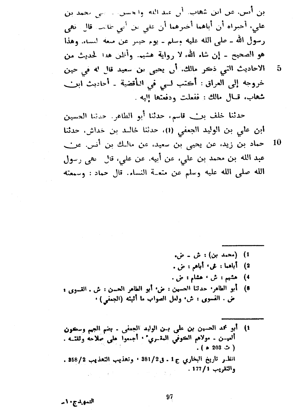 بْنُ أَنَسٍ عَنِ ابْنِ شِهَابٍ أَنَّ عَبْدَ اللَّهِ وَالْحَسَنَ ابْنَيْ مُحَمَّدِ بْنِ عَلِيٍّ أَخْبَرَاهُ أَنَّ أَبَاهُمَا أَخْبَرَهُمَا أَنَّ عَلِيَّ بْنَ أَبِي طَالِبٍ قَالَ نَهَى رَسُولُ اللَّهِ صَلَّى اللَّهُ عَلَيْهِ وَسَلَّمَ يَوْمَ خَيْبَرَ عَنْ مُتْعَةِ النِّسَاءِ وَهَذَا هُوَ الصَّحِيحُ إِنْ شَاءَ اللَّهُ لَا رِوَايَةُ هُشَيْمٍ وَأَظُنُّ هَذَا الْحَدِيثَ مِنَ الْأَحَادِيثِ الَّتِي ذَكَرَ مَالِكٌ أَنَّ يَحْيَى بْنَ سَعِيدٍ قَالَ لَهُ فِي حِينِ خُرُوجِهِ إِلَى الْعِرَاقِ اكْتُبْ لِي فِي الْأَقْضِيَةِ أَحَادِيثَ ابْنِ شِهَابٍ قَالَ مَالِكٌ فَفَعَلْتُ وَدَفَعْتُهَا إِلَيْهِ حَدَّثَنَا خَلَفُ بْنُ قَاسِمٍ حَدَّثَنَا أَبُو الطَّاهِرِ حَدَّثَنَا الْحُسَيْنُ بْنُ عَلِيِّ بْنِ الْوَلِيدِ الْجُعْفِيُّ حَدَّثَنَا خَالِدُ بْنُ خِدَاشٍ حَدَّثَنَا حَمَّادُ بْنُ زَيْدٍ عَنْ يَحْيَى بْنِ سَعِيدٍ عَنْ مَالِكِ بْنِ أَنَسٍ عَنْ عَبْدِ اللَّهِ بْنِ مُحَمَّدِ بْنِ عَلِيٍّ عَنْ أَبِيهِ عَنْ عَلِيٍّ قَالَ نَهَى رَسُولُ اللَّهِ صَلَّى اللَّهُ عَلَيْهِ وَسَلَّمَ عَنْ مُتْعَةِ النِّسَاءِ قَالَ حَمَّادٌ وَسَمِعْتُهُ