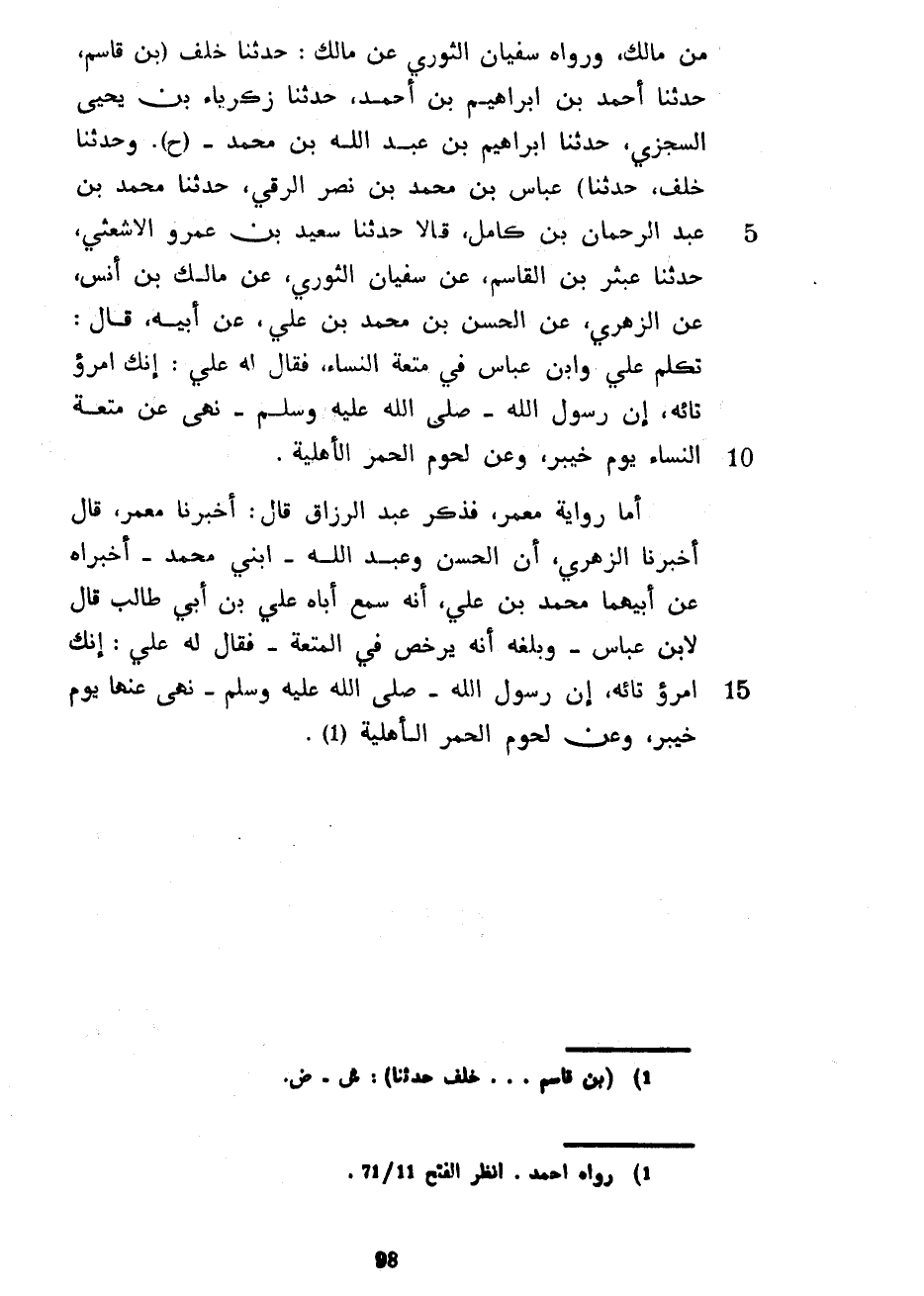 مِنْ مَالِكٍ وَرَوَاهُ سُفْيَانُ الثَّوْرِيُّ عَنْ مَالِكٍ حَدَّثَنَا خَلَفُ (بْنُ قَاسِمٍ حَدَّثَنَا أَحْمَدُ بْنُ إِبْرَاهِيمَ بْنِ أَحْمَدَ حَدَّثَنَا زَكَرِيَّاءُ بْنُ يَحْيَى السِّجْزِيُّ حَدَّثَنَا إِبْرَاهِيمُ بْنُ عَبْدِ اللَّهِ بْنِ مُحَمَّدٍ (ح) وَحَدَّثَنَا خَلَفٌ حَدَّثَنَا) عَبَّاسُ بْنُ مُحَمَّدِ بْنِ نَصْرٍ الرَّقِّيُّ حَدَّثَنَا مُحَمَّدُ بْنُ عبد الرحمان بْنِ كَامِلٍ قَالَا حَدَّثَنَا سَعِيدُ بْنُ عَمْرٍو الْأَشْعَثِيُّ حَدَّثَنَا عَبْثَرُ بْنُ الْقَاسِمِ عَنْ سُفْيَانَ الثَّوْرِيِّ عَنْ مَالِكِ بْنِ أَنَسٍ عَنِ الزُّهْرِيِّ عَنْ الْحَسَنِ بْنِ مُحَمَّدِ بْنِ عَلِيٍّ عَنْ أَبِيهِ قَالَ تَكَلَّمَ عَلِيٌّ وَابْنُ عَبَّاسٍ فِي مُتْعَةِ النِّسَاءِ فَقَالَ لَهُ عَلِيٌّ إِنَّكَ امْرُؤٌ تَائِهٌ إِنَّ رَسُولَ اللَّهِ صَلَّى اللَّهُ عَلَيْهِ وَسَلَّمَ نَهَى عَنْ مُتْعَةِ النِّسَاءِ يَوْمَ خَيْبَرَ وَعَنْ لُحُومِ الْحُمُرِ الْأَهْلِيَّةِ أَمَّا رِوَايَةُ مَعْمَرٍ فَذَكَرَ عَبْدُ الرَّزَّاقِ قَالَ أَخْبَرَنَا مَعْمَرٌ قَالَ أَخْبَرَنَا الزُّهْرِيُّ أَنَّ الْحَسَنَ وَعَبْدَ اللَّهِ ابْنَيْ مُحَمَّدٍ أَخْبَرَاهُ عَنْ أَبِيهِمَا مُحَمَّدِ بْنِ عَلِيٍّ أَنَّهُ سَمِعَ أَبَاهُ عَلِيَّ بْنَ أَبِي طَالِبٍ قَالَ لِابْنِ عَبَّاسٍ وَبَلَغَهُ أَنَّهُ يُرَخِّصُ فِي الْمُتْعَةِ فَقَالَ لَهُ عَلِيٌّ إِنَّكَ امْرُؤٌ تَائِهٌ أن رسول الله صلى الله عليه وسلم نَهَى عَنْهَا يَوْمَ خَيْبَرَ وَعَنْ لُحُومِ الْحُمُرِ الأهلية