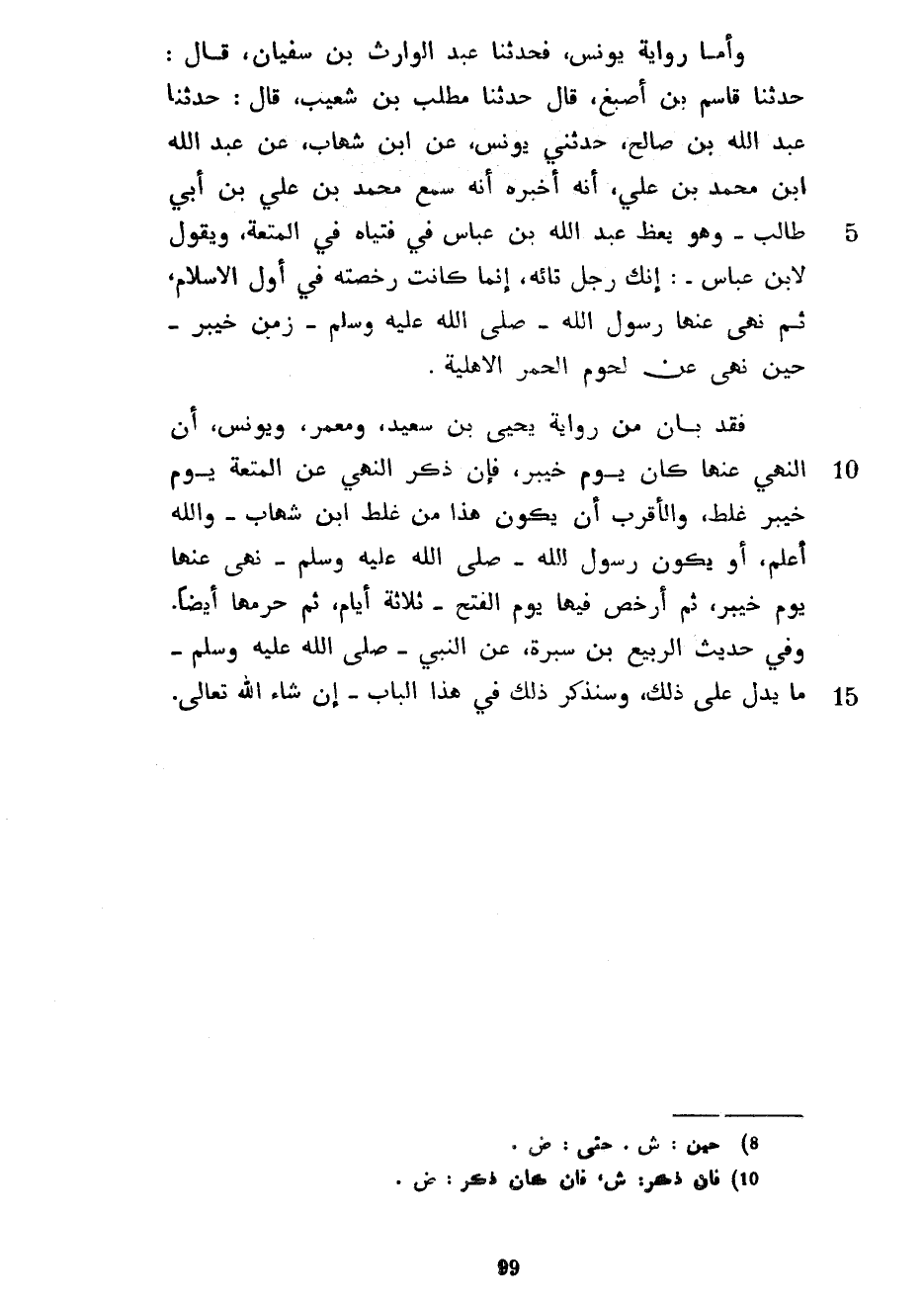 وَأَمَّا رِوَايَةُ يُونُسَ فَحَدَّثَنَا عَبْدُ الْوَارِثِ بْنُ سُفْيَانَ قَالَ حَدَّثَنَا قَاسِمُ بْنُ أَصْبَغَ قَالَ حَدَّثَنَا مُطَّلِبُ بْنُ شُعَيْبٍ قَالَ حَدَّثَنَا عَبْدُ اللَّهِ بْنُ صَالِحٍ حَدَّثَنِي يُونُسُ عَنِ ابْنِ شِهَابٍ عَنْ عَبْدِ اللَّهِ بْنِ مُحَمَّدِ بْنِ عَلِيٍّ أَنَّهُ أَخْبَرَهُ أَنَّهُ سَمِعَ مُحَمَّدَ بْنَ عَلِيِّ بْنِ أَبِي طَالِبٍ وَهُوَ يَعِظُ عَبْدَ اللَّهِ بْنَ عَبَّاسٍ فِي فُتْيَاهُ فِي الْمُتْعَةِ وَيَقُولُ لِابْنِ عَبَّاسٍ إِنَّكَ رَجُلٌ تَائِهٌ إِنَّمَا كَانَتْ رُخْصَتُهُ فِي أَوَّلِ الْإِسْلَامِ ثُمَّ نَهَى عَنْهَا رَسُولَ اللَّهِ صَلَّى اللَّهُ عَلَيْهِ وَسَلَّمَ زَمَنَ خَيْبَرَ حِينَ نَهَى عَنْ لُحُومِ الْحُمُرِ الْأَهْلِيَّةِ فَقَدْ بَانَ مِنْ رِوَايَةِ يَحْيَى بْنِ سَعِيدٍ وَمَعْمَرٍ وَيُونُسَ أَنَّ النَّهْيَ عَنْهَا كَانَ يَوْمَ خَيْبَرَ فَإِنَّ ذِكْرَ النَّهْيِ عَنِ الْمُتْعَةِ يَوْمَ خَيْبَرَ غَلَطٌ وَالْأَقْرَبُ أَنْ يَكُونَ هَذَا مِنْ غَلَطِ ابْنِ شِهَابٍ وَاللَّهُ أَعْلَمُ أَوْ يَكُونَ رَسُولُ اللَّهِ صَلَّى اللَّهُ عَلَيْهِ وَسَلَّمَ نَهَى عَنْهَا يَوْمَ خَيْبَرَ ثُمَّ أَرْخَصَ فِيهَا يَوْمَ الْفَتْحِ ثَلَاثَةَ أَيَّامٍ ثُمَّ حَرَّمَهَا أَيْضًا وَفِي حَدِيثِ الرَّبِيعِ بْنِ سَبْرَةَ عَنِ النَّبِيِّ صَلَّى اللَّهُ عَلَيْهِ وَسَلَّمَ مَا يَدُلُّ عَلَى ذَلِكَ وَسَنَذْكُرُ ذَلِكَ فِي هَذَا الْبَابِ إِنْ شَاءَ اللَّهُ تَعَالَى