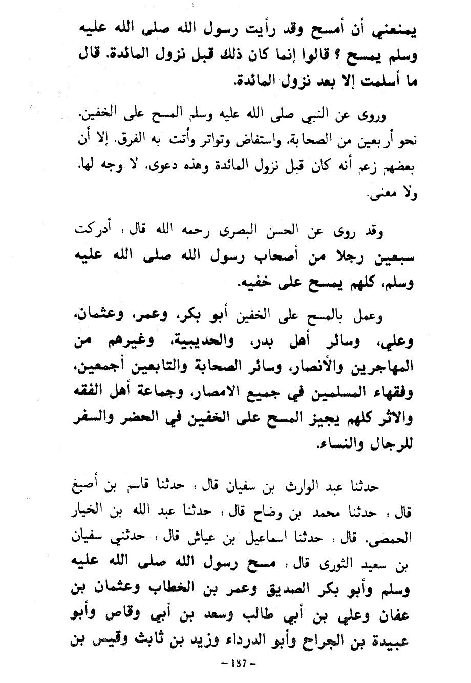 يَمْنَعُنِي أَنْ أَمْسَحَ وَقَدْ رَأَيْتُ رَسُولَ اللَّهِ صَلَّى اللَّهُ عَلَيْهِ وَسَلَّمَ يَمْسَحُ قَالُوا إِنَّمَا كَانَ ذَلِكَ قَبْلَ نُزُولِ الْمَائِدَةِ قَالَ مَا أَسْلَمْتُ إِلَّا بَعْدَ نُزُولِ الْمَائِدَةِ وَرُوِيَ عَنِ النَّبِيِّ صَلَّى اللَّهُ عَلَيْهِ وَسَلَّمَ الْمَسْحَ عَلَى الْخُفَّيْنِ نَحْوُ أَرْبَعِينَ مِنَ الصَّحَابَةِ وَاسْتَفَاضَ وَتَوَاتَرَ وَأَتَتْ بِهِ الْفِرَقُ إِلَّا أَنَّ بَعْضَهُمْ زَعَمَ أَنَّهُ كَانَ قَبْلَ نُزُولِ الْمَائِدَةِ وَهَذِهِ دَعْوَى لَا وَجْهَ لَهَا وَلَا مَعْنًى وَقَدْ رُوِيَ عَنِ الْحَسَنِ الْبَصْرِيِّ رَحِمَهُ اللَّهُ قَالَ أَدْرَكْتُ سَبْعِينَ رَجُلًا مِنْ أَصْحَابِ رَسُولِ اللَّهِ صَلَّى اللَّهُ عَلَيْهِ وَسَلَّمَ كُلُّهُمْ يَمْسَحُ عَلَى خُفَّيْهِ وَعَمِلَ بِالْمَسْحِ عَلَى الْخُفَّيْنِ أَبُو بَكْرٍ وَعُمَرُ وَعُثْمَانُ وَعَلِيٌّ وَسَائِرُ أَهْلِ بَدْرٍ وَالْحُدَيْبِيَةِ وَغَيْرُهُمْ مِنَ الْمُهَاجِرِينَ وَالْأَنْصَارِ وَسَائِرِ الصَّحَابَةِ وَالتَّابِعِينَ أَجْمَعِينَ وَفُقَهَاءِ الْمُسْلِمِينَ فِي جَمِيعِ الْأَمْصَارِ وَجَمَاعَةِ أَهْلِ الْفِقْهِ وَالْأَثَرِ كُلُّهُمْ يُجِيزُ الْمَسْحَ عَلَى الْخُفَّيْنِ فِي الْحَضَرِ وَالسَّفَرِ لِلرِّجَالِ وَالنِّسَاءِ حَدَّثَنَا عَبْدُ الْوَارِثِ بْنُ سُفْيَانَ قَالَ حَدَّثَنَا قَاسِمُ بْنُ أَصْبَغَ قَالَ حَدَّثَنَا مُحَمَّدُ بْنُ وَضَّاحٍ قَالَ حَدَّثَنَا عَبْدُ اللَّهِ بْنُ الْخِيَارِ الْحِمْصِيُّ قَالَ حَدَّثَنَا إِسْمَاعِيلُ بْنُ عَيَّاشٍ قَالَ حَدَّثَنِي سُفْيَانُ بْنُ سَعِيدٍ الثَّوْرِيُّ قَالَ مَسَحَ رَسُولُ اللَّهِ صَلَّى اللَّهُ عَلَيْهِ وَسَلَّمَ وَأَبُو بَكْرٍ الصِّدِّيقُ وَعُمَرُ بْنُ الْخَطَّابِ وَعُثْمَانُ بْنُ عَفَّانَ وَعَلِيُّ بْنُ أَبِي طَالِبٍ وَسَعْدُ بْنُ أَبِي وَقَّاصٍ وَأَبُو عُبَيْدَةَ بْنُ الْجَرَّاحِ وَأَبُو الدَّرْدَاءِ وَزَيْدُ بْنُ ثَابِتٍ وَقَيْسُ بْنُ