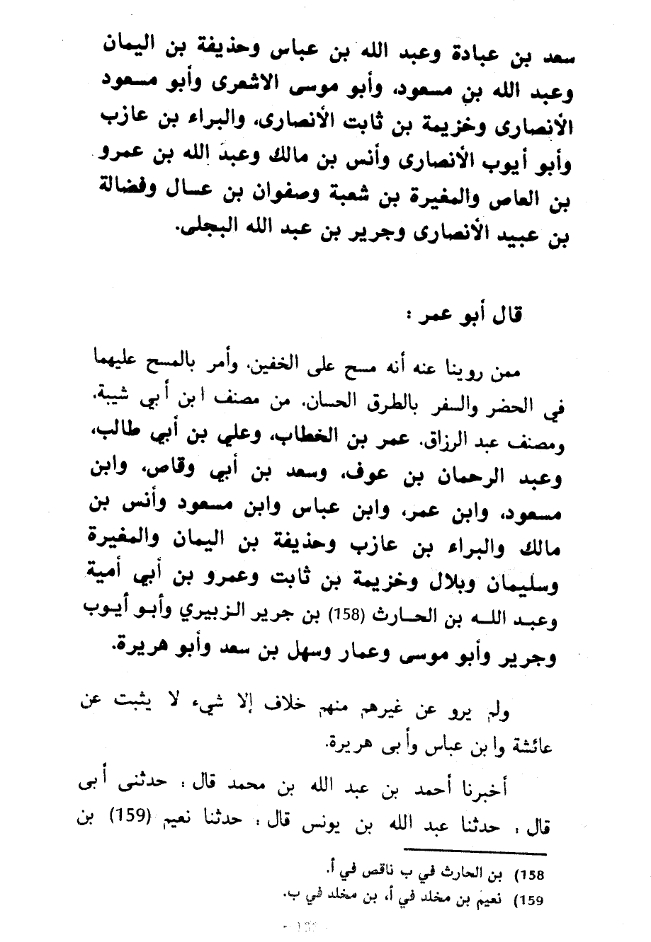 سَعْدِ بْنِ عُبَادَةَ وَعَبْدُ اللَّهِ بْنُ عَبَّاسٍ وَحُذَيْفَةُ بْنُ الْيَمَانِ وَعَبْدُ اللَّهِ بْنُ مَسْعُودٍ وَأَبُو مُوسَى الْأَشْعَرِيُّ وَأَبُو مَسْعُودٍ الْأَنْصَارِيُّ وَخُزَيْمَةُ بْنُ ثَابِتٍ الْأَنْصَارِيُّ وَالْبَرَاءُ بْنُ عَازِبٍ وَأَبُو أَيُّوبَ الْأَنْصَارِيُّ وَأَنَسُ بْنُ مَالِكٍ وَعَبْدُ اللَّهِ بْنُ عَمْرِو بْنِ الْعَاصِ وَالْمُغِيرَةُ بْنُ شُعْبَةَ وَصَفْوَانُ بْنُ عَسَّالٍ وَفَضَالَةُ بْنُ عُبَيْدٍ الْأَنْصَارِيُّ وَجَرِيرُ بْنُ عَبْدِ اللَّهِ الْبَجَلِيُّ قَالَ أَبُو عُمَرَ مِمَّنْ رُوِّينَا عَنْهُ أَنَّهُ مَسَحَ عَلَى الْخُفَّيْنِ وَأَمَرَ بِالْمَسْحِ عَلَيْهِمَا فِي الْحَضَرِ وَالسَّفَرِ بِالطُّرُقِ الْحِسَانِ مِنْ مُصَنَّفِ ابْنِ أَبِي شَيْبَةَ وَمُصَنَّفِ عَبْدِ الرَّزَّاقِ عُمَرَ بْنِ الْخَطَّابِ وَعَلِيِّ بْنِ أَبِي طَالِبٍ وعبد الرحمان بْنُ عَوْفٍ وَسَعْدُ بْنُ أَبِي وَقَّاصٍ وَابْنُ مسعود وابن عمر وابن عباس وابن مسعود وَأَنَسُ بْنُ مَالِكٍ وَالْبَرَاءُ بْنُ عَازِبٍ وَحُذَيْفَةُ بْنُ الْيَمَانِ وَالْمُغِيرَةُ وَسُلَيْمَانُ وَبِلَالٌ وَخُزَيْمَةُ بْنُ ثَابِتٍ وَعَمْرُو بْنُ أَبِي أُمَيَّةَ وَعَبْدُ اللَّهِ بْنُ الْحَارِثِ بْنِ جَرِيرٍ الزُّبَيْرِيُّ وَأَبُو أَيُّوبَ وَجَرِيرٌ وَأَبُو مُوسَى وَعَمَّارٌ وَسَهْلُ بْنُ سَعْدٍ وَأَبُو هُرَيْرَةَ وَلَمْ يُرْوَ عَنْ غَيْرِهِمْ مِنْهُمْ خِلَافٌ إِلَّا شَيْءٌ لَا يَثْبُتُ عَنْ عَائِشَةَ وَابْنِ عَبَّاسٍ وَأَبِي هُرَيْرَةَ أَخْبَرَنَا أَحْمَدُ بْنُ عَبْدِ اللَّهِ بْنِ مُحَمَّدِ قَالَ حَدَّثَنِي أَبِي قَالَ حَدَّثَنَا عَبْدُ اللَّهِ بْنُ يُونُسَ قَالَ حَدَّثَنَا نُعَيْمُ بْنُ