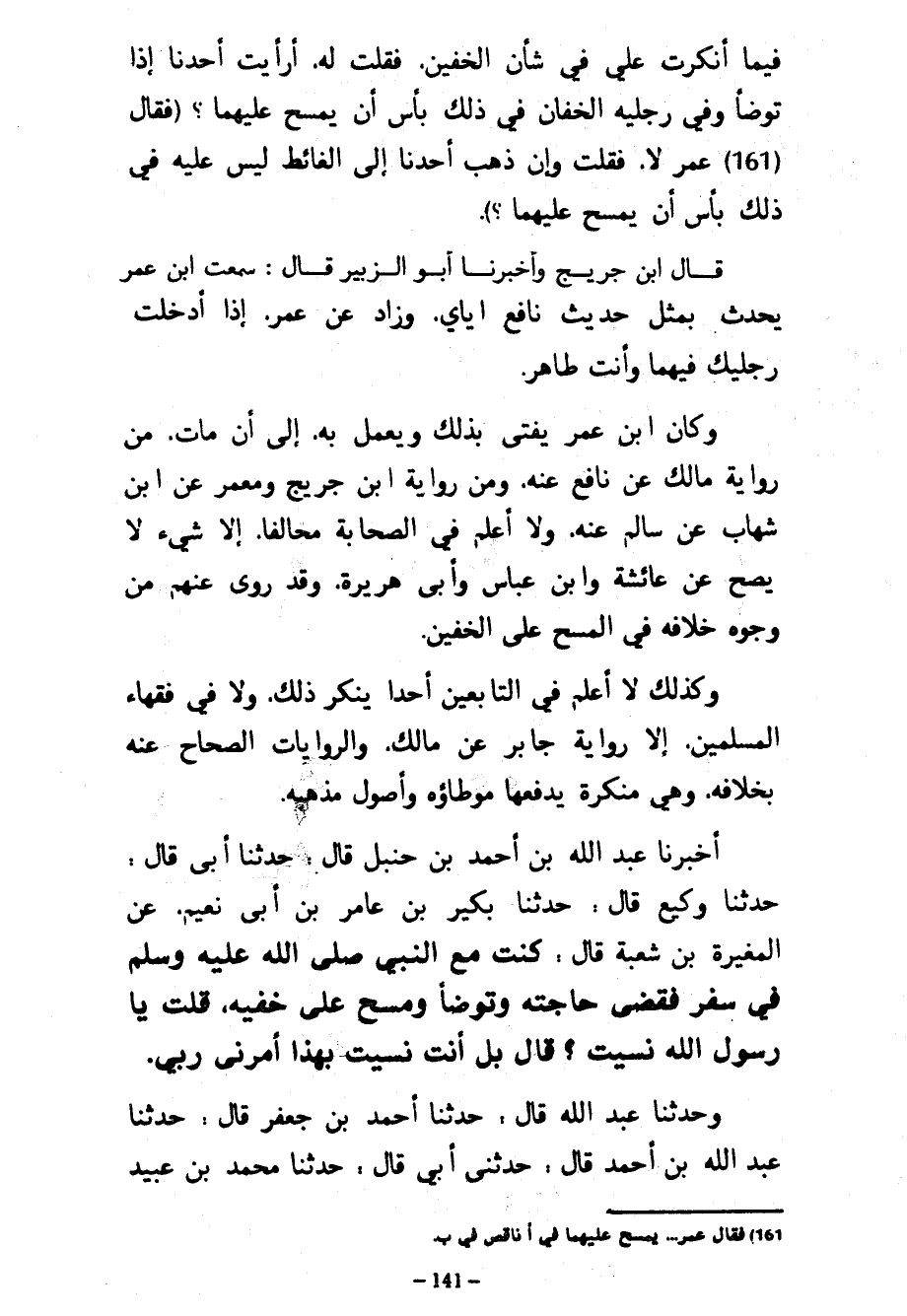 فِيمَا أَنْكَرْتَ عَلَيَّ فِي شَأْنِ الْخُفَّيْنِ فَقُلْتُ لَهُ أَرَأَيْتَ أَحَدَنَا إِذَا تَوَضَّأَ وَفِي رِجْلَيْهِ الْخُفَّانِ فِي ذَلِكَ بَأْسٌ أَنْ يَمْسَحَ عَلَيْهِمَا (فَقَالَ (161) عُمَرُ لَا فَقُلْتُ وَإِنْ ذَهَبَ أَحَدُنَا إِلَى الْغَائِطِ لَيْسَ عَلَيْهِ فِي ذَلِكَ بَأْسٌ أَنْ يَمْسَحَ عَلَيْهِمَا) قَالَ ابْنُ جُرَيْجٍ وَأَخْبَرَنَا أَبُو الزُّبَيْرِ قَالَ سَمِعْتُ ابْنَ عُمَرَ يُحَدِّثُ بِمِثْلِ حَدِيثِ نَافِعٍ إِيَّايَ وَزَادَ عَنْ عُمَرَ إِذَا أَدْخَلْتَ رِجْلَيْكَ فِيهِمَا وَأَنْتَ طَاهِرٌ وَكَانَ ابْنُ عُمَرَ يُفْتِي بِذَلِكَ وَيَعْمَلُ بِهِ إِلَى أَنْ مَاتَ مِنْ رِوَايَةِ مَالِكٍ عَنْ نَافِعٍ عَنْهُ وَمِنْ رِوَايَةِ ابْنِ جُرَيْجٍ وَمَعْمَرٍ عَنِ ابْنِ شِهَابٍ عَنْ سَالِمٍ عَنْهُ وَلَا أَعْلَمُ فِي الصَّحَابَةِ مُخَالِفًا إِلَّا شَيْءٌ لَا يَصِحُّ عَنْ عَائِشَةَ وَابْنِ عَبَّاسٍ وَأَبِي هُرَيْرَةَ وَقَدْ رُوِيَ عَنْهُمْ مِنْ وُجُوهٍ خِلَافُهُ فِي الْمَسْحِ عَلَى الْخُفَّيْنِ وَكَذَلِكَ لَا أَعْلَمُ فِي التَّابِعِينَ أَحَدًا يُنْكِرُ ذَلِكَ وَلَا فِي فُقَهَاءِ الْمُسْلِمِينَ إِلَّا رِوَايَةَ جَابِرٍ عَنْ مَالِكٍ وَالرِّوَايَاتُ الصِّحَاحُ عَنْهُ بِخِلَافِهِ وَهِيَ مُنْكَرَةٌ يَدْفَعُهَا مُوَطَّؤُهُ وَأُصُولُ مَذْهَبِهِ أَخْبَرَنَا عَبْدُ اللَّهِ بْنُ أَحْمَدَ بْنِ حَنْبَلٍ قَالَ حَدَّثَنَا أَبِي قَالَ حَدَّثَنَا وَكِيعٌ قَالَ حَدَّثَنَا بُكَيْرُ بْنُ عَامِرِ بْنِ أَبِي نُعَيْمٍ عَنِ الْمُغِيرَةِ بْنِ شُعْبَةَ قَالَ كُنْتُ مَعَ النَّبِيِّ صَلَّى اللَّهُ عَلَيْهِ وَسَلَّمَ فِي سَفَرٍ فَقَضَى حَاجَتَهُ وَتَوَضَّأَ وَمَسَحَ عَلَى خُفَّيْهِ قَلْتُ يَا رَسُولَ اللَّهِ نَسِيتَ قَالَ بَلْ أَنْتَ نَسِيتَ بِهَذَا أَمَرَنِي رَبِّي وَحَدَّثَنَا عَبْدِ اللَّهِ قَالَ حَدَّثَنَا أَحْمَدُ بْنُ جَعْفَرٍ قَالَ حَدَّثَنَا عَبْدُ اللَّهِ بْنُ أَحْمَدَ قَالَ حَدَّثَنِي أَبِي قَالَ حَدَّثَنَا مُحَمَّدُ بْنُ عُبَيْدٍ
