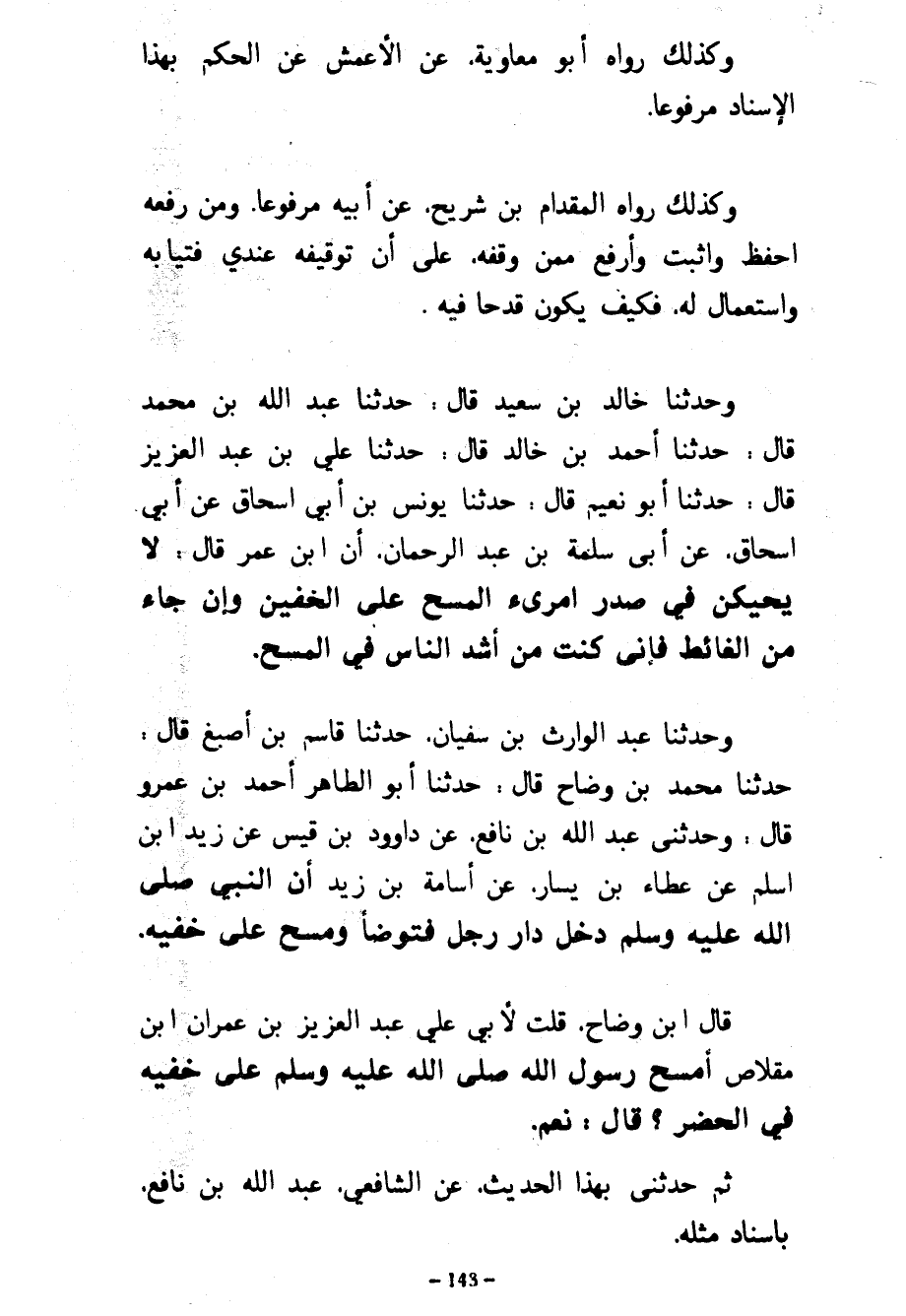 وَكَذَلِكَ رَوَاهُ أَبُو مُعَاوِيَةَ عَنِ الْأَعْمَشِ عَنِ الْحَكَمِ بِهَذَا الْإِسْنَادِ مَرْفُوعًا وَكَذَلِكَ رَوَاهُ الْمِقْدَامُ بْنُ شُرَيْحٍ عَنْ أَبِيهِ مَرْفُوعًا وَمَنْ رَفَعَهُ أَحْفَظُ وَأَثْبَتُ وَأَرْفَعُ مِمَّنْ وَقَفَهُ عَلَى أَنَّ تَوْقِيفَهُ عِنْدِي فُتْيَا بِهِ وَاسْتِعْمَالٌ لَهُ فَكَيْفَ يَكُونُ قَدْحًا فِيهِ وَحَدَّثَنَا خَالِدُ بْنُ سَعِيدٍ قَالَ حَدَّثَنَا عَبْدُ اللَّهِ بْنُ مُحَمَّدٍ قَالَ حَدَّثَنَا أَحْمَدُ بْنُ خَالِدٍ قَالَ حَدَّثَنَا عَلِيُّ بْنُ عَبْدِ الْعَزِيزِ قَالَ حَدَّثَنَا أَبُو نُعَيْمٍ قَالَ حَدَّثَنَا يُونُسُ بْنُ أَبِي إِسْحَاقَ عَنْ أَبِي إِسْحَاقَ عَنْ أَبِي سَلَمَةَ بْنِ عَبْدِ الرحمان أَنَّ ابْنَ عُمَرَ قَالَ لَا يُحِيكَنَّ فِي صَدْرِ امْرِئٍ الْمَسْحُ عَلَى الْخُفَّيْنِ وَإِنْ جَاءَ مِنَ الْغَائِطِ فَإِنِّي كُنْتُ مِنْ أَشَدِّ النَّاسِ فِي الْمَسْحِ وَحَدَّثَنَا عَبْدُ الْوَارِثِ بْنُ سُفْيَانَ حَدَّثَنَا قَاسِمُ بْنُ أَصْبَغَ قَالَ حَدَّثَنَا مُحَمَّدُ بْنُ وَضَّاحٍ قَالَ حَدَّثَنَا أَبُو الطَّاهِرِ أَحْمَدُ بْنُ عَمْرٍو قَالَ وَحَدَّثَنِي عَبْدُ اللَّهِ بْنُ نَافِعٍ عَنْ دَاوُدُ بْنُ قَيْسٍ عَنْ زَيْدِ بْنِ أَسْلَمَ عَنْ عَطَاءِ بْنِ يَسَارٍ عَنْ أُسَامَةَ بْنِ زَيْدٍ أَنَّ النَّبِيَّ صَلَّى اللَّهُ عَلَيْهِ وَسَلَّمَ دَخَلَ دَارَ رَجُلٍ فَتَوَضَّأَ وَمَسَحَ عَلَى خُفَّيْهِ قَالَ ابْنُ وَضَّاحٍ قُلْتُ لِأَبِي عَلِيٍّ عَبْدِ الْعَزِيزِ بْنِ عِمْرَانَ بْنِ مِقْلَاصٍ أَمَسَحَ رَسُولُ اللَّهِ صَلَّى اللَّهُ عَلَيْهِ وَسَلَّمَ عَلَى خُفَّيْهِ فِي الْحَضَرِ قَالَ نَعَمْ ثُمَّ حَدَّثَنِي بِهَذَا الْحَدِيثِ عَنِ الشَّافِعِيِّ عَبْدُ اللَّهِ بْنُ نَافِعٍ بِإِسْنَادٍ مِثْلِهِ