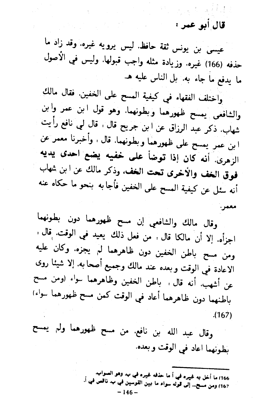 قَالَ أَبُو عُمَرَ عِيسَى بْنُ يُونُسَ ثِقَةٌ حَافِظٌ لَيْسَ يَرْوِيهِ غَيْرُهُ وَقَدْ زَادَ مَا حَذَفَهُ غَيْرُهُ وَزِيَادَةُ مِثْلِهِ وَاجِبٌ قَبُولُهَا وَلَيْسَ فِي الْأُصُولِ مَا يَدْفَعُ مَا جَاءَ بِهِ بل الناس عليه هـ وَاخْتَلَفَ الْفُقَهَاءُ فِي كَيْفِيَّةِ الْمَسْحِ عَلَى الْخُفَّيْنِ فَقَالَ مَالِكٌ وَالشَّافِعِيُّ يَمْسَحُ ظُهُورَهُمَا وَبُطُونَهُمَا وَهُوَ قَوْلُ ابْنِ عُمَرَ وَابْنِ شِهَابٍ ذَكَرَ عَبْدُ الرَّزَّاقِ عَنِ ابْنِ جُرَيْجٍ قَالَ قَالَ لِي نَافِعٌ رَأَيْتُ ابْنَ عُمَرَ يَمْسَحُ عَلَى ظُهُورِهِمَا وَبُطُونِهِمَا قَالَ وَأَخْبَرَنَا مَعْمَرٌ عَنِ الزُّهْرِيِّ أَنَّهُ كَانَ إِذَا تَوَضَّأَ عَلَى خُفَّيْهِ يَضَعُ إِحْدَى يَدَيْهِ فَوْقَ الْخُفِّ وَالْأُخْرَى تَحْتَ الْخُفِّ وَذَكَرَ مَالِكٌ عَنِ ابْنِ شِهَابٍ أَنَّهُ سُئِلَ عَنْ كَيْفِيَّةِ الْمَسْحِ عَلَى الْخُفَّيْنِ فَأَجَابَهُ بِنَحْوِ مَا حَكَاهُ عَنْهُ مَعْمَرٌ وَقَالَ مَالِكٌ وَالشَّافِعِيُّ إِنْ مَسَحَ ظُهُورَهُمَا دُونَ بُطُونِهِمَا أَجَزَأَهُ إِلَّا أَنَّ مَالِكًا قَالَ مَنْ فَعَلَ ذَلِكَ يُعِيدُ فِي الْوَقْتِ قَالَ وَمَنْ مَسَحَ بَاطِنَ الْخُفَّيْنِ دُونَ ظَاهِرِهِمَا لَمْ يُجْزِهُ وَكَانَ عَلَيْهِ الْإِعَادَةُ فِي الْوَقْتِ وَبَعْدَهُ عِنْدَ مَالِكٍ وَجَمِيعِ أَصْحَابِهِ إِلَّا شَيْئًا رُوِيَ عَنْ أَشْهَبَ أَنَّهُ قَالَ بَاطِنُ الْخُفَّيْنِ وَظَاهِرُهُمَا سَوَاءٌ (وَمَنْ مَسَحَ بَاطِنَهُمَا دُونَ ظَاهِرِهِمَا أَعَادَ فِي الْوَقْتِ كَمَنْ مَسَحَ ظُهُورَهُمَا سَوَاءً) وَقَالَ عَبْدُ اللَّهِ بْنُ نَافِعٍ مَنْ مَسَحَ ظُهُورَهُمَا وَلَمْ يَمْسَحْ بُطُونَهُمَا أَعَادَ فِي الوقت وبعده