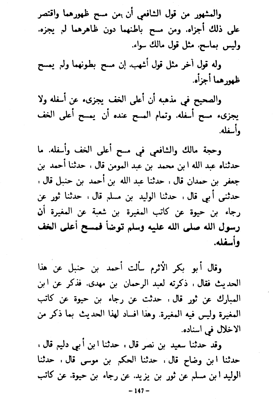 وَالْمَشْهُورُ مِنْ قَوْلِ الشَّافِعِيِّ أَنَّ مَنْ مَسَحَ ظُهُورَهُمَا وَاقْتَصَرَ عَلَى ذَلِكَ أَجَزَأَهُ وَمَنْ مَسَحَ بَاطِنَهُمَا دُونَ ظَاهِرِهِمَا لَمْ يُجْزِهُ وَلَيْسَ بِمَاسِحٍ مِثْلَ قَوْلِ مَالِكٍ سَوَاءً وَلَهُ قَوْلٌ آخَرُ مِثْلُ قَوْلِ أَشْهَبَ إِنْ مَسَحَ بُطُونَهُمَا وَلَمْ يَمْسَحْ ظُهُورَهُمَا أَجَزَأَهُ وَالصَّحِيحُ فِي مَذْهَبِهِ أَنَّ أَعْلَى الْخُفِّ يُجْزِئُ عَنْ أَسْفَلِهِ وَلَا يُجْزِئُ مَسْحُ أَسْفَلِهِ وَتَمَامُ الْمَسْحِ عِنْدَهُ أَنْ يُمْسَحَ أَعْلَى الْخُفِّ وَأَسْفَلُهُ وَحُجَّةُ مَالِكٍ وَالشَّافِعِيِّ فِي مَسْحِ أَعْلَى الْخُفِّ وَأَسْفَلِهِ مَا حَدَّثَنَاهُ عَبْدُ اللَّهِ بْنُ مُحَمَّدِ بْنِ عَبْدِ الْمُؤْمِنِ قَالَ حَدَّثَنَا أَحْمَدُ بْنُ جَعْفَرِ بْنِ حَمْدَانَ قَالَ حَدَّثَنَا عَبْدُ اللَّهِ بْنُ أَحْمَدَ بْنِ حَنْبَلٍ قَالَ حَدَّثَنِي أَبِي قَالَ حَدَّثَنَا الْوَلِيدُ بْنُ مُسْلِمٍ قَالَ حَدَّثَنَا ثَوْرٌ عَنْ رَجَاءِ بْنِ حَيْوَةَ عَنْ كَاتِبِ الْمُغِيرَةِ بْنِ شُعْبَةَ عَنِ الْمُغِيرَةِ أَنَّ رَسُولَ اللَّهِ صَلَّى اللَّهُ عَلَيْهِ وَسَلَّمَ تَوَضَّأَ فَمَسَحَ أَعْلَى الْخُفِّ وَأَسْفَلَهُ وَقَالَ أَبُو بَكْرٍ الْأَثْرَمُ سَأَلْتُ أَحْمَدَ بْنَ حَنْبَلٍ عن هذا الحديث فقال ذكرته لعبد الرحمان بْنِ مَهْدِيٍّ فَذَكَرَ عَنِ ابْنِ الْمُبَارَكِ عَنْ ثَوْرٍ قَالَ حَدَّثْتُ عَنْ رَجَاءِ بْنِ حَيْوَةَ عَنْ كَاتِبِ الْمُغِيرَةِ وَلَيْسَ فِيهِ الْمُغِيرَةُ وَهَذَا إِفْسَادٌ لِهَذَا الْحَدِيثِ بِمَا ذُكِرَ مِنَ الْإِخْلَالِ فِي إِسْنَادِهِ وَقَدْ حَدَّثَنَا سَعِيدُ بْنُ نَصْرٍ قَالَ حَدَّثَنَا ابْنُ أَبِي دُلَيْمٍ قَالَ حَدَّثَنَا ابْنُ وَضَّاحٍ قَالَ حَدَّثَنَا الْحَكَمُ بْنُ مُوسَى قَالَ حَدَّثَنَا الْوَلِيدُ بْنُ مُسْلِمٍ عَنْ ثَوْرِ بْنِ يَزِيدَ عَنْ رَجَاءِ بْنِ حَيْوَةَ عَنْ كَاتِبِ
