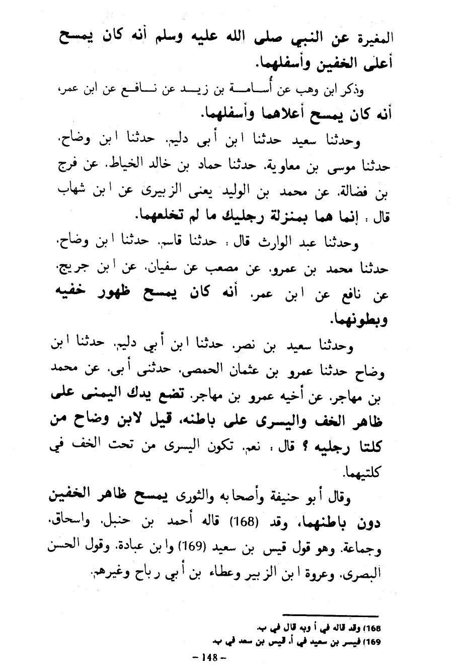الْمُغِيرَةِ عَنِ النَّبِيِّ صَلَّى اللَّهُ عَلَيْهِ وَسَلَّمَ أَنَّهُ كَانَ يَمْسَحُ أَعْلَى الْخُفَّيْنِ وَأَسْفَلَهُمَا وَذَكَرَ ابْنُ وَهْبٍ عَنْ أُسَامَةَ بْنِ زَيْدٍ عَنْ نَافِعٍ عَنِ ابْنِ عُمَرَ أَنَّهُ كَانَ يَمْسَحُ أَعْلَاهُمَا وَأَسْفَلَهُمَا وَحَدَّثَنَا سَعِيدٌ حَدَّثَنَا ابْنُ أَبِي دُلَيْمٍ حَدَّثَنَا ابْنُ وَضَّاحٍ حَدَّثَنَا مُوسَى بْنُ مُعَاوِيَةَ حَدَّثَنَا حَمَّادُ بْنُ خَالِدٍ الْخَيَّاطُ عَنْ فَرَجِ بْنِ فَضَالَةَ عَنْ مُحَمَّدِ بْنِ الْوَلِيدِ يَعْنِي الزُّبَيْرِيَّ عَنِ ابْنِ شِهَابٍ قَالَ إِنَّمَا هُمَا بِمَنْزِلَةِ رِجْلَيْكَ مَا لَمْ تَخْلَعْهُمَا وَحَدَّثَنَا عَبْدُ الْوَارِثِ قَالَ حَدَّثَنَا قَاسِمٌ حَدَّثَنَا ابْنُ وَضَّاحٍ حَدَّثَنَا مُحَمَّدُ بْنُ عَمْرٍو عَنْ مُصْعَبٍ عَنْ سُفْيَانَ عَنِ ابْنِ جُرَيْجٍ عَنْ نَافِعٍ عَنِ ابْنِ عُمَرَ أَنَّهُ كَانَ يَمْسَحُ ظُهُورَ خُفَّيْهِ وَبُطُونَهُمَا وَحَدَّثَنَا سَعِيدُ بْنُ نَصْرٍ حَدَّثَنَا ابْنُ أَبِي دُلَيْمٍ حَدَّثَنَا ابْنُ وَضَّاحٍ حَدَّثَنَا عَمْرُو بْنُ عُثْمَانَ الْحِمْصِيُّ حَدَّثَنِي أَبِي عَنْ مُحَمَّدِ بْنِ مُهَاجِرٍ عَنْ أَخِيهِ عَمْرِو بْنِ مُهَاجِرٍ تَضَعُ يَدَكَ الْيُمْنَى عَلَى ظَاهِرِ الْخُفِّ وَالْيُسْرَى عَلَى بَاطِنِهِ قِيلَ لِابْنِ وَضَّاحٍ مِنْ كِلْتَا رِجْلَيْهِ قَالَ نَعَمْ تَكُونُ الْيُسْرَى مِنْ تَحْتِ الْخُفِّ فِي كِلْتَيْهِمَا وَقَالَ أَبُو حَنِيفَةَ وَأَصْحَابُهُ وَالثَّوْرِيُّ يَمْسَحُ ظَاهِرَ الْخُفَّيْنِ دُونَ بَاطِنِهِمَا وقد قال أَحْمَدُ بْنُ حَنْبَلٍ وَإِسْحَاقُ وَجَمَاعَةٌ وَهُوَ قَوْلُ قَيْسِ بْنِ سَعِيدٍ وَابْنِ عُبَادَةَ وَقَوْلُ الْحَسَنِ الْبَصْرِيِّ وَعُرْوَةَ بْنِ الزُّبَيْرِ وَعَطَاءِ بْنِ أَبِي رباح وغيرهم