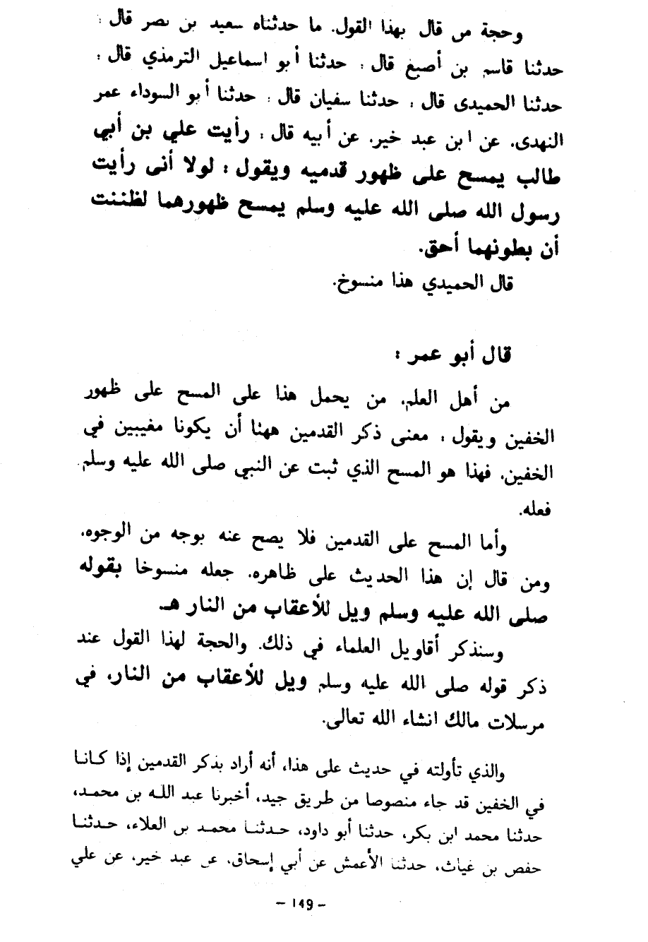 وَحُجَّةُ مَنْ قَالَ بِهَذَا الْقَوْلِ مَا حَدَّثَنَاهُ سَعِيدُ بْنُ نَصْرٍ قَالَ حَدَّثَنَا قَاسِمُ بْنُ أَصْبَغَ قَالَ حَدَّثَنَا أَبُو إِسْمَاعِيلَ التِّرْمِذِيُّ قَالَ حَدَّثَنَا الْحُمَيْدِيُّ قَالَ حَدَّثَنَا سُفْيَانُ قَالَ حَدَّثَنَا أَبُو السَّوْدَاءِ عُمَرُ النَّهْدِيُّ عَنِ ابْنِ عَبْدِ خَيْرٍ عَنْ أَبِيهِ قَالَ رَأَيْتُ عَلِيَّ بْنَ أَبِي طَالِبٍ يَمْسَحُ عَلَى ظُهُورِ قَدَمَيْهِ وَيَقُولُ لَوْلَا إِنِّي رَأَيْتُ رَسُولَ اللَّهِ صَلَّى اللَّهُ عَلَيْهِ وَسَلَّمَ يَمْسَحُ ظُهُورَهُمَا لَظَنَنْتُ أَنَّ بُطُونَهُمَا أَحَقُّ قَالَ الْحُمَيدِيُّ هَذَا مَنْسُوخٌ قَالَ أَبُو عُمَرَ مِنْ أَهْلِ الْعِلْمِ مَنْ يَحْمِلُ هَذَا عَلَى الْمَسْحِ عَلَى ظُهُورِ الْخُفَّيْنِ وَيَقُولُ مَعْنَى ذكر القدمين ههنا أَنْ يَكُونَا مُغَيَّبَيْنِ فِي الْخُفَّيْنِ فَهَذَا هُوَ الْمَسْحُ الَّذِي ثَبَتَ عَنِ النَّبِيِّ صَلَّى اللَّهُ عَلَيْهِ وَسَلَّمَ فِعْلُهُ وَأَمَّا الْمَسْحُ عَلَى الْقَدَمَيْنِ فَلَا يَصِحُّ عَنْهُ بِوَجْهٍ مِنَ الْوُجُوهِ وَمَنْ قَالَ إِنَّ هَذَا الْحَدِيثَ عَلَى ظَاهِرِهِ جَعَلَهُ مَنْسُوخًا بِقَوْلِهِ صَلَّى اللَّهُ عَلَيْهِ وَسَلَّمَ وَيْلٌ لِلْأَعْقَابِ مِنَ النار هـ وَسَنَذْكُرُ أَقَاوِيلَ الْعُلَمَاءِ فِي ذَلِكَ وَالْحُجَّةَ لِهَذَا الْقَوْلِ عِنْدَ ذِكْرِ قَوْلِهِ صَلَّى اللَّهُ عَلَيْهِ وَسَلَّمَ وَيْلٌ لِلْأَعْقَابِ مِنَ النَّارِ فِي مُرْسَلَاتِ مَالِكٍ إِنْ شَاءَ اللَّهُ تَعَالَى وَالَّذِي تَأَوَّلْتُهُ فِي حَدِيثِ عَلِيٍّ هَذَا أَنَّهُ أَرَادَ بِذِكْرِ الْقَدَمَيْنِ إِذَا كَانَا فِي الْخُفَّيْنِ قَدْ جَاءَ مَنْصُوصًا مِنْ طَرِيقٍ جَيِّدٍ أَخْبَرَنَا عَبْدُ اللَّهِ بْنُ مُحَمَّدٍ حَدَّثَنَا مُحَمَّدُ بْنُ بَكْرٍ حَدَّثَنَا أَبُو دَاوُدَ حَدَّثَنَا مُحَمَّدُ بْنُ الْعَلَاءِ حَدَّثَنَا حَفْصُ بْنُ غِيَاثٍ حَدَّثَنَا الْأَعْمَشُ عَنْ أَبِي إِسْحَاقَ عَنْ عَبْدِ خَيْرٍ عَنْ عَلِيٍّ