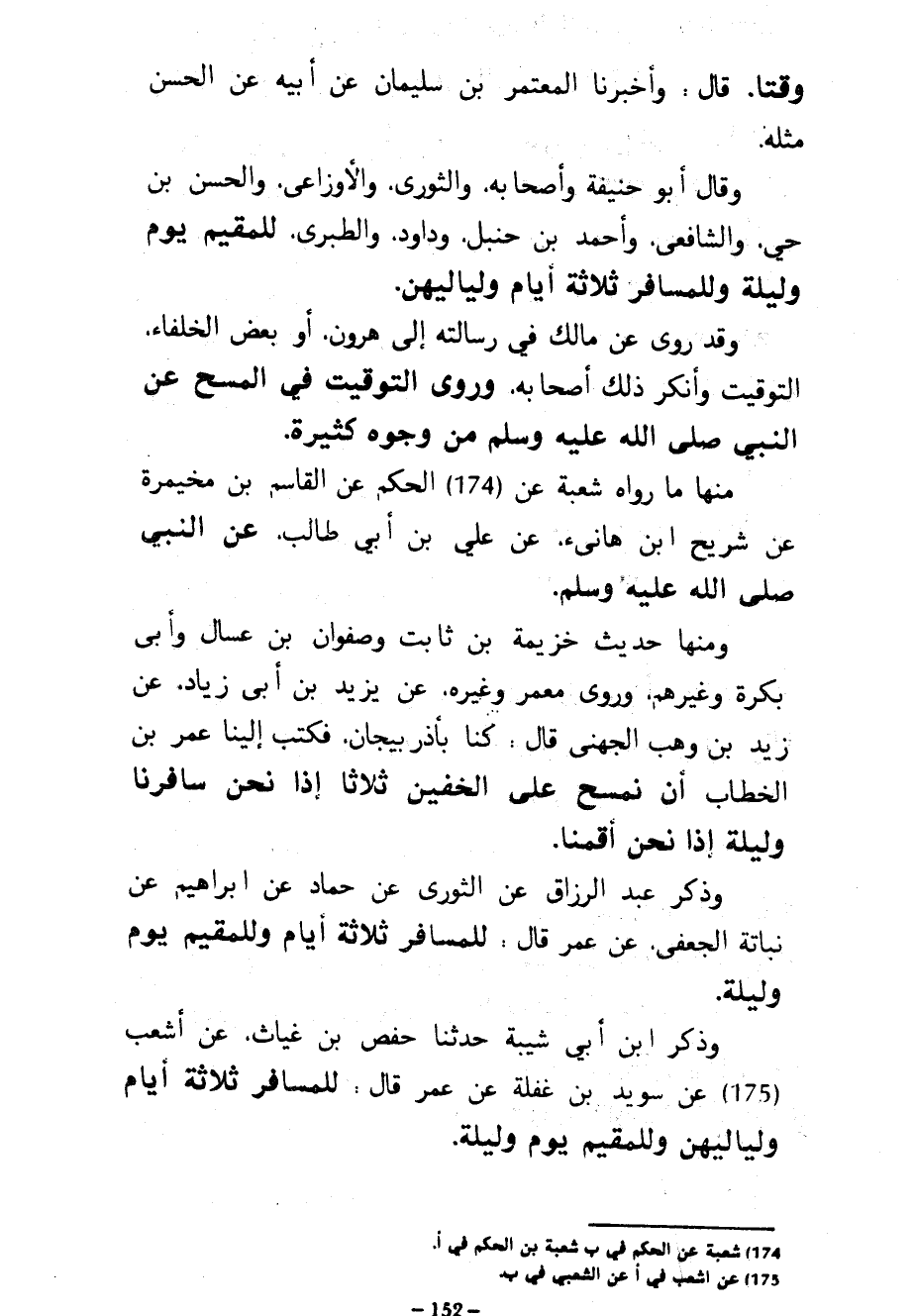 وَقْتًا قَالَ وَأَخْبَرَنَا الْمُعْتَمِرُ بْنُ سُلَيْمَانَ عَنْ أَبِيهِ عَنِ الْحَسَنِ مِثْلَهُ وَقَالَ أَبُو حَنِيفَةَ وَأَصْحَابُهُ وَالثَّوْرِيُّ وَالْأَوْزَاعِيُّ وَالْحُسْنُ بْنُ حَيٍّ وَالشَّافِعِيُّ وَأَحْمَدُ بْنُ حَنْبَلٍ وَدَاوُدُ وَالطَّبَرِيُّ لِلْمُقِيمِ يَوْمٌ وَلَيْلَةٌ وَلِلْمُسَافِرِ ثَلَاثَةُ أَيَّامٍ وَلَيَالِيهِنَّ وَقَدْ رُوِيَ عن مالك في رسالته إلى هرون أَوْ بَعْضِ الْخُلَفَاءِ التَّوْقِيتُ وَأَنْكَرَ ذَلِكَ أَصْحَابُهُ وَرُوِيَ التَّوْقِيتُ فِي الْمَسْحِ عَنِ النَّبِيِّ صَلَّى اللَّهُ عَلَيْهِ وَسَلَّمَ مِنْ وُجُوهٍ كَثِيرَةٍ مِنْهَا مَا رَوَاهُ شُعْبَةُ عَنِ الْحَكَمِ عَنِ الْقَاسِمِ بْنِ مُخَيْمِرَةَ عَنْ شُرَيْحِ بْنِ هَانِئٍ عَنْ عَلِيِّ بْنِ أَبِي طَالِبٍ عَنِ النَّبِيِّ صَلَّى اللَّهُ عَلَيْهِ وَسَلَّمَ وَمِنْهَا حَدِيثُ خُزَيْمَةَ بْنِ ثَابِتٍ وَصَفْوَانَ بْنِ عَسَّالٍ وَأَبِي بَكْرَةَ وَغَيْرِهِمْ وَرَوَى مَعْمَرٌ وَغَيْرُهُ عَنْ يَزِيدَ بْنِ أَبِي زِيَادٍ عَنْ زَيْدِ بْنِ وَهْبٍ الْجُهَنِيِّ قَالَ كُنَّا بِأَذْرَبِيجَانَ فَكَتَبَ إِلَيْنَا عُمَرُ بْنُ الْخَطَّابِ أَنْ نَمْسَحَ عَلَى الْخُفَّيْنِ ثَلَاثًا إِذَا نَحْنُ سَافَرْنَا وَلَيْلَةً إِذَا نَحْنُ أَقَمْنَا وَذَكَرَ عَبْدُ الرَّزَّاقِ عَنِ الثَّوْرِيِّ عَنْ حَمَّادٍ عَنْ إِبْرَاهِيمَ عَنْ نُبَاتَةَ الْجَعْفِيِّ عَنْ عُمَرَ قَالَ لِلْمُسَافِرِ ثَلَاثَةُ أَيَّامٍ وَلِلْمُقِيمِ يَوْمٌ وَلَيْلَةٌ وَذَكَرَ ابْنُ أَبِي شَيْبَةَ حَدَّثَنَا حَفْصُ بْنُ غِيَاثٍ عَنْ أَشْعَبَ عَنْ سُوِيدِ بْنِ غَفَلَةَ عَنْ عُمَرَ قَالَ لِلْمُسَافِرِ ثَلَاثَةُ أَيَّامٍ وَلَيَالِيهِنَّ وَلِلْمُقِيمِ يَوْمٌ وليلة