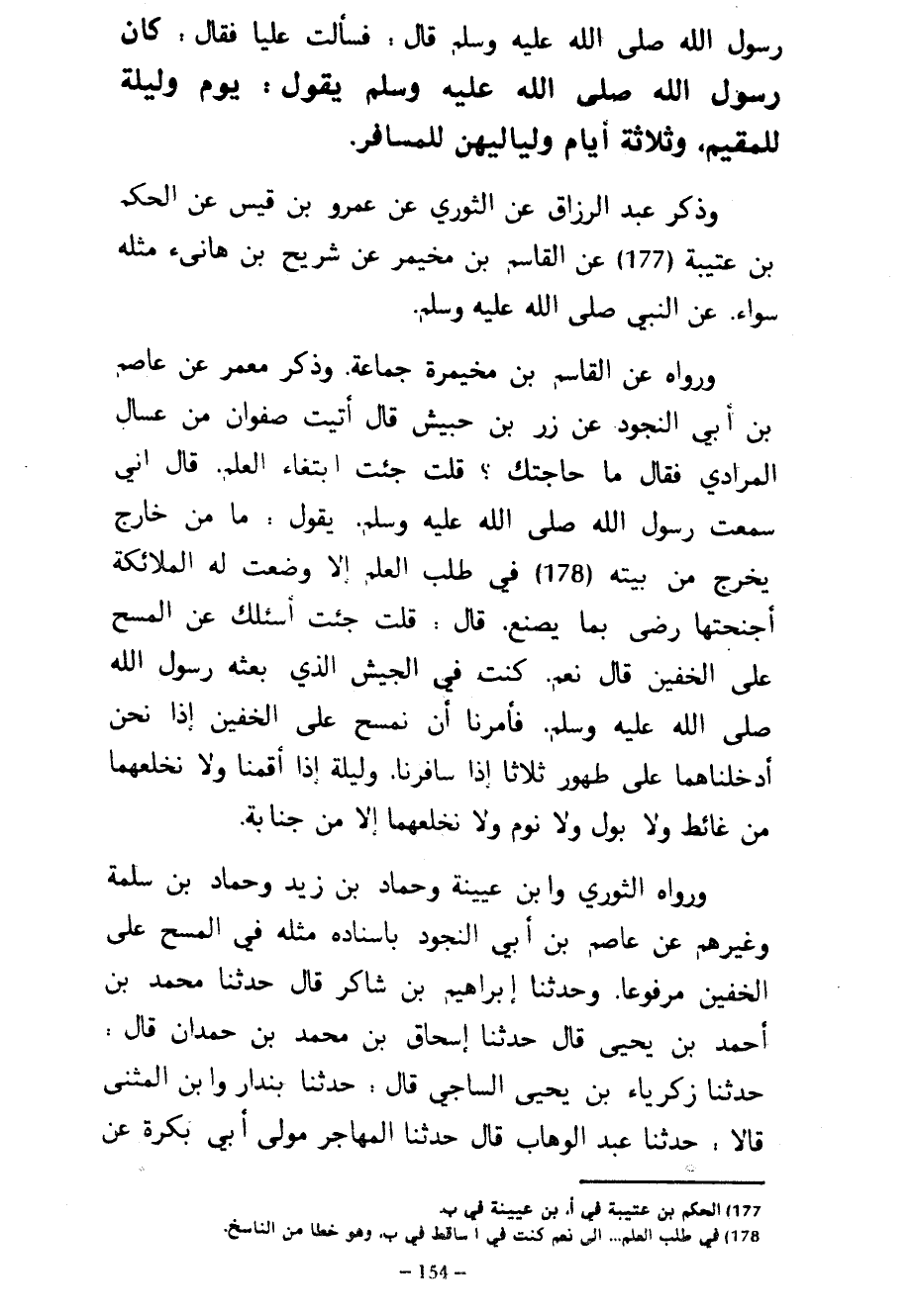 رسول الله صلى الله عليه وسلم قال فَسَأَلْتُ عَلِيًّا فَقَالَ كَانَ رَسُولُ اللَّهِ صَلَّى اللَّهُ عَلَيْهِ وَسَلَّمَ يَقُولُ يَوْمٌ وَلَيْلَةٌ لِلْمُقِيمِ وَثَلَاثَةُ أَيَّامٍ وَلَيَالِيهِنَّ لِلْمُسَافِرِ وَذَكَرَ عَبْدُ الرَّزَّاقِ عَنِ الثَّوْرِيِّ عَنْ عَمْرِو بْنِ قَيْسٍ عَنِ الْحَكَمِ بْنِ عُتَيْبَةَ عَنِ الْقَاسِمِ بْنِ مخيمر عَنْ شُرَيْحِ بْنِ هَانِئٍ مِثْلَهُ سَوَاءً عَنِ النَّبِيِّ صَلَّى اللَّهُ عَلَيْهِ وَسَلَّمَ وَرَوَاهُ عَنِ الْقَاسِمِ بْنِ مُخَيْمِرَةَ جَمَاعَةٌ وَذَكَرَ مَعْمَرٌ عَنْ عَاصِمِ بْنِ أَبِي النَّجُودِ عَنْ زِرِّ بْنِ حبيش قال أتيت صفوان من عَسَّالٍ الْمُرَادِيَّ فَقَالَ مَا حَاجَتُكَ قُلْتُ جِئْتُ ابْتِغَاءَ الْعِلْمِ قَالَ إِنِّي سَمِعْتُ رَسُولَ اللَّهِ صَلَّى اللَّهُ عَلَيْهِ وَسَلَّمَ يَقُولُ مَا مِنْ خَارِجٍ يَخْرُجُ مِنْ بَيْتِهِ فِي طَلَبِ الْعِلْمِ إلا وضعت له الملائكة أجنحتها رضى بِمَا يَصْنَعُ قَالَ قُلْتُ جِئْتُ أَسْأَلُكَ عَنِ الْمَسْحِ عَلَى الْخُفَّيْنِ قَالَ نَعَمْ كُنْتُ فِي الْجَيْشِ الَّذِي بَعَثَهُ رَسُولُ اللَّهِ صَلَّى اللَّهُ عَلَيْهِ وَسَلَّمَ فَأَمَرَنَا أَنْ نَمْسَحَ عَلَى الْخُفَّيْنِ إِذَا نَحْنُ أَدْخَلْنَاهُمَا عَلَى طُهُورٍ ثَلَاثًا إِذَا سَافَرْنَا وَلَيْلَةً إِذَا أَقَمْنَا وَلَا نَخْلَعَهُمَا مِنْ غَائِطٍ وَلَا بَوْلٍ وَلَا نَوْمٍ وَلَا نَخْلَعَهُمَا إِلَّا مِنْ جَنَابَةٍ وَرَوَاهُ الثَّوْرِيُّ وَابْنُ عُيَيْنَةَ وَحَمَّادُ بْنُ زَيْدٍ وَحَمَّادُ بْنُ سَلَمَةَ وَغَيْرُهُمْ عَنْ عَاصِمِ بْنِ أَبِي النَّجُودِ بِإِسْنَادِهِ مِثْلَهُ فِي الْمَسْحِ عَلَى الْخُفَّيْنِ مَرْفُوعًا وَحَدَّثَنَا إِبْرَاهِيمُ بْنُ شَاكِرٍ قَالَ حَدَّثَنَا مُحَمَّدُ بْنُ أَحْمَدَ بْنِ يَحْيَى قَالَ حَدَّثَنَا إِسْحَاقُ بْنُ مُحَمَّدِ بْنِ حَمْدَانَ قَالَ حَدَّثَنَا زَكَرِيَّاءُ بْنُ يَحْيَى السَّاجِيُّ قَالَ حَدَّثَنَا بُنْدَارٌ وَابْنُ الْمُثَنَّى قَالَا حَدَّثَنَا عَبْدُ الْوَهَّابِ قَالَ حَدَّثَنَا الْمُهَاجِرُ مَوْلَى أبي بكرة عن