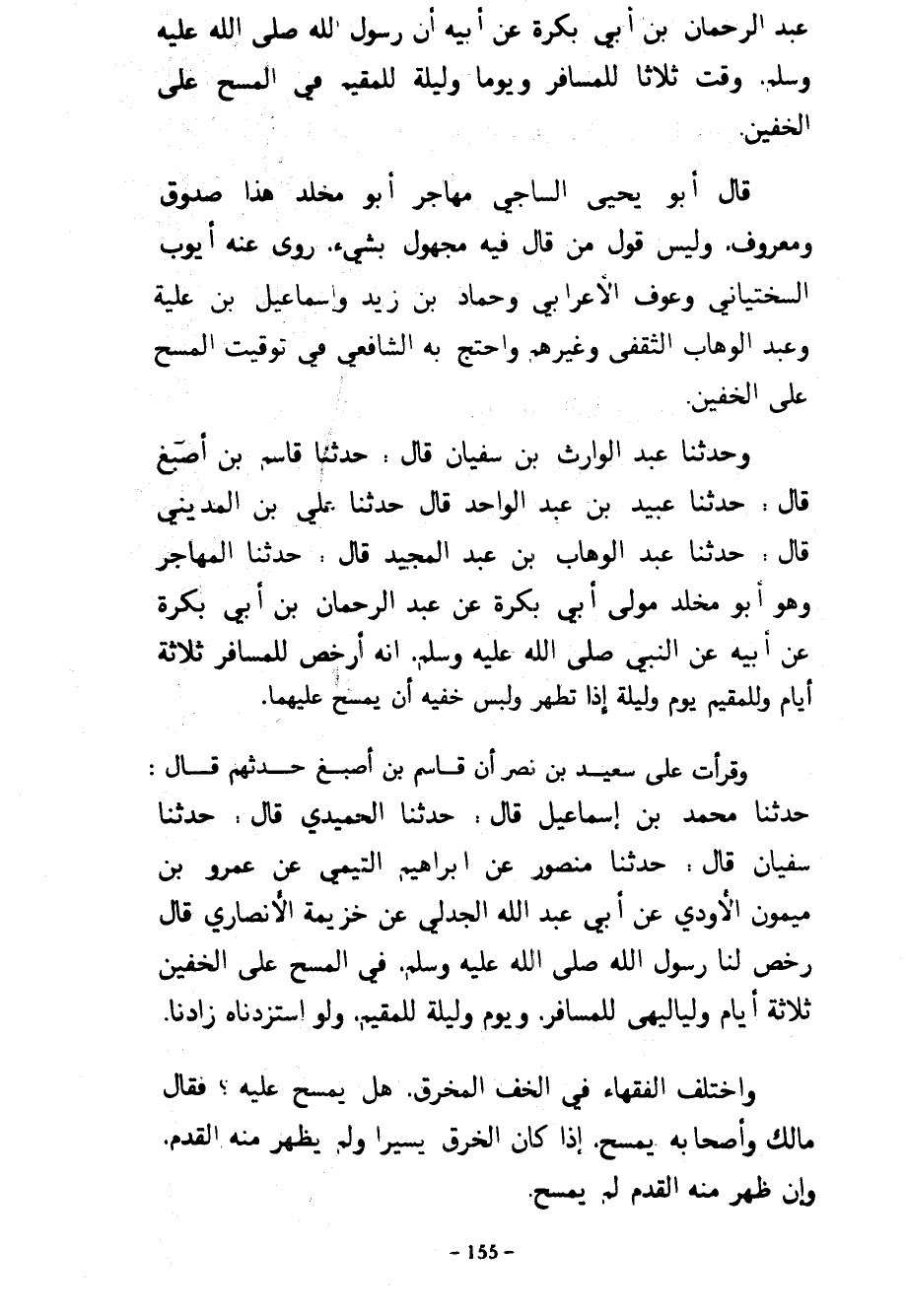 عبد الرحمان بْنِ أَبِي بَكْرَةَ عَنْ أَبِيهِ أَنَّ رَسُولَ اللَّهِ صَلَّى اللَّهُ عَلَيْهِ وَسَلَّمَ وَقَّتَ ثَلَاثًا لِلْمُسَافِرِ وَيَوْمًا وَلَيْلَةً لِلْمُقِيمِ فِي الْمَسْحِ عَلَى الْخُفَّيْنِ قَالَ أَبُو يَحْيَى السَّاجِيُّ مُهَاجِرٌ أَبُو مَخْلَدٍ هَذَا صَدُوقٌ وَمَعْرُوفٌ وَلَيْسَ قَوْلُ مَنْ قَالَ فِيهِ مَجْهُولٌ بِشَيْءٍ رَوَى عَنْهُ أَيُّوبُ السَّخْتِيَانِيُّ وَعَوْفٌ الْأَعْرَابِيُّ وَحَمَّادُ بْنُ زَيْدٍ وَإِسْمَاعِيلُ بْنُ عُلَيَّةَ وَعَبْدُ الْوَهَّابِ الثَّقَفِيُّ وَغَيْرُهُمْ وَاحْتَجَّ بِهِ الشَّافِعِيُّ فِي تَوْقِيتِ الْمَسْحِ عَلَى الْخُفَّيْنِ وَعَبْدُ الْوَارِثِ بْنُ سُفْيَانَ قَالَ حَدَّثَنَا قَاسِمُ بْنُ أَصْبَغَ قَالَ حَدَّثَنَا عُبَيْدُ بْنُ عَبْدِ الْوَاحِدِ قَالَ حَدَّثَنَا عَلِيُّ بْنُ الْمَدِينِيِّ قَالَ حَدَّثَنَا عَبْدُ الْوَهَّابِ بْنُ عَبْدِ الْمَجِيدِ قَالَ حَدَّثَنَا الْمُهَاجِرُ وَهُوَ أَبُو مَخْلَدٍ مَوْلَى أَبِي بكرة عن عبد الرحمان بْنِ أَبِي بَكْرَةَ عَنْ أَبِيهِ عَنِ النَّبِيِّ صَلَّى اللَّهُ عَلَيْهِ وَسَلَّمَ أَنَّهُ أَرْخَصَ لِلْمُسَافِرِ ثلاثة أيام وللمقيم يوم وَلَيْلَةً إِذَا تَطَهَّرَ وَلَبِسَ خُفَّيْهِ أَنْ يَمْسَحَ عَلَيْهِمَا وَقَرَأْتُ عَلَى سَعِيدِ بْنِ نَصْرٍ أَنَّ قَاسِمَ بْنَ أَصْبَغَ حَدَّثَهُمْ قَالَ حَدَّثَنَا مُحَمَّدُ بْنُ إِسْمَاعِيلَ قَالَ حَدَّثَنَا الْحُمَيْدِيُّ قَالَ حَدَّثَنَا سُفْيَانُ قَالَ حَدَّثَنَا مَنْصُورٌ عَنْ إِبْرَاهِيمَ التَّيْمِيِّ عَنْ عَمْرِو بْنِ مَيْمُونٍ الْأَوْدِيِّ عَنْ أَبِي عَبْدِ اللَّهِ الْجَدَلِيِّ عَنْ خُزَيْمَةَ الْأَنْصَارِيِّ قَالَ رَخَّصَ لَنَا رَسُولُ اللَّهِ صَلَّى اللَّهُ عَلَيْهِ وَسَلَّمَ فِي الْمَسْحِ عَلَى الْخُفَّيْنِ ثَلَاثَةَ أَيَّامِ ولياليهن للمسافر ويوم وَلَيْلَةً لِلْمُقِيمِ وَلَوِ اسْتَزَدْنَاهُ زَادَنَا وَاخْتَلَفَ الْفُقَهَاءُ فِي الْخُفِّ الْمُخَرَّقِ هَلْ يُمْسَحُ عَلَيْهِ فَقَالَ مَالِكٌ وَأَصْحَابُهُ يُمْسَحُ إِذَا كَانَ الْخَرْقُ يَسِيرًا وَلَمْ يَظْهَرْ مِنْهُ الْقَدَمُ وَإِنْ ظَهَرَ مِنْهُ الْقَدَمُ لَمْ يُمْسَحْ
