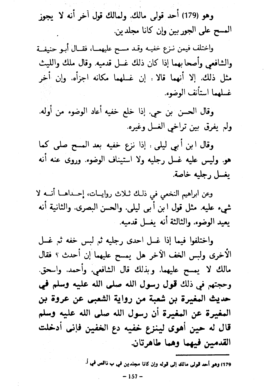 وَهُوَ أَحَدُ قَوْلَيْ مَالِكٍ وَلِمَالِكٍ قَوْلٌ آخَرُ أَنَّهُ لَا يَجُوزُ الْمَسْحُ عَلَى الْجَوْرَبَيْنِ وَإِنْ كَانَا مُجَلَّدَيْنِ وَاخْتُلِفَ فِيمَنْ نَزَعَ خُفَّيْهِ وَقَدْ مَسَحَ عَلَيْهِمَا فَقَالَ أَبُو حَنِيفَةَ وَالشَّافِعِيُّ وَأَصْحَابُهُمَا إِذَا كَانَ ذَلِكَ غَسَلَ قَدَمَيْهِ وَقَالَ مَالِكٌ والليث مِثْلَ ذَلِكَ إِلَّا أَنَّهُمَا قَالَا إِنْ غَسَلَهُمَا مَكَانَهُ أَجَزَأَهُ وَإِنْ أَخَّرَ غَسْلَهُمَا اسْتَأْنَفَ الْوُضُوءَ وَقَالَ الْحَسَنُ بْنُ حَيٍّ إِذَا خَلَعَ خُفَّيْهِ أَعَادَ الْوُضُوءَ مِنْ أَوَّلِهِ وَلَمْ يُفَرِّقْ بَيْنَ تَرَاخِي الْغَسْلِ وَغَيْرِهِ وَقَالَ ابْنُ أَبِي لَيْلَى إِذَا نَزَعَ خُفَّيْهِ بَعْدَ الْمَسْحِ صَلَّى كَمَا هُوَ وَلَيْسَ عَلَيْهِ غَسْلُ رِجْلَيْهِ وَلَا اسْتِينَافُ الْوُضُوءِ وَرُوِيَ عَنْهُ أَنَّهُ يَغْسِلُ رِجْلَيْهِ خَاصَّةً وَعَنْ إِبْرَاهِيمَ النَّخَعِيِّ فِي ذَلِكَ ثَلَاثُ رِوَايَاتٍ إِحْدَاهَا أَنَّهُ لَا شَيْءَ عَلَيْهِ مِثْلَ قَوْلِ ابْنِ أَبِي لَيْلَى وَالْحَسَنِ الْبَصْرِيِّ وَالثَّانِيَةُ أَنَّهُ يُعِيدُ الْوُضُوءَ وَالثَّالِثَةُ أَنَّهُ يَغْسِلُ قَدَمَيْهِ وَاخْتَلَفُوا فيما إذا غسل إحدى رجليه ثم لُبْسِ خُفِّهِ ثُمَّ غَسَلَ الْأُخْرَى وَلَبِسَ الْخُفَّ الْآخَرَ هَلْ يَمْسَحُ عَلَيْهِمَا إِنْ أَحْدَثَ فَقَالَ مَالِكٌ لَا يَمْسَحُ عَلَيْهِمَا وَبِذَلِكَ قَالَ الشَّافِعِيُّ وأحمد وإسحق وَحُجَّتُهُمْ فِي ذَلِكَ قَوْلُ رَسُولِ اللَّهِ صَلَّى اللَّهُ عَلَيْهِ وَسَلَّمَ فِي حَدِيثِ الْمُغِيرَةِ بْنِ شُعْبَةَ مِنْ رِوَايَةِ الشَّعْبِيِّ عَنْ عُرْوَةَ بْنِ الْمُغِيرَةِ عَنِ الْمُغِيرَةِ أَنَّ رَسُولَ اللَّهِ صَلَّى اللَّهُ عَلَيْهِ وَسَلَّمَ قَالَ لَهُ حِينَ أَهْوَى لِيَنْزِعَ خُفَّيْهِ دَعِ الْخُفَّيْنِ فَإِنِّي أَدْخَلْتُ الْقَدَمَيْنِ فِيهِمَا وَهُمَا طَاهِرَتَانِ