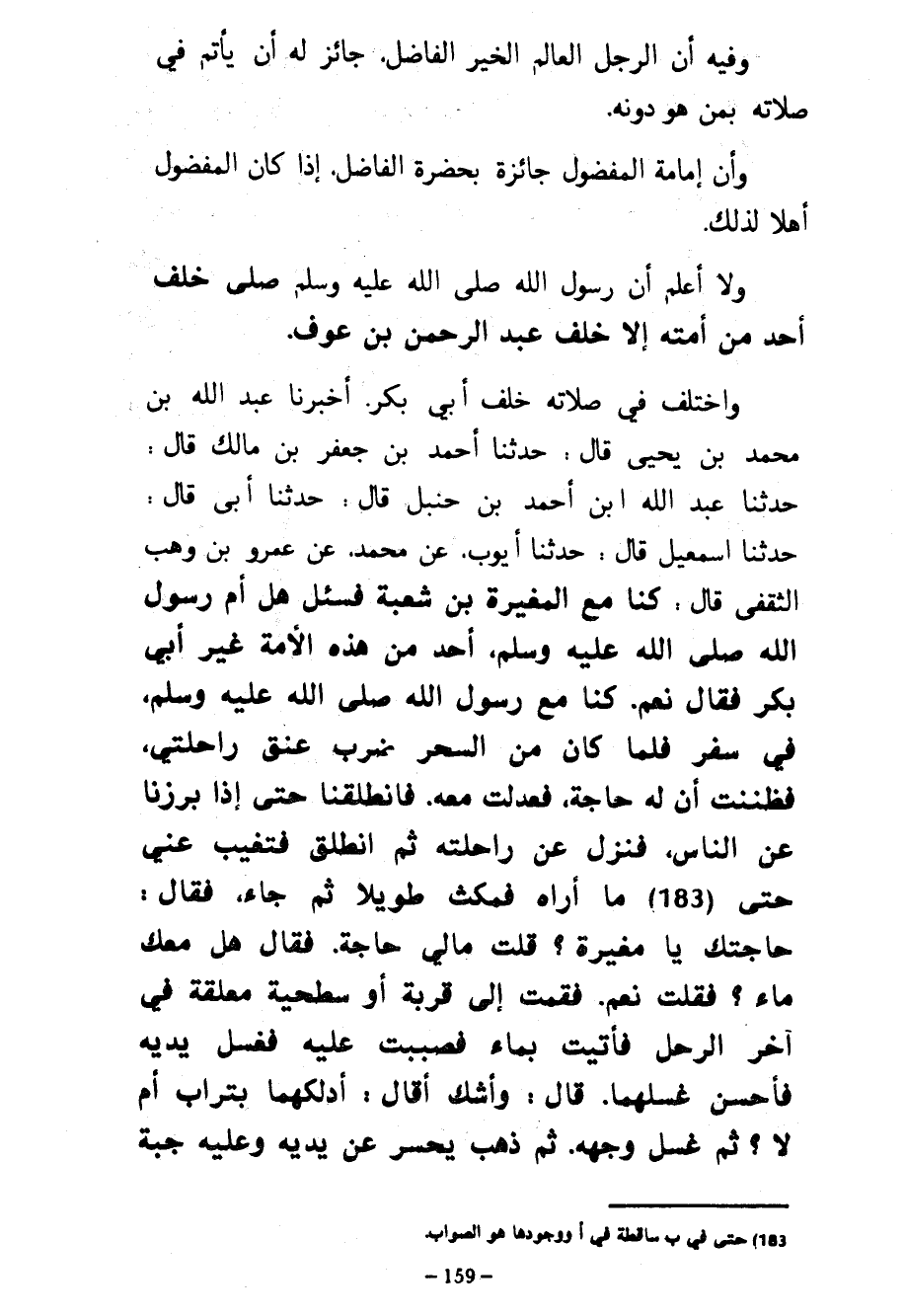 وَفِيهِ أَنَّ الرَّجُلَ الْعَالِمَ الْخَيِّرَ الْفَاضِلَ جَائِزٌ لَهُ أَنْ يَأْتَمَّ فِي صَلَاتِهِ بِمَنْ هُوَ دُونَهُ وَأَنَّ إِمَامَةَ الْمَفْضُولِ جَائِزَةٌ بِحَضْرَةِ الْفَاضِلِ إِذَا كَانَ الْمَفْضُولُ أَهْلًا لِذَلِكَ وَلَا أَعْلَمْ أَنَّ رَسُولَ اللَّهِ صَلَّى اللَّهُ عَلَيْهِ وسلم صَلَّى خَلْفَ أَحَدٍ مِنْ أُمَّتِهِ إِلَّا خَلْفَ عَبْدِ الرَّحْمَنِ بْنِ عَوْفٍ وَاخْتُلِفَ فِي صَلَاتِهِ خَلْفَ أَبِي بَكْرٍ أَخْبَرَنَا عَبْدُ اللَّهِ بْنُ مُحَمَّدِ بْنِ يَحْيَى قَالَ حَدَّثَنَا أَحْمَدُ بْنُ جَعْفَرِ بْنِ مَالِكٍ قَالَ حَدَّثَنَا عَبْدُ اللَّهِ بْنُ أَحْمَدَ بْنِ حَنْبَلٍ قَالَ حَدَّثَنَا أَبِي قَالَ حَدَّثَنَا إِسْمَاعِيلُ قَالَ حَدَّثَنَا أَيُّوبُ عَنْ مُحَمَّدٍ عَنْ عَمْرِو بْنِ وَهْبٍ الثَّقَفِيِّ قَالَ كُنَّا مَعَ الْمُغِيرَةِ بْنِ شُعْبَةَ فَسُئِلَ هَلْ أَمَّ رَسُولَ اللَّهِ صَلَّى اللَّهُ عَلَيْهِ وَسَلَّمَ أَحَدٌ مِنْ هَذِهِ الْأُمَّةِ غَيْرُ أَبِي بَكْرٍ فَقَالَ نَعَمْ كُنَّا مَعَ رَسُولِ اللَّهِ صَلَّى اللَّهُ عَلَيْهِ وَسَلَّمَ فِي سَفَرٍ فَلَمَّا كَانَ مِنَ السَّحَرِ ضَرَبَ عُنُقَ رَاحِلَتِي فَظَنَنْتُ أَنَّ لَهُ حَاجَةً فَعَدَلْتُ مَعَهُ فَانْطَلَقْنَا حَتَّى إِذَا بَرَزْنَا عَنِ النَّاسِ فَنَزَلَ عَنْ رَاحِلَتِهِ ثُمَّ انْطَلَقَ فَتَغَيَّبَ عَنِّي حَتَّى مَا أَرَاهُ فَمَكَثَ طَوِيلًا ثُمَّ جَاءَ فَقَالَ حَاجَتُكَ يَا مُغِيرَةُ قُلْتُ مَا لِي حَاجَةٌ فَقَالَ هَلْ مَعَكَ مَاءٌ فَقُلْتُ نَعَمْ فَقُمْتُ إِلَى قِرْبَةٍ أَوْ سَطْحِيَّةٍ مُعَلَّقَةٍ فِي آخِرِ الرَّحْلِ فَأَتَيْتُ بِمَاءٍ فَصَبَبْتُ عَلَيْهِ فَغَسَلَ يَدَيْهِ فَأَحْسَنَ غَسْلَهُمَا قَالَ وَأَشُكُّ أَقَالَ أَدَلَّكَهُمَا بِتُرَابٍ أَمْ لَا ثُمَّ غَسَلَ وَجْهَهُ ثُمَّ ذَهَبَ يَحْسِرُ عَنْ يَدَيْهِ وعليه جبة