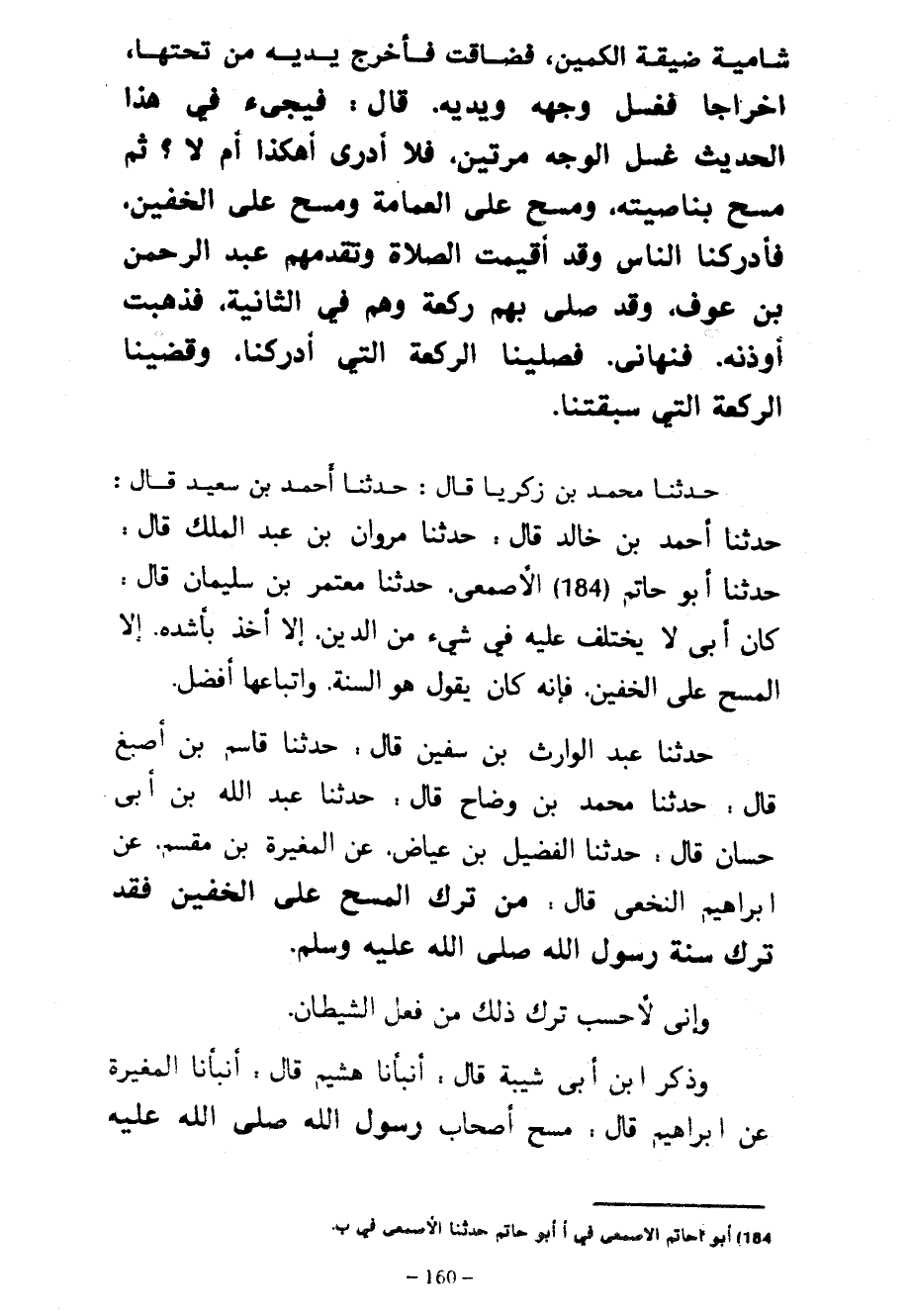 شَامِيَّةٌ ضَيِّقَةُ الْكُمَّيْنِ فَضَاقَتْ فَأَخْرَجَ يَدَيْهِ مِنْ تَحْتِهَا إِخْرَاجًا فَغَسَلَ وَجْهَهُ وَيَدَيْهِ قَالَ فَيَجِيءُ فِي هَذَا الْحَدِيثِ غَسْلُ الْوَجْهِ مَرَّتَيْنِ فَلَا أَدْرِي أَهَكَذَا أَمْ لَا ثُمَّ مَسَحَ بِنَاصِيَتِهِ وَمَسَحَ عَلَى الْعِمَامَةِ وَمَسَحَ عَلَى الْخُفَّيْنِ فَأَدْرَكْنَا النَّاسَ وَقَدْ أُقِيمَتِ الصَّلَاةُ وَتَقَدَّمَهُمْ عَبْدُ الرَّحْمَنِ بْنُ عَوْفٍ وَقَدْ صَلَّى بِهِمْ رَكْعَةً وَهُمْ فِي الثَّانِيَةِ فَذَهَبْتُ أُوذِنُهُ فَنَهَانِي فَصَلَّيْنَا الرَّكْعَةَ الَّتِي أَدْرَكْنَا وَقَضَيْنَا الرَّكْعَةَ الَّتِي سَبَقَتْنَا حَدَّثَنَا مُحَمَّدُ بْنُ زَكَرِيَّا قَالَ حَدَّثَنَا أَحْمَدُ بْنُ سَعِيدٍ قَالَ حَدَّثَنَا أَحْمَدُ بْنُ خَالِدٍ قَالَ حَدَّثَنَا مَرْوَانُ بْنُ عَبْدِ الْمَلِكِ قَالَ حَدَّثَنَا أَبُو حَاتِمٍ الْأَصْمَعِيُّ حَدَّثَنَا مُعْتَمِرُ بْنُ سُلَيْمَانَ قَالَ كَانَ أَبِي لَا يُخْتَلَفُ عَلَيْهِ فِي شَيْءٍ مِنَ الدِّينِ إِلَّا أَخَذَ بِأَشَدِّهِ إِلَّا الْمَسْحَ عَلَى الْخُفَّيْنِ فَإِنَّهُ كَانَ يَقُولُ هُوَ السُّنَّةُ وَاتِّبَاعُهَا أَفْضَلُ حَدَّثَنَا عَبْدُ الْوَارِثِ بْنُ سُفْيَانَ قَالَ حَدَّثَنَا قَاسِمُ بْنُ أَصْبَغَ قَالَ حَدَّثَنَا مُحَمَّدُ بْنُ وَضَّاحٍ قَالَ حَدَّثَنَا عَبْدُ اللَّهِ بْنُ أَبِي حَسَّانٍ قَالَ حَدَّثَنَا الْفُضَيْلُ بْنُ عِيَاضٍ عَنِ الْمُغِيرَةِ بْنِ مِقْسَمٍ عَنْ إِبْرَاهِيمَ النَّخَعِيَّ قَالَ مَنْ تَرَكَ الْمَسْحَ عَلَى الْخُفَّيْنِ فَقَدْ تَرَكَ سُنَّةُ رَسُولِ اللَّهِ صَلَّى اللَّهُ عَلَيْهِ وَسَلَّمَ وَإِنِّي لَأَحْسَبُ تَرْكَ ذَلِكَ مِنْ فِعْلِ الشَّيْطَانِ وَذَكَرَ ابْنُ أَبِي شَيْبَةَ قَالَ أَنْبَأَنَا هُشَيْمٌ قَالَ أَنْبَأَنَا الْمُغِيرَةُ عَنْ إِبْرَاهِيمَ قَالَ مَسَحَ أَصْحَابُ رَسُولِ اللَّهِ صَلَّى اللَّهُ عَلَيْهِ وَسَلَّمَ