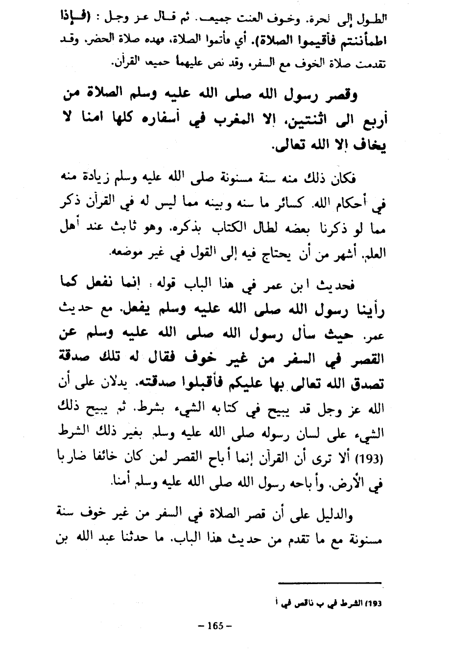 الطَّوْلِ إِلَى الْحُرَّةِ وَخَوْفِ الْعَنَتِ جَمِيعًا ثُمَّ قَالَ عَزَّ وَجَلَّ فَإِذَا اطْمَأْنَنْتُمْ فَأَقِيمُوا الصَّلَاةَ أَيْ فَأَتِمُّوا الصَّلَاةَ فَهَذِهِ صَلَاةُ الْحَضَرِ وَقَدْ تَقَدَّمَتْ صَلَاةُ الْخَوْفِ مَعَ السَّفَرِ وَقَدْ نَصَّ عَلَيْهِمَا جَمِيعًا الْقُرْآنُ وَقَصَرَ رَسُولُ اللَّهِ صَلَّى اللَّهُ عَلَيْهِ وَسَلَّمَ الصَّلَاةَ مِنْ أَرْبَعٍ إِلَى اثْنَتَيْنِ إِلَّا الْمَغْرِبَ فِي أَسْفَارِهِ كُلِّهَا آمِنًا لَا يَخَافُ إِلَّا اللَّهَ تَعَالَى فَكَانَ ذَلِكَ مِنْهُ سُنَّةً مَسْنُونَةً صَلَّى اللَّهُ عَلَيْهِ وَسَلَّمَ زِيَادَةً مِنْهُ فِي أَحْكَامِ اللَّهِ كَسَائِرِ مَا سَنَّهُ وَبَيَّنَهُ مِمَّا لَيْسَ لَهُ فِي الْقُرْآنِ ذِكْرٌ مِمَّا لَوْ ذَكَرْنَا بَعْضَهُ لَطَالَ الْكِتَابُ بِذِكْرِهِ وَهُوَ ثَابِتٌ عِنْدَ أَهْلِ الْعِلْمِ أَشْهَرُ مِنْ أَنْ يُحْتَاجَ فِيهِ إِلَى الْقَوْلِ فِي غَيْرِ مَوْضِعِهِ فَحَدِيثُ ابْنِ عُمَرَ فِي هَذَا الْبَابِ قَوْلُهُ إِنَّمَا نَفْعَلُ كَمَا رَأَيْنَا رَسُولَ اللَّهِ صَلَّى اللَّهُ عَلَيْهِ وَسَلَّمَ يَفْعَلُ مَعَ حَدِيثِ عُمَرَ حَيْثُ سَأَلَ رَسُولَ اللَّهِ صَلَّى اللَّهُ عَلَيْهِ وَسَلَّمَ عَنِ الْقَصْرِ فِي السَّفَرِ مِنْ غَيْرِ خَوْفٍ فَقَالَ لَهُ تِلْكَ صَدَقَةٌ تَصَدَّقَ اللَّهُ تَعَالَى بِهَا عَلَيْكُمْ فَاقْبَلُوا صَدَقَتَهُ يَدُلَّانِ عَلَى أَنَّ اللَّهَ عَزَّ وَجَلَّ قَدْ يُبِيحُ فِي كِتَابِهِ الشَّيْءَ بِشَرْطٍ ثُمَّ يُبِيحُ ذَلِكَ الشَّيْءَ عَلَى لِسَانِ رَسُولِهِ صَلَّى اللَّهُ عَلَيْهِ وَسَلَّمَ بِغَيْرِ ذَلِكَ الشَّرْطِ أَلَا تَرَى أَنَّ الْقُرْآنَ إِنَّمَا أَبَاحَ الْقَصْرَ لِمَنْ كَانَ خَائِفًا ضَارِبًا فِي الْأَرْضِ وَأَبَاحَهُ رَسُولُ اللَّهِ صَلَّى اللَّهُ عَلَيْهِ وَسَلَّمَ آمِنًا وَالدَّلِيلُ عَلَى أَنَّ قَصْرَ الصَّلَاةِ فِي السَّفَرِ مِنْ غَيْرِ خَوْفٍ سُنَّةٌ مَسْنُونَةٌ مَعَ مَا تَقَدَّمَ مِنْ حَدِيثِ هَذَا الْبَابِ مَا حَدَّثَنَا عَبْدُ اللَّهِ بْنُ