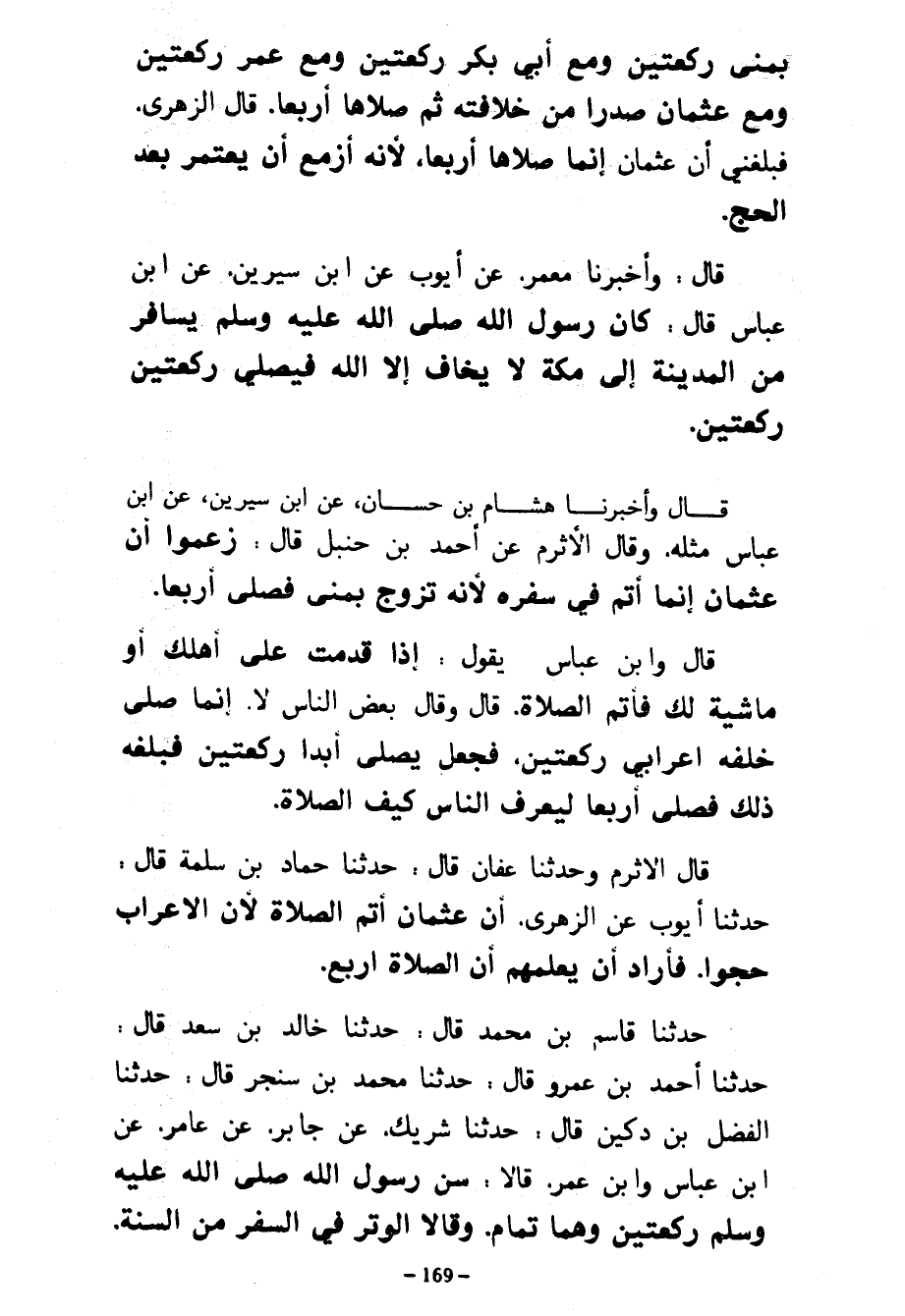 بِمِنَى رَكْعَتَيْنِ وَمَعَ أَبِي بَكْرٍ رَكْعَتَيْنِ وَمَعَ عُمَرَ رَكْعَتَيْنِ وَمَعَ عُثْمَانَ صَدْرًا مِنْ خِلَافَتِهِ ثُمَّ صَلَّاهَا أَرْبَعًا قَالَ الزُّهْرِيُّ فَبَلَغَنِي أَنَّ عُثْمَانَ إِنَّمَا صَلَّاهَا أَرْبَعًا لِأَنَّهُ أَزْمَعَ أَنْ يَعْتَمِرَ بَعْدَ الْحَجِّ قَالَ وَأَخْبَرَنَا مَعْمَرٌ عَنْ أَيُّوبَ عَنِ ابْنِ سِيرِينَ عَنْ ابْنِ عَبَّاسٍ قَالَ كَانَ رَسُولُ اللَّهِ صَلَّى اللَّهُ عَلَيْهِ وَسَلَّمَ يُسَافِرُ مِنَ الْمَدِينَةِ إِلَى مَكَّةَ لَا يَخَافُ إِلَّا اللَّهَ فَيُصَلِّي رَكْعَتَيْنِ رَكْعَتَيْنِ قَالَ وَأَخْبَرَنَا هِشَامِ بْنِ حَسَّانَ عَنِ ابْنِ سِيرِينَ عَنْ ابْنِ عَبَّاسٍ مِثْلَهُ وَقَالَ الْأَثْرَمُ عَنْ أَحْمَدَ بْنِ حَنْبَلٍ قَالَ زَعَمُوا أَنَّ عُثْمَانَ إِنَّمَا أَتَمَّ فِي سَفَرِهِ لِأَنَّهُ تَزَوَّجَ بِمِنَى فَصَلَّى أَرْبَعًا قَالَ وَابْنُ عَبَّاسٍ يَقُولُ إِذَا قَدِمْتَ عَلَى أَهْلِكَ أَوْ مَاشِيَةٍ لَكَ فَأَتِمَّ الصَّلَاةَ قَالَ وَقَالَ بَعْضُ النَّاسِ لَا إِنَّمَا صَلَّى خَلْفَهُ أَعْرَابِيٌّ رَكْعَتَيْنِ فَجَعَلَ يُصَلِّي أَبَدًا رَكْعَتَيْنِ فَبَلَغَهُ ذَلِكَ فَصَلَّى أَرْبَعًا لِيَعْرِفَ النَّاسُ كَيْفَ الصَّلَاةُ قَالَ الْأَثْرَمُ وَحَدَّثَنَا عَفَّانُ قَالَ حَدَّثَنَا حَمَّادُ بْنُ سَلَمَةَ قَالَ حَدَّثَنَا أَيُّوبُ عَنِ الزُّهْرِيِّ أَنَّ عُثْمَانَ أَتَمَّ الصَّلَاةَ لِأَنَّ الْأَعْرَابَ حَجُّوا فَأَرَادَ أَنْ يُعَلِّمَهُمْ أَنَّ الصَّلَاةَ أَرْبَعٌ حَدَّثَنَا قَاسِمُ بْنُ مُحَمَّدٍ قَالَ حَدَّثَنَا خَالِدُ بْنُ سَعْدٍ قَالَ حَدَّثَنَا أَحْمَدُ بْنُ عَمْرٍو قَالَ حَدَّثَنَا محمد بن سنجر قال حَدَّثَنَا الْفَضْلُ بْنُ دُكَيْنٍ قَالَ حَدَّثَنَا شَرِيكٌ عَنْ جَابِرٍ عَنْ عَامِرٍ عَنِ ابْنِ عَبَّاسٍ وَابْنِ عُمَرَ قَالَا سَنَّ رَسُولُ اللَّهِ صَلَّى اللَّهُ عَلَيْهِ وَسَلَّمَ رَكْعَتَيْنِ وَهُمَا تَمَامٌ وَقَالَا الْوِتْرُ فِي السَّفَرِ مِنَ السُّنَّةِ