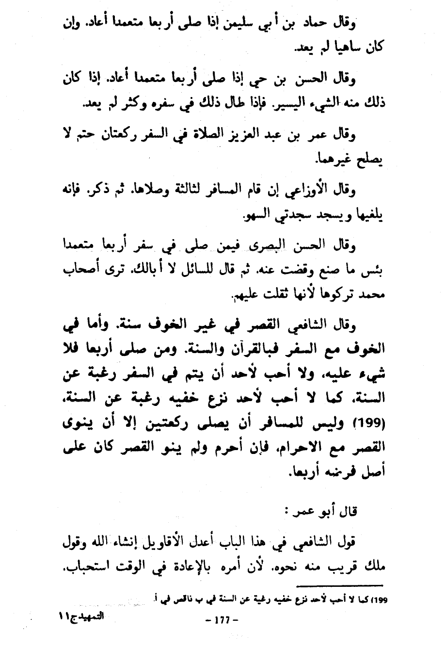 وَقَالَ حَمَّادُ بْنُ أَبِي سُلَيْمَانَ إِذَا صَلَّى أَرْبَعًا مُتَعَمِّدًا أَعَادَ وَإِنْ كَانَ سَاهِيًا لَمْ يُعِدْ وَقَالَ الْحَسَنُ بْنُ حَيٍّ إِذَا صَلَّى أَرْبَعًا مُتَعَمِّدًا أَعَادَ إِذَا كَانَ ذَلِكَ مِنْهُ الشَّيْءُ الْيَسِيرُ فَإِذَا طَالَ ذَلِكَ فِي سَفَرِهِ وَكَثُرَ لَمْ يُعِدْ وَقَالَ عُمَرُ بْنُ عَبْدِ الْعَزِيزِ الصَّلَاةُ فِي السَّفَرِ رَكْعَتَانِ حَتْمٌ لَا يَصْلُحُ غَيْرُهُمَا وَقَالَ الْأَوْزَاعِيُّ إِنْ قَامَ الْمُسَافِرُ لثالثة وصلاها ثم ذِكْرٍ فَإِنَّهُ يُلْغِيهَا وَيَسْجُدُ سَجْدَتَيِ السَّهْوِ وَقَالَ الْحَسَنُ الْبَصْرِيُّ فِيمَنْ صَلَّى فِي سِفْرٍ أَرْبَعًا مُتَعَمِّدًا بِئْسَ مَا صَنَعَ وَقَضَتْ عَنْهُ ثُمَّ قَالَ لِلسَّائِلِ لَا أَبَا لَكَ تَرَى أَصْحَابَ مُحَمَّدٍ تَرَكُوهَا لِأَنَّهَا ثَقُلَتْ عَلَيْهِمْ وَقَالَ الشَّافِعِيُّ الْقَصْرُ فِي غَيْرِ الْخَوْفِ سُنَّةٌ وَأَمَّا فِي الْخَوْفِ مَعَ السَّفَرِ فَبِالْقُرْآنِ وَالسُّنَّةِ وَمَنْ صَلَّى أَرْبَعًا فَلَا شَيْءَ عَلَيْهِ وَلَا أُحِبُّ لِأَحَدٍ أَنْ يُتِمَّ فِي السَّفَرِ رَغْبَةً عَنِ السُّنَّةِ كَمَا لَا أُحِبُّ لِأَحَدٍ نَزْعَ خُفَّيْهِ رَغْبَةً عَنِ السُّنَّةِ وَلَيْسَ لِلْمُسَافِرِ أَنْ يُصَلِّيَ رَكْعَتَيْنِ إِلَّا أَنْ يَنْوِيَ الْقَصْرَ مَعَ الْإِحْرَامِ فَإِنْ أَحْرَمَ وَلَمْ يَنْوِ الْقَصْرَ كَانَ عَلَى أَصْلِ فَرْضِهِ أَرْبَعًا قَالَ أَبُو عُمَرَ قَوْلُ الشَّافِعِيِّ فِي هَذَا الْبَابِ أَعْدَلُ الْأَقَاوِيلِ إِنْ شَاءَ اللَّهُ وَقَوْلُ مَالِكٍ قَرِيبٌ مِنْهُ نَحْوُهُ لِأَنَّ أَمْرَهُ بِالْإِعَادَةِ فِي الْوَقْتِ اسْتِحْبَابٌ