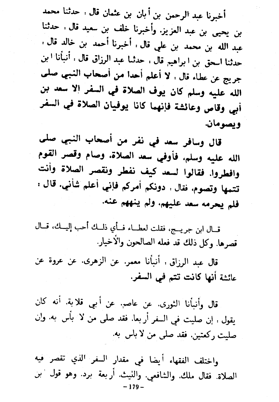 أَخْبَرَنَا عَبْدُ الرَّحْمَنِ بْنُ أَبَانِ بْنِ عُثْمَانَ قَالَ حَدَّثَنَا مُحَمَّدُ بْنُ يَحْيَى بْنِ عَبْدِ الْعَزِيزِ وَأَخْبَرَنَا خَلَفُ بْنُ سَعِيدٍ قَالَ حَدَّثَنَا عَبْدُ اللَّهِ بْنُ مُحَمَّدِ بْنِ عَلِيٍّ قَالَ أَخْبَرَنَا أَحْمَدُ بن خالد قال حدثنا إسحق بْنُ إِبْرَاهِيمَ قَالَ حَدَّثَنَا عَبْدُ الرَّزَّاقِ قَالَ أَنْبَأَنَا ابْنُ جُرَيْجٍ عَنْ عَطَاءٍ قَالَ لَا أَعْلَمُ أَحَدًا مِنْ أَصْحَابِ النَّبِيِّ صَلَّى اللَّهُ عَلَيْهِ وَسَلَّمَ كان يوف الصَّلَاةَ فِي السَّفَرِ إِلَّا سَعْدَ بْنَ أَبِي وَقَّاصٍ وَعَائِشَةَ فَإِنَّهُمَا كَانَا يُوَفِّيَانِ الصَّلَاةَ فِي السَّفَرِ وَيَصُومَانِ قَالَ وَسَافَرَ سَعْدٌ فِي نَفَرٍ مِنْ أَصْحَابِ النَّبِيِّ صَلَّى اللَّهُ عَلَيْهِ وَسَلَّمَ فَأَوْفَى سَعْدٌ الصَّلَاةَ وَصَامَ وَقَصَرَ الْقَوْمُ وَأَفْطَرُوا فَقَالُوا لِسَعْدٍ كَيْفَ نُفْطِرُ وَنَقْصُرُ الصَّلَاةَ وَأَنْتَ تُتِمُّهَا وَتَصُومُ فَقَالَ دُونَكُمْ أَمْرَكُمْ فَإِنِّي أَعْلَمُ شَأْنِي قَالَ فَلَمْ يُحَرِّمْهُ سَعْدٌ عَلَيْهِمْ وَلَمْ يَنْهَهُمْ عَنْهُ قَالَ ابْنُ جُرَيْجٍ فَقُلْتُ لِعَطَاءٍ فَأَيُّ ذَلِكَ أَحَبُّ إِلَيْكَ قَالَ قَصْرُهَا وَكُلُّ ذَلِكَ قَدْ فَعَلَهُ الصَّالِحُونَ وَالْأَخْيَارُ قَالَ عَبْدُ الرَّزَّاقِ أَنْبَأَنَا مَعْمَرٍ عَنِ الزُّهْرِيِّ عَنْ عُرْوَةَ عَنْ عَائِشَةَ أَنَّهَا كَانَتْ تُتِمُّ فِي السَّفَرِ قَالَ وَأَنْبَأْنَا الثَّوْرِيُّ عَنْ عَاصِمٍ عَنْ أَبِي قِلَابَةَ أَنَّهُ كَانَ يَقُولُ إِنْ صَلَّيْتَ فِي السَّفَرِ أَرْبَعًا فَقَدْ صَلَّى مَنْ لَا بَأْسَ بِهِ وَإِنْ صَلَّيْتَ رَكْعَتَيْنِ فَقَدْ صَلَّى مَنْ لَا بَأْسَ بِهِ وَاخْتَلَفَ الْفُقَهَاءُ أَيْضًا فِي مِقْدَارِ السَّفَرِ الَّذِي تُقْصَرُ فِيهِ الصَّلَاةُ فَقَالَ مَالِكٌ وَالشَّافِعِيُّ وَاللَّيْثُ أَرْبَعَةُ بُرُدٍ وَهُوَ قَوْلُ ابْنِ