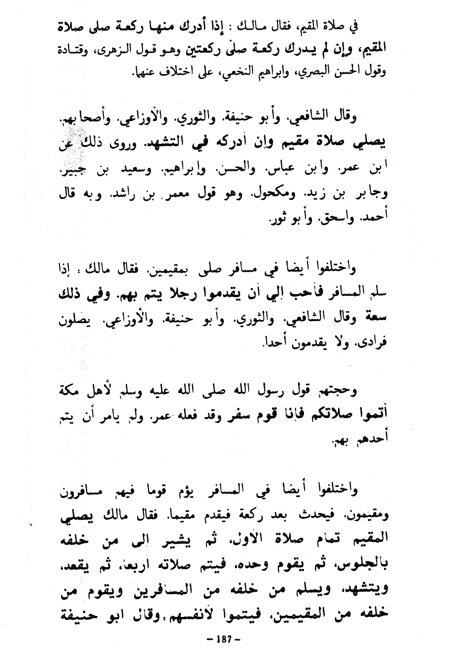 فِي صَلَاةِ الْمُقِيمِ فَقَالَ مَالِكٌ إِذَا أَدْرَكَ مِنْهَا رَكْعَةً صَلَّى صَلَاةَ الْمُقِيمِ وَإِنْ لَمْ يُدْرِكْ رَكْعَةً صَلَّى رَكْعَتَيْنِ وَهُوَ قَوْلُ الزُّهْرِيِّ وَقَتَادَةَ وَقَوْلُ الْحَسَنِ الْبَصْرِيِّ وَإِبْرَاهِيمَ النَّخَعِيِّ عَلَى اخْتِلَافٍ عَنْهُمَا وَقَالَ الشَّافِعِيُّ وَأَبُو حَنِيفَةَ وَالثَّوْرِيُّ وَالْأَوْزَاعِيُّ وَأَصْحَابُهُمْ يُصَلِّي صَلَاةَ مُقِيمٍ وَإِنْ أَدْرَكَهُ فِي التَّشَهُّدِ وَرُوِيَ ذَلِكَ عَنِ ابْنِ عُمَرَ وَابْنِ عَبَّاسٍ وَالْحَسَنِ وَإِبْرَاهِيمَ وَسَعِيدِ بْنِ جُبَيْرٍ وَجَابِرِ بْنِ زَيْدٍ وَمَكْحُولٍ وَهُوَ قَوْلُ مَعْمَرِ بن راشد وبه قال أحمد وإسحق وَأَبُو ثَوْرٍ وَاخْتَلَفُوا أَيْضًا فِي مُسَافِرٍ صَلَّى بِمُقِيمِينَ فَقَالَ مَالِكٌ إِذَا سَلَّمَ الْمُسَافِرُ فَأَحَبُّ إِلَيَّ أَنْ يُقَدِّمُوا رَجُلًا يُتِمُّ بِهِمْ وَفِي ذَلِكَ سِعَةٌ وَقَالَ الشَّافِعِيُّ وَالثَّوْرِيُّ وَأَبُو حَنِيفَةَ وَالْأَوْزَاعِيُّ يُصَلُّونَ فُرَادَى وَلَا يُقَدِّمُونَ أَحَدًا وَحُجَّتُهُمْ قَوْلُ رَسُولِ اللَّهِ صَلَّى اللَّهُ عَلَيْهِ وسلم لِأَهْلِ مَكَّةَ أَتِمُّوا صَلَاتَكُمْ فَإِنَّا قَوْمٌ سَفَرٌ وَقَدْ فَعَلَهُ عُمَرُ وَلَمْ يَأْمُرْ أَنْ يُتِمَّ أَحَدُهُمْ بِهِمْ وَاخْتَلَفُوا أَيْضًا فِي الْمُسَافِرِ يَؤُمُّ قَوْمًا فِيهِمْ مُسَافِرُونَ وَمُقِيمُونَ فَيُحْدِثُ بَعْدَ رَكْعَةٍ فَيُقَدِّمُ مُقِيمًا فَقَالَ مَالِكٌ يُصَلِّي الْمُقِيمُ تَمَامَ صَلَاةِ الْأَوَّلِ ثُمَّ يُشِيرُ إِلَى مَنْ خَلْفَهُ بِالْجُلُوسِ ثُمَّ يَقُومُ وَحْدَهُ فَيُتِمُّ صَلَاتَهُ أَرْبَعًا ثُمَّ يَقْعُدُ وَيَتَشَهَّدُ وَيُسَلِّمُ مَنْ خَلْفَهُ مِنَ الْمُسَافِرِينَ وَيَقُومُ مَنْ خَلْفَهُ مِنَ الْمُقِيمِينَ فَيُتِمُّوا لِأَنْفُسِهِمْ وَقَالَ أَبُو حَنِيفَةَ