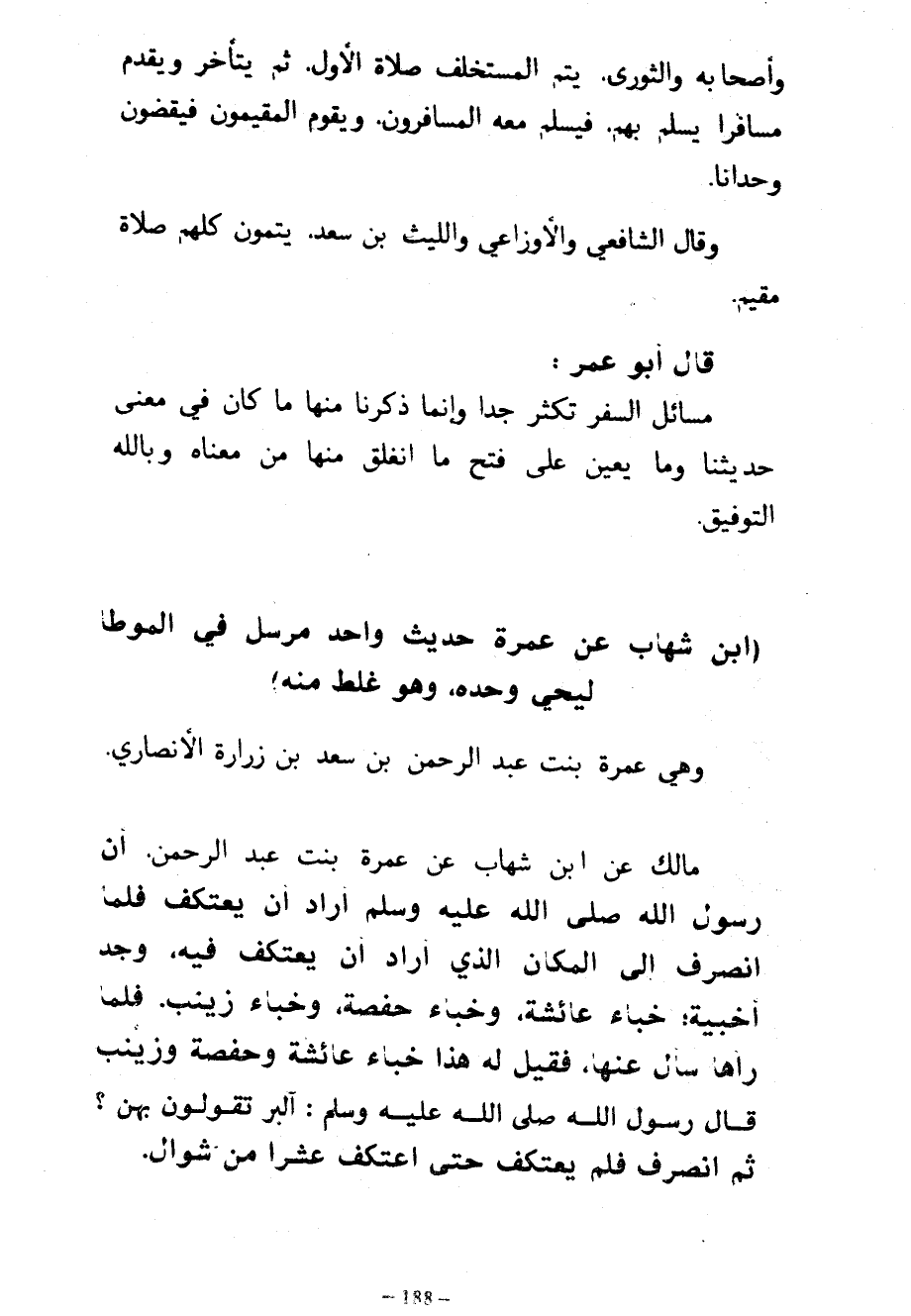وَأَصْحَابُهُ وَالثَّوْرِيُّ يُتِمُّ الْمُسْتَخْلَفُ صَلَاةَ الْأَوَّلِ ثُمَّ يَتَأَخَّرُ وَيُقَدِّمُ مُسَافِرًا يُسَلِّمُ بِهِمْ فَيُسَلِّمُ مَعَهُ الْمُسَافِرُونَ وَيَقُومُ الْمُقِيمُونَ فَيَقْضُونَ وُحْدَانًا وَقَالَ الشَّافِعِيُّ وَالْأَوْزَاعِيُّ وَاللَّيْثُ بْنُ سَعْدٍ يُتِمُّونَ كُلُّهُمْ صَلَاةَ مُقِيمٍ قَالَ أَبُو عُمَرَ مَسَائِلُ السَّفَرِ تَكْثُرُ جِدًّا وَإِنَّمَا ذَكَرْنَا مِنْهَا مَا كَانَ فِي مَعْنَى حَدِيثِنَا وَمَا يُعِينُ عَلَى فَتْحِ مَا انْغَلَقَ مِنْهَا مِنْ مَعْنَاهُ وَبِاللَّهِ التَّوْفِيقُ (ابْنُ شِهَابٍ عَنْ عَمْرَةَ حَدِيثٌ وَاحِدٌ مُرْسَلٌ فِي الْمُوَطَّأِ لِيَحْيَى وَحْدَهُ وَهُوَ غَلَطٌ مِنْهُ) وَهِي عَمْرَةُ بِنْتُ عَبْدِ الرَّحْمَنِ بْنِ سَعْدِ بْنِ زُرَارَةَ الْأَنْصَارِيِّ مَالِكٌ عَنِ ابْنِ شِهَابٍ عَنْ عَمْرَةَ بِنْتِ عَبْدِ الرَّحْمَنِ أَنَّ رَسُولَ اللَّهِ صَلَّى اللَّهُ عَلَيْهِ وَسَلَّمَ أَرَادَ أَنْ يَعْتَكِفَ فَلَمَّا انْصَرَفَ إِلَى الْمَكَانِ الَّذِي أَرَادَ أَنْ يَعْتَكِفَ فِيهِ وَجَدَ أَخْبِيَةً خِبَاءَ عَائِشَةَ وَخِبَاءَ حَفْصَةَ وَخِبَاءَ زَيْنَبَ فَلَمَّا رَآهَا سَأَلَ عَنْهَا فَقِيلَ لَهُ هَذَا خِبَاءُ عَائِشَةَ وَحَفْصَةَ وَزَيْنَبَ قَالَ رَسُولُ اللَّهِ صَلَّى اللَّهُ عَلَيْهِ وَسَلَّمَ آلْبِرَّ تَقُولُونَ بِهِنَّ ثُمَّ انْصَرَفَ فَلَمْ يَعْتَكِفْ حَتَّى اعْتَكَفَ عَشْرًا مِنْ شَوَّالٍ