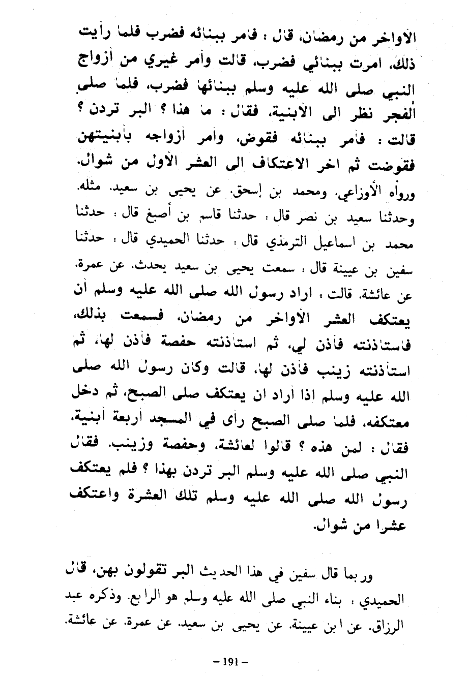 الْأَوَاخِرِ مِنْ رَمَضَانَ قَالَ فَأَمَرَ بِبِنَائِهِ فَضُرِبَ فَلَمَّا رَأَيْتُ ذَلِكَ أَمَرْتُ بِبِنَائِي فَضُرِبَ قَالَتْ وَأَمَرَ غَيْرِي مِنْ أَزْوَاجِ النَّبِيِّ صَلَّى اللَّهُ عَلَيْهِ وَسَلَّمَ بِبِنَائِهَا فَضُرِبَ فَلَمَّا صَلَّى الْفَجْرَ نَظَرَ إِلَى الْأَبْنِيَةِ فَقَالَ مَا هَذَا آلْبِرَّ تُرِدْنَ قَالَتْ فَأَمَرَ بِبِنَائِهِ فَقُوِّضَ وَأَمَرَ أَزْوَاجُهُ بِأَبْنِيَتِهِنَّ فَقُوِّضَتْ ثُمَّ أَخَّرَ الِاعْتِكَافَ إِلَى الْعَشْرِ الْأُوَلِ مِنْ شَوَّالٍ وَرَوَاهُ الْأَوْزَاعِيُّ وَمُحَمَّدُ بْنُ إسحق عَنْ يَحْيَى بْنِ سَعِيدٍ مِثْلَهُ وَحَدَّثَنَا سَعِيدُ بْنُ نَصْرٍ قَالَ حَدَّثَنَا قَاسِمُ بْنُ أَصْبَغَ قَالَ حَدَّثَنَا مُحَمَّدُ بْنُ إِسْمَاعِيلَ التِّرْمِذِيُّ قَالَ حَدَّثَنَا الْحُمَيْدِيُّ قَالَ حَدَّثَنَا سُفْيَانُ بْنُ عُيَيْنَةَ قَالَ سَمِعْتُ يَحْيَى بْنَ سَعِيدٍ يُحَدِّثُ عَنْ عَمْرَةَ عَنْ عَائِشَةَ قَالَتْ أَرَادَ رَسُولُ اللَّهِ صَلَّى اللَّهُ عَلَيْهِ وَسَلَّمَ أَنْ يَعْتَكِفَ الْعَشْرَ الْأَوَاخِرَ مِنْ رَمَضَانَ فَسَمِعْتُ بِذَلِكَ فَاسْتَأْذَنْتُهُ فَأَذِنَ لِي ثُمَّ اسْتَأْذَنَتْهُ حَفْصَةُ فَأَذِنَ لَهَا ثُمَّ اسْتَأْذَنَتْهُ زَيْنَبُ فَأَذِنَ لَهَا قَالَتْ وَكَانَ رَسُولُ اللَّهِ صَلَّى اللَّهُ عَلَيْهِ وَسَلَّمَ إِذَا أَرَادَ أَنْ يَعْتَكِفَ صَلَّى الصُّبْحَ ثُمَّ دَخَلَ مُعْتَكَفَهُ فَلَمَّا صَلَّى الصُّبْحَ رَأَى فِي الْمَسْجِدِ أَرْبَعَةَ أَبْنِيَةٍ فَقَالَ لِمَنْ هَذِهِ قَالُوا لِعَائِشَةَ وَحَفْصَةَ وَزَيْنَبَ فَقَالَ النَّبِيُّ صَلَّى اللَّهُ عَلَيْهِ وَسَلَّمَ آلْبِرَّ تُرِدْنَ بِهَذَا فَلَمْ يَعْتَكِفْ رَسُولُ اللَّهِ صَلَّى اللَّهُ عَلَيْهِ وَسَلَّمَ تِلْكَ الْعَشْرَةَ وَاعْتَكَفَ عَشْرًا مِنْ شَوَّالٍ وَرُبَّمَا قَالَ سُفْيَانُ فِي هَذَا الْحَدِيثِ آلْبِرَّ تَقُولُونَ بِهِنَّ قَالَ الْحُمَيْدِيُّ بِنَاءُ النَّبِيِّ صَلَّى اللَّهُ عَلَيْهِ وَسَلَّمَ هُوَ الرَّابِعُ وَذَكَرَهُ عَبْدُ الرَّزَّاقِ عَنِ ابْنِ عُيَيْنَةَ عَنْ يَحْيَى بْنِ سَعِيدٍ عَنْ عَمْرَةَ عَنْ عائشة