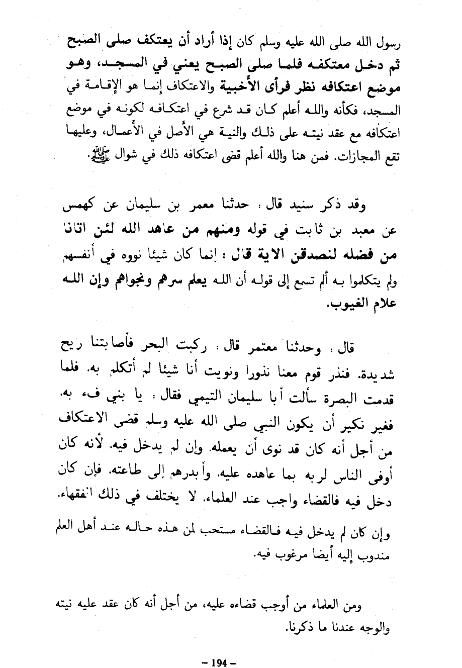 رَسُولُ اللَّهِ صَلَّى اللَّهُ عَلَيْهِ وَسَلَّمَ كَانَ إِذَا أَرَادَ أَنْ يَعْتَكِفَ صَلَّى الصُّبْحَ ثُمَّ دَخَلَ مُعْتَكَفَهُ فَلَمَّا صَلَّى الصُّبْحَ يَعْنِي فِي الْمَسْجِدِ وَهُوَ مَوْضِعُ اعْتِكَافِهِ نَظَرَ فَرَأَى الْأَخْبِيَةَ وَالِاعْتِكَافُ إِنَّمَا هُوَ الْإِقَامَةُ فِي الْمَسْجِدِ فَكَأَنَّهُ وَاللَّهُ أَعْلَمُ كَانَ قَدْ شَرَعَ فِي اعْتِكَافِهِ لِكَوْنِهِ فِي مَوْضِعِ اعْتِكَافِهِ مَعَ عَقْدِ نِيَّتِهِ عَلَى ذَلِكَ وَالنِّيَّةُ هِيَ الْأَصْلُ فِي الْأَعْمَالِ وَعَلَيْهَا تَقَعُ الْمَجَازَاتُ فَمِنْ هُنَا وَاللَّهُ أَعْلَمُ قَضَى اعْتِكَافَهُ ذَلِكَ فِي شَوَّالٍ صَلَّى اللَّهُ عَلَيْهِ وَسَلَّمَ وَقَدْ ذَكَرَ سُنَيْدٌ قَالَ حَدَّثَنَا مَعْمَرُ بْنُ سُلَيْمَانَ عَنْ كَهْمَسٍ عَنْ مَعْبَدِ بْنِ ثَابِتٍ فِي قَوْلِهِ وَمِنْهُمْ مَنْ عَاهَدَ اللَّهَ لَئِنْ آتَانَا مِنْ فَضْلِهِ لَنَصَّدَّقَنَّ الْآيَةَ قَالَ إِنَّمَا كَانَ شَيْئًا نَوَوْهُ فِي أَنْفُسِهِمْ وَلَمْ يَتَكَلَّمُوا بِهِ أَلَمْ تَسْمَعْ إِلَى قَوْلِهِ أَنَّ اللَّهَ يَعْلَمُ سِرَّهُمْ وَنَجْوَاهُمْ وَأَنَّ اللَّهَ عَلَّامُ الْغُيُوبِ قَالَ وَحَدَّثَنَا مُعْتَمِرٌ قَالَ رَكِبْتُ الْبَحْرَ فَأَصَابَتْنَا رِيحٌ شَدِيدَةٌ فَنَذَرَ قَوْمٌ مَعَنَا نُذُورًا وَنَوَيْتُ أَنَا شَيْئًا لَمْ أَتَكَلَّمْ بِهِ فَلَمَّا قَدِمْتُ الْبَصْرَةَ سَأَلْتُ أَبَا سُلَيْمَانَ التَّيْمِيَّ فَقَالَ يَا بُنَيَّ فِءْ بِهِ فَغَيْرُ نَكِيرٍ أَنْ يَكُونَ النَّبِيُّ صَلَّى اللَّهُ عَلَيْهِ وَسَلَّمَ قَضَى الِاعْتِكَافَ مِنْ أَجْلِ أَنَّهُ كَانَ قَدْ نَوَى أَنْ يَعْمَلَهُ وَإِنْ لَمْ يَدْخُلْ فِيهِ لِأَنَّهُ كَانَ أَوْفَى النَّاسِ لِرَبِّهِ بِمَا عَاهَدَهُ عَلَيْهِ وَأَبْدَرَهُمْ إِلَى طَاعَتِهِ فَإِنْ كَانَ دَخَلَ فِيهِ فَالْقَضَاءُ وَاجِبٌ عِنْدَ الْعُلَمَاءِ لَا يَخْتَلِفُ فِي ذَلِكَ الْفُقَهَاءُ وَإِنْ كَانَ لَمْ يَدْخُلْ فِيهِ فَالْقَضَاءُ مُسْتَحَبٌّ لِمَنْ هَذِهِ حَالُهُ عِنْدَ أَهْلِ الْعِلْمِ مَنْدُوبٌ إِلَيْهِ أَيْضًا مَرْغُوبٌ فِيهِ وَمِنَ الْعُلَمَاءِ مَنْ أَوْجَبَ قَضَاءَهُ عَلَيْهِ مِنْ أَجْلِ أَنَّهُ كَانَ عَقَدَ عَلَيْهِ نِيَّتَهُ وَالْوَجْهُ عِنْدَنَا مَا ذَكَرْنَا