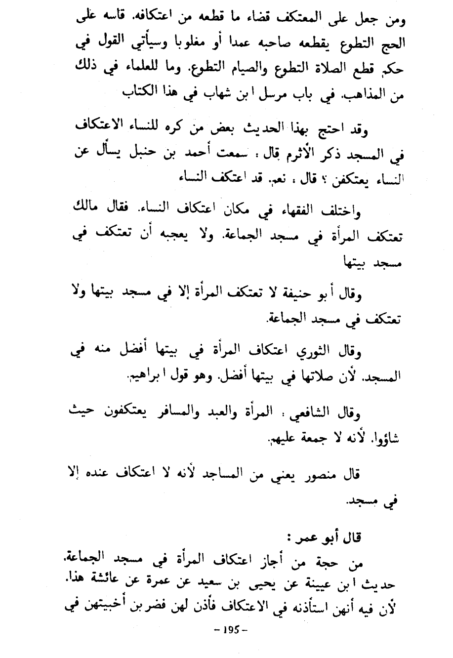 وَمَنْ جَعَلَ عَلَى الْمُعْتَكِفِ قَضَاءَ مَا قَطَعَهُ مِنَ اعْتِكَافِهِ قَاسَهُ عَلَى الْحَجِّ التَّطَوُّعِ يَقْطَعُهُ صَاحِبُهُ عَمْدًا أَوْ مَغْلُوبًا وَسَيَأْتِي الْقَوْلُ فِي حُكْمِ قَطْعِ الصَّلَاةِ التَّطَوُّعِ وَالصِّيَامِ التَّطَوُّعِ وَمَا لِلْعُلَمَاءِ فِي ذَلِكَ مِنَ الْمَذَاهِبِ فِي بَابِ مُرْسَلِ ابْنِ شِهَابٍ فِي هَذَا الْكِتَابِ وَقَدِ احْتَجَّ بِهَذَا الْحَدِيثِ بَعْضُ مَنْ كَرِهَ لِلنِّسَاءِ الِاعْتِكَافَ فِي الْمَسْجِدِ ذَكَرَ الْأَثْرَمُ قَالَ سَمِعْتُ أَحْمَدَ بْنَ حَنْبَلٍ يُسْأَلُ عَنْ النِّسَاءِ يَعْتَكِفْنَ قَالَ نَعَمْ قَدِ اعْتَكَفَ النِّسَاءُ وَاخْتَلَفَ الْفُقَهَاءُ فِي مَكَانِ اعْتِكَافِ النِّسَاءِ فَقَالَ مَالِكٌ تَعْتَكِفُ الْمَرْأَةُ فِي مَسْجِدِ الْجَمَاعَةِ وَلَا يُعْجِبُهُ أَنْ تعتكف في مسجد بيتها وقال أبو حنيفةلا تَعْتَكِفُ الْمَرْأَةُ إِلَّا فِي مَسْجِدِ بَيْتِهَا وَلَا تَعْتَكِفُ فِي مَسْجِدِ الْجَمَاعَةِ وَقَالَ الثَّوْرِيُّ اعْتِكَافُ الْمَرْأَةِ فِي بَيْتِهَا أَفْضَلُ مِنْهُ فِي الْمَسْجِدِ لِأَنَّ صَلَاتَهَا فِي بَيْتِهَا أَفْضَلُ وَهُوَ قَوْلُ إِبْرَاهِيمَ وَقَالَ الشَّافِعِيُّ الْمَرْأَةُ وَالْعَبْدُ وَالْمُسَافِرُ يَعْتَكِفُونَ حيث شاؤوا لِأَنَّهُ لَا جُمْعَةَ عَلَيْهِمْ قَالَ مَنْصُورٌ يَعْنِي مِنَ الْمَسَاجِدِ لِأَنَّهُ لَا اعْتِكَافَ عِنْدَهُ إِلَّا فِي مَسْجِدٍ قَالَ أَبُو عُمَرَ مِنْ حُجَّةِ مَنْ أَجَازَ اعْتِكَافَ الْمَرْأَةِ فِي مَسْجِدِ الْجَمَاعَةِ حَدِيثُ ابْنِ عُيَيْنَةَ عَنْ يَحْيَى بْنِ سَعِيدٍ عَنْ عَمْرَةَ عَنْ عَائِشَةَ هَذَا لِأَنَّ فِيهِ أَنَّهُنَّ اسْتَأْذَنَّهُ فِي الِاعْتِكَافِ فَأَذِنَ لَهُنَّ فَضَرَبْنَ أخبيتهن في