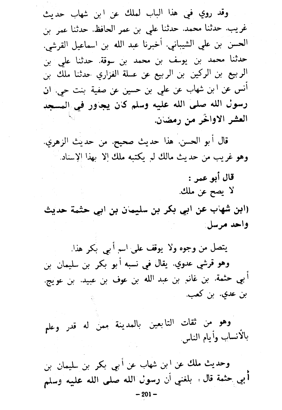 وقد روي في هذا الباب لمالك عَنِ ابْنِ شِهَابٍ حَدِيثٌ غَرِيبٌ حَدَّثَنَا مُحَمَّدٌ حَدَّثَنَا عَلِيُّ بْنُ عُمَرَ الْحَافِظُ حَدَّثَنَا عُمَرُ بْنُ الْحَسَنِ بْنِ عَلِيٍّ الشَّيْبَانِيُّ أَخْبَرَنَا عَبْدُ اللَّهِ بْنُ إِسْمَاعِيلَ الْقُرَشِيُّ حَدَّثَنَا مُحَمَّدُ بْنُ يُوسُفَ بْنِ مُحَمَّدِ بْنِ سُوقَةَ حَدَّثَنَا عَلِيُّ بْنُ الرَّبِيعِ بْنِ الرَّكِينِ بْنِ الرَّبِيعِ عَنْ عَسَلَةَ الْفَزَارِيِّ حَدَّثَنَا مَالِكُ بْنُ أَنَسٍ عَنِ ابْنِ شِهَابٍ عن علي بن حسين عن صفية بنت حي أن رسول الله صلى الله عليه وسلم كَانَ يُجَاوِرُ فِي الْمَسْجِدِ الْعَشْرَ الْأَوَاخِرَ مِنْ رَمَضَانَ قَالَ أَبُو الْحَسَنِ هَذَا حَدِيثٌ صَحِيحٌ مِنْ حَدِيثِ الزُّهْرِيِّ وَهُوَ غَرِيبٌ مِنْ حَدِيثِ مَالِكٍ لَمْ يَكْتُبْهُ مَالِكٌ إِلَّا بِهَذَا الْإِسْنَادِ قَالَ أَبُو عُمَرَ لَا يَصِحُّ عَنْ مَالِكٍ (ابْنُ شِهَابٍ عَنْ أَبِي بَكْرِ بْنِ سُلَيْمَانَ بْنِ أَبِي حَثْمَةَ حَدِيثٌ وَاحِدٌ مُرْسَلٌ) يَتَّصِلُ مِنْ وُجُوهٍ وَلَا يُوقَفُ عَلَى اسْمِ أَبِي بَكْرٍ هَذَا وَهُوَ قُرَشِيٌّ عَدَوِيٌّ يُقَالُ فِي نَسَبِهِ أَبُو بَكْرِ بْنُ سُلَيْمَانَ بْنِ أَبِي حَثْمَةَ بْنِ غَانِمِ بْنِ عَبْدِ اللَّهِ بْنِ عَوْفِ بْنِ عُبَيْدِ بْنِ عُوَيْجِ بْنِ عَدِيِّ بْنِ كَعْبٍ وَهُوَ مِنْ ثِقَاتِ التَّابِعِينَ بِالْمَدِينَةِ مِمَّنْ لَهُ قَدْرٌ وَعِلْمٌ بِالْأَنْسَابِ وَأَيَّامِ النَّاسِ وَحَدِيثُ مَالِكٍ عَنِ ابْنُ شِهَابٍ عَنْ أَبِي بَكْرِ بْنِ سُلَيْمَانَ بْنِ أَبِي حَثْمَةَ قَالَ بَلَغَنِي أَنَّ رَسُولَ اللَّهِ صَلَّى اللَّهُ عَلَيْهِ وسلم