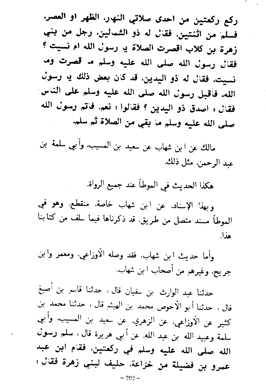 رَكَعَ رَكْعَتَيْنِ مِنْ إِحْدَى صَلَاتَيِ النَّهَارِ الظَّهْرِ أَوِ الْعَصْرِ فَسَلَّمَ مِنَ اثْنَتَيْنِ فَقَالَ لَهُ ذُو الشِّمَالَيْنِ رَجُلٌ مِنْ بَنِي زُهْرَةَ بْنِ كِلَابٍ أَقُصِرَتِ الصَّلَاةُ يَا رَسُولَ اللَّهِ أَمْ نَسِيتَ فَقَالَ رَسُولُ اللَّهِ صَلَّى اللَّهُ عَلَيْهِ وَسَلَّمَ ما قصرة وَمَا نَسِيتُ فَقَالَ لَهُ ذُو الْيَدَيْنِ قَدْ كَانَ بَعْضُ ذَلِكَ يَا رَسُولَ اللَّهِ فَأَقْبَلَ رَسُولُ اللَّهِ صَلَّى اللَّهُ عَلَيْهِ وَسَلَّمَ عَلَى النَّاسِ فَقَالَ أَصَدَقَ ذُو الْيَدَيْنِ فَقَالُوا نَعَمْ فَأَتَمَّ رَسُولُ اللَّهِ صَلَّى اللَّهُ عَلَيْهِ وَسَلَّمَ مَا بَقِيَ مِنَ الصَّلَاةِ ثُمَّ سَلَّمَ مَالِكٌ عَنِ ابْنِ شِهَابٍ عَنْ سَعِيدِ بْنِ الْمُسَيَّبِ وَأَبِي سَلَمَةَ بْنِ عَبْدِ الرَّحْمَنِ مِثْلُ ذَلِكَ هَكَذَا الْحَدِيثُ فِي الْمُوَطَّأِ عِنْدَ جَمِيعِ الرُّوَاةِ وَبِهَذَا الْإِسْنَادِ عَنِ ابْنِ شِهَابٍ خَاصَّةً مُنْقَطِعٌ وَهُوَ فِي الْمُوَطَّأِ مُسْنَدٌ مُتَّصِلٌ مِنْ طَرِيقٍ قَدْ ذَكَرْنَاهَا فِيمَا سَلَفَ مِنْ كِتَابِنَا هَذَا وَأَمَّا حَدِيثُ ابْنِ شِهَابٍ فَقَدْ وَصَلَهُ الْأَوْزَاعِيُّ وَمَعْمَرٌ وَابْنُ جُرَيْجٍ وَغَيْرُهُمْ مِنْ أَصْحَابِ ابْنِ شِهَابٍ حَدَّثَنَا عَبْدُ الْوَارِثِ بْنُ سُفْيَانَ قَالَ حَدَّثَنَا قَاسِمُ بْنُ أَصْبَغَ قَالَ حَدَّثَنَا أَبُو الْأَحْوَصِ مُحَمَّدُ بْنُ الْهَيْثَمِ قَالَ حَدَّثَنَا مُحَمَّدُ بْنُ كَثِيرٍ عَنِ الْأَوْزَاعِيِّ عَنِ الزُّهْرِيِّ عَنْ سَعِيدِ بْنِ الْمُسَيَّبِ وَأَبِي سَلَمَةَ وَعُبَيْدِ اللَّهِ بْنِ عَبْدِ اللَّهِ عَنْ أَبِي هُرَيْرَةَ قَالَ سَلَّمَ رَسُولُ اللَّهِ صَلَّى اللَّهُ عَلَيْهِ وَسَلَّمَ فِي رَكْعَتَيْنِ فَقَامَ ابْنُ عَبْدِ عَمْرِو بْنِ فَضِيلَةَ مِنْ خُزَاعَةَ حَلِيفٌ لِبَنِي زُهْرَةَ فَقَالَ