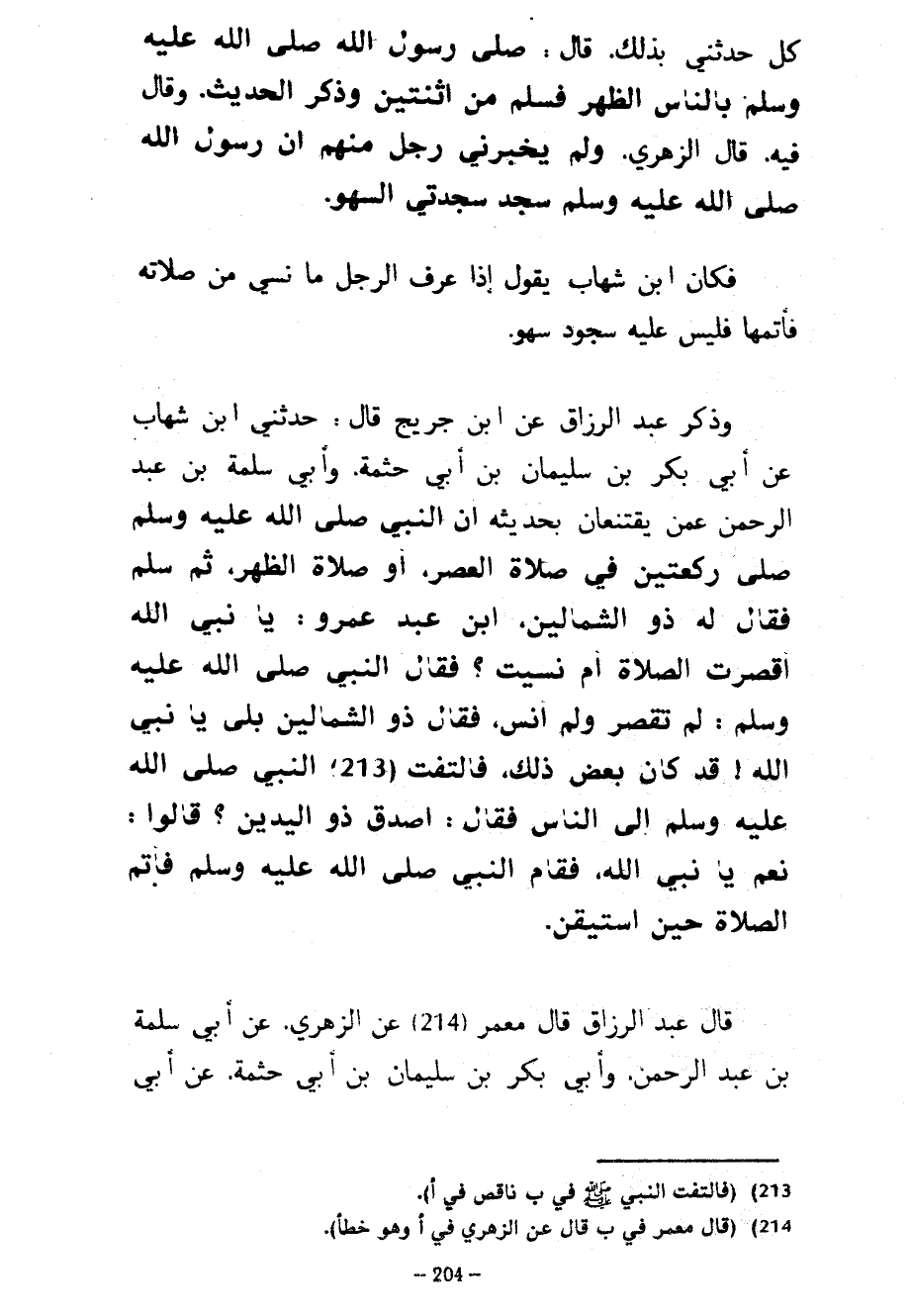كُلٌّ حَدَّثَنِي بِذَلِكَ قَالَ صَلَّى رَسُولُ اللَّهِ صَلَّى اللَّهُ عَلَيْهِ وَسَلَّمَ بِالنَّاسِ الظُّهْرَ فَسَلَّمَ مِنَ اثْنَتَيْنِ وَذَكَرَ الْحَدِيثَ وَقَالَ فِيهِ قَالَ الزُّهُرِيُّ وَلَمْ يُخْبِرْنِي رَجُلٌ مِنْهُمْ أَنَّ رَسُولَ اللَّهِ صَلَّى اللَّهُ عَلَيْهِ وَسَلَّمَ سَجَدَ سَجْدَتَيِ السَّهْوِ فَكَانَ ابْنُ شِهَابٍ يَقُولُ إِذَا عَرَفَ الرَّجُلُ مَا نَسِيَ مِنْ صَلَاتِهِ فَأَتَمَّهَا فَلَيْسَ عَلَيْهِ سُجُودُ سَهْوٍ وَذَكَرَ عَبْدُ الرَّزَّاقِ عَنِ ابْنِ جُرَيْجٍ قَالَ حَدَّثَنِي ابْنُ شِهَابٍ عَنْ أَبِي بَكْرِ بْنِ سُلَيْمَانَ بْنِ أَبِي حَثْمَةَ وَأَبِي سَلَمَةَ بْنِ عَبْدِ الرَّحْمَنِ عَمَّنْ يَقْتَنِعَانِ بِحَدِيثِهِ أَنَّ النَّبِيَّ صَلَّى اللَّهُ عَلَيْهِ وَسَلَّمَ صَلَّى رَكْعَتَيْنِ فِي صَلَاةِ الْعَصْرِ أَوْ صَلَاةِ الظُّهْرِ ثُمَّ سَلَّمَ فَقَالَ لَهُ ذُو الشِّمَالَيْنِ ابْنُ عَبْدِ عَمْرٍو يَا نَبِيَّ اللَّهِ أَقُصِرَتِ الصَّلَاةُ أَمْ نَسِيتَ فَقَالَ النَّبِيُّ صَلَّى اللَّهُ عَلَيْهِ وَسَلَّمَ لَمْ تُقْصَرْ وَلَمْ أَنْسَ فَقَالَ ذُو الشِّمَالَيْنِ بَلَى يَا نَبِيَّ اللَّهِ قَدْ كَانَ بَعْضُ ذَلِكَ فَالْتَفَتَ النَّبِيُّ صَلَّى اللَّهُ عَلَيْهِ وَسَلَّمَ إِلَى النَّاسِ فَقَالَ أَصَدَقَ ذُو الْيَدَيْنِ قَالُوا نَعَمْ يَا نَبِيَّ اللَّهِ فَقَامَ النَّبِيُّ صَلَّى اللَّهُ عَلَيْهِ وَسَلَّمَ فَأَتَمَّ الصَّلَاةَ حِينَ اسْتَيْقَنَ قَالَ عَبْدُ الرَّزَّاقِ قَالَ مَعْمَرٌ عَنِ الزُّهْرِيُّ عَنْ أَبِي سَلَمَةَ بْنِ عَبْدِ الرَّحْمَنِ وَأَبِي بَكْرِ بْنِ سِلْمِيانَ بْنِ أَبِي حَثْمَةَ عن أبي