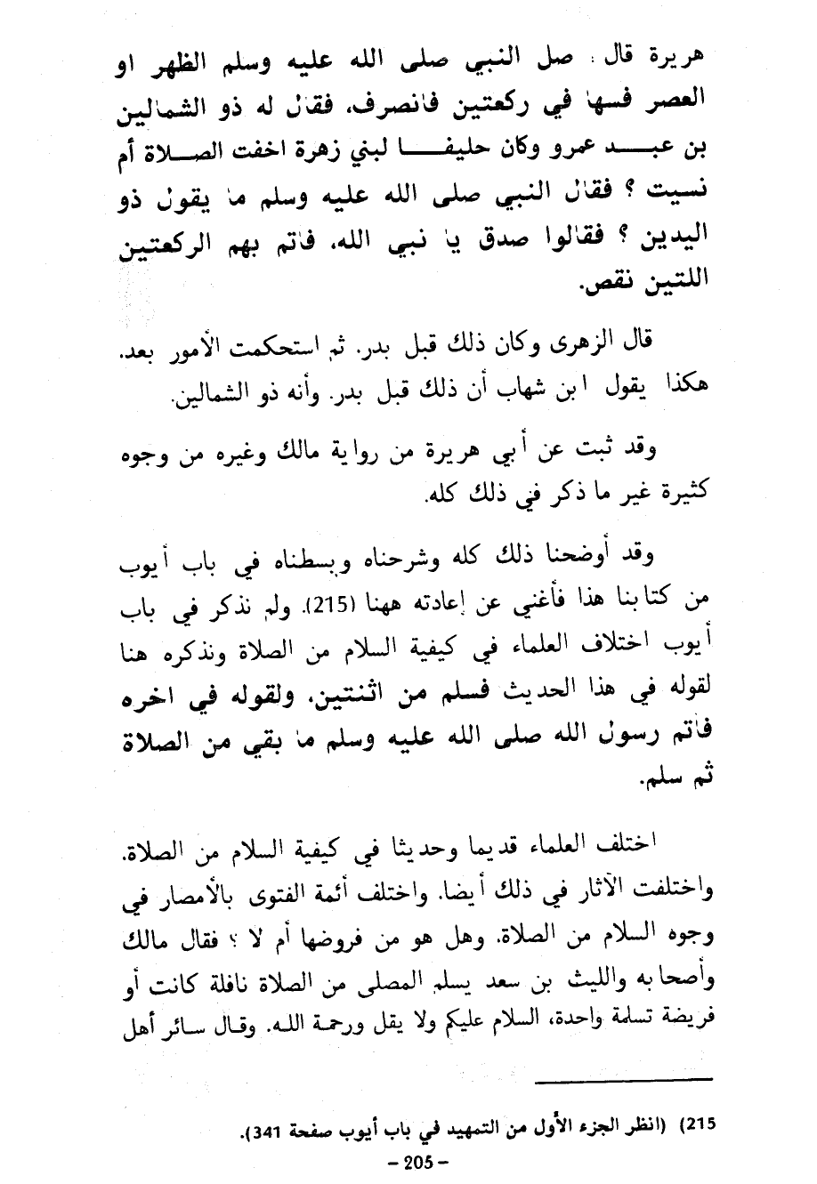 هُرَيْرَةَ قَالَ صَلَّى النَّبِيُّ صَلَّى اللَّهُ عَلَيْهِ وَسَلَّمَ الظهر أوالعصر فسها في كرعتين فَانْصَرَفَ فَقَالَ لَهُ ذُو الشِّمَالَيْنِ بْنُ عَبْدِ عَمْرٍو وَكَانَ حَلِيفًا لِبَنِي زُهْرَةَ أَخَفَّتِ الصَّلَاةُ أَمْ نَسِيتَ فَقَالَ النَّبِيُّ صَلَّى اللَّهُ عَلَيْهِ وَسَلَّمَ مَا يَقُولُ ذُو الْيَدَيْنِ فَقَالُوا صَدَقَ يَا نَبِيَّ اللَّهِ فَأَتَمَّ بِهِمُ الرَّكْعَتَيْنِ اللَّتَيْنِ نَقَصَ قَالَ الزُّهْرِيُّ وَكَانَ ذَلِكَ قَبْلَ بَدْرٍ ثُمَّ اسْتَحْكَمَتِ الْأُمُورُ بَعْدُ هَكَذَا يَقُولُ ابْنُ شِهَابٍ إِنَّ ذَلِكَ قَبْلَ بَدْرٍ وَإِنَّهُ ذُو الشِّمَالَيْنِ وَقَدْ ثَبَتَ عَنْ أَبِي هُرَيْرَةَ مِنْ رِوَايَةِ مَالِكٍ وَغَيْرِهِ مِنْ وُجُوهٍ كَثِيرَةٍ غَيْرُ مَا ذُكِرَ فِي ذَلِكَ كُلِّهِ وَقَدْ أَوْضَحْنَا ذَلِكَ كُلَّهُ وَشَرَحْنَاهُ وَبَسَطْنَاهُ فِي بَابِ أَيُّوبَ مِنْ كِتَابِنَا هَذَا فَأَغْنَى عَنْ إِعَادَتِهِ هَهُنَا وَلَمْ نَذْكُرْ فِي بَابِ أَيُّوبَ اخْتِلَافَ الْعُلَمَاءِ فِي كَيْفِيَّةِ السَّلَامِ مِنَ الصَّلَاةِ وَنَذْكُرُهُ هُنَا لِقَوْلِهِ فِي هَذَا الْحَدِيثِ فَسَلَّمَ مِنَ اثْنَتَيْنِ وَلِقَوْلِهِ فِي آخِرِهِ فَأَتَمَّ رَسُولُ اللَّهِ صَلَّى اللَّهُ عَلَيْهِ وَسَلَّمَ مَا بَقِيَ مِنَ الصَّلَاةِ ثُمَّ سَلَّمَ اخْتَلَفَ الْعُلَمَاءُ قَدِيمًا وَحَدِيثًا فِي كَيْفِيَّةِ السَّلَامِ مِنَ الصَّلَاةِ وَاخْتَلَفَتِ الْآثَارُ فِي ذَلِكَ أَيْضًا وَاخْتَلَفَ أَئِمَّةُ الْفَتْوَى بِالْأَمْصَارِ فِي وُجُوهِ السَّلَامِ مِنَ الصَّلَاةِ وَهَلْ هُوَ مِنْ فُرُوضِهَا أَمْ لَا فَقَالَ مَالِكٌ وَأَصْحَابُهُ وَاللَّيْثُ بْنُ سَعْدٍ يُسَلِّمُ الْمُصَلِّي مِنَ الصَّلَاةِ نَافِلَةً كَانَتْ أَوْ فَرِيضَةً تَسْلِيمَةً وَاحِدَةً السَّلَامُ عَلَيْكُمْ وَلَا يَقُلْ وَرَحْمَةُ اللَّهِ وَقَالَ سَائِرُ أَهْلِ