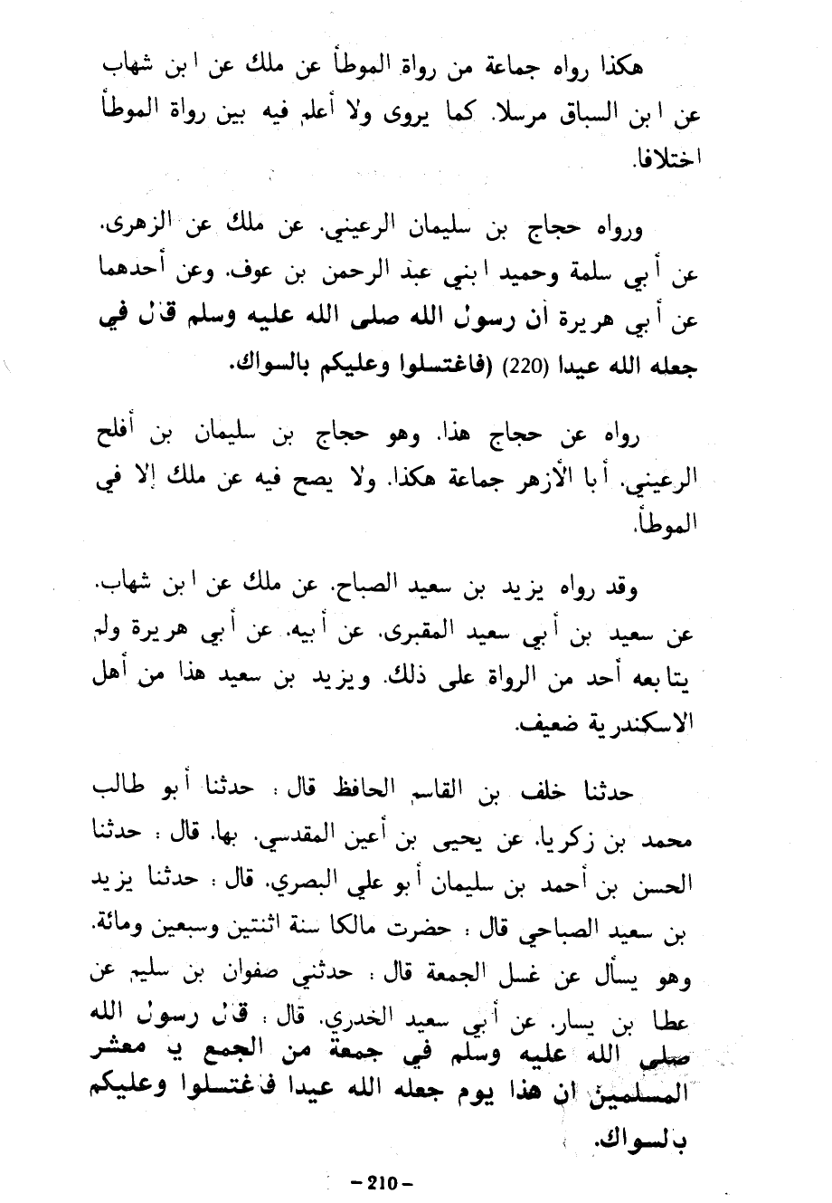 هَكَذَا رَوَاهُ جَمَاعَةٌ مِنْ رُوَاةِ الْمُوَطَّأِ عَنْ مَالِكٍ عَنِ ابْنِ شِهَابٍ عَنِ ابْنِ السباق مرسلا كما روى وَلَا أَعْلَمُ فِيهِ بَيْنَ رُوَاةِ الْمُوَطَّأِ اخْتِلَافًا وَرَوَاهُ حَجَّاجُ بْنُ سُلَيْمَانَ الرُّعَيْنِيُّ عَنْ مَالِكٍ عَنِ الزُّهْرِيِّ عَنْ أَبِي سَلَمَةَ وَحُمَيْدٍ ابْنَيْ عَبْدِ الرَّحْمَنِ بْنِ عَوْفٍ وَعَنْ أَحَدِهِمَا عَنْ أَبِي هُرَيْرَةَ أَنَّ رَسُولَ اللَّهِ صَلَّى اللَّهُ عليه وسلم قال في جَعَلَهُ اللَّهُ عِيدًا (فَاغْتَسِلُوا وَعَلَيْكُمْ بِالسِّوَاكِ) رَوَاهُ عَنْ حَجَّاجٍ هَذَا وَهُوَ حَجَّاجُ بْنُ سُلَيْمَانَ بْنِ أَفْلَحَ الرُّعَيْنِيُّ أَبَا الْأَزْهَرِ جَمَاعَةٌ هَكَذَا وَلَا يَصِحُّ فِيهِ عَنْ مَالِكٍ إِلَّا فِي الْمُوَطَّأِ وَقَدْ رَوَاهُ يَزِيدُ بْنُ سَعِيدٍ الصَّبَّاحُ عَنْ مَالِكٍ عَنِ ابْنِ شِهَابٍ عَنْ سَعِيدِ بْنِ أَبِي سَعِيدٍ الْمَقْبُرِيِّ عَنْ أَبِيهِ عَنْ أَبِي هُرَيْرَةَ وَلَمْ يُتَابِعْهُ أَحَدٌ مِنَ الرُّوَاةِ عَلَى ذَلِكَ وَيَزِيدُ بْنُ سَعِيدٍ هَذَا مِنْ أَهْلِ الْإِسْكَنْدَرِيَّةِ ضَعِيفٌ حَدَّثَنَا خَلَفُ بْنُ الْقَاسِمِ الْحَافِظُ قَالَ حَدَّثَنَا أَبُو طَالِبٍ مُحَمَّدُ بْنُ زكريا عَنْ يَحْيَى بْنِ أَعْيَنَ الْمَقْدِسِيِّ بِهَا قَالَ حَدَّثَنَا الْحَسَنُ بْنُ أَحْمَدَ بْنِ سُلَيْمَانَ أَبُو عَلِيٍّ الْبَصْرِيُّ قَالَ حَدَّثَنَا يَزِيدُ بْنُ سَعِيدٍ الصَّبَّاحِيُّ قَالَ حَضَرْتُ مَالِكًا سَنَةَ اثْنَتَيْنِ وَسَبْعِينَ وَمِائَةٍ وَهُوَ يُسْأَلُ عَنْ غُسْلِ الْجُمْعَةِ قَالَ حَدَّثَنِي صَفْوَانَ بْنِ سُلَيْمٍ عَنْ عَطَاءِ بْنِ يَسَارٍ عَنْ أَبِي سَعِيدٍ الْخُدْرِيِّ قَالَ قَالَ رَسُولُ اللَّهِ صَلَّى اللَّهُ عليه وسلم في جُمْعَةٍ مِنَ الْجُمَعِ يَا مَعْشَرَ الْمُسْلِمِينَ إِنَّ هَذَا يَوْمٌ جَعَلَهُ اللَّهُ عِيدًا فَاغْتَسِلُوا وَعَلَيْكُمْ بالسواك
