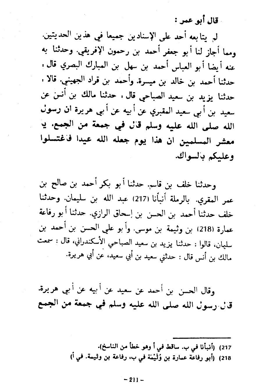 قَالَ أَبُو عُمَرَ لَمْ يُتَابِعْهُ أَحَدٌ عَلَى الْإِسْنَادَيْنِ جَمِيعًا فِي هَذَيْنِ الْحَدِيثَيْنِ وَمِمَّا أَجَازَ لَنَا أَبُو جَعْفَرٍ أَحْمَدُ بْنُ رَحْمُونَ الْإِفْرِيقِيُّ وَحَدَّثَنَا بِهِ عَنْهُ أَيْضًا أَبُو الْعَبَّاسِ أَحْمَدُ بْنُ سَهْلِ بْنِ الْمُبَارَكِ الْبَصْرِيُّ قَالَ حَدَّثَنَا أَحْمَدُ بْنُ خَالِدِ بْنِ مَيْسَرَةَ وَأَحْمَدُ بْنُ قُرَادٍ الْجُهَيْنِيُّ قَالَا حَدَّثَنَا يَزِيدُ بْنُ سَعِيدٍ الصَّبَّاحِيُّ قَالَ حَدَّثَنَا مَالِكُ بْنُ أَنَسٍ عَنْ سَعِيدِ بْنِ أَبِي سَعِيدٍ الْمَقْبُرِيِّ عَنْ أَبِيهِ عَنْ أَبِي هُرَيْرَةَ أَنَّ رَسُولَ اللَّهِ صَلَّى اللَّهُ عَلَيْهِ وَسَلَّمَ قَالَ فِي جمعة من الْجُمَعِ يَا مَعْشَرَ الْمُسْلِمِينَ إِنَّ هَذَا يَوْمٌ جَعَلَهُ اللَّهُ عِيدًا فَاغْتَسِلُوا وَعَلَيْكُمْ بِالسِّوَاكِ وَحَدَّثَنَا خلف بن قاس حَدَّثَنَا أَبُو بَكْرٍ أَحْمَدُ بْنُ صَالِحِ بْنِ عُمَرَ الْمُقْرِيُّ بِالرَّمْلَةِ أَنْبَأَنَا عَبْدُ اللَّهِ بْنُ سُلَيْمَانَ وَحَدَّثَنَا خَلَفٌ حَدَّثَنَا أَحْمَدُ بْنُ الْحَسَنِ بْنِ إِسْحَاقَ الرَّازِيُّ حَدَّثَنَا أَبُو رِفَاعَةَ عِمَارَةُ بْنُ وَثِيمَةَ بْنِ مُوسَى وَأَبُو عَلِيٍّ الْحَسَنُ بْنُ أَحْمَدَ بْنِ سُلَيْمَانَ قَالُوا حَدَّثَنَا يَزِيدُ بْنُ سَعِيدٍ الصَّبَّاحِيُّ الْإِسْكَنْدَرَانِيُّ قَالَ سَمِعْتُ مَالِكَ بْنَ أَنَسٍ يَقُولُ حَدَّثَنِي سَعِيدُ بْنُ أَبِي سَعِيدٍ عَنْ أَبِي هُرَيْرَةَ وَقَالَ الْحَسَنُ بْنُ أَحْمَدَ عَنْ سَعِيدٍ عَنْ أَبِيهِ عَنْ أَبِي هُرَيْرَةَ قَالَ رَسُولُ اللَّهِ صَلَّى اللَّهُ عَلَيْهِ وَسَلَّمَ فِي جُمْعَةٍ مِنَ الْجُمَعِ