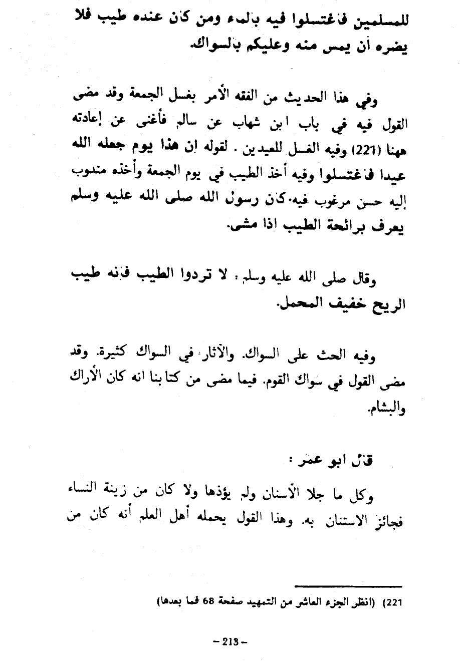 لِلْمُسْلِمِينَ فَاغْتَسِلُوا فِيهِ بِالْمَاءِ وَمَنْ كَانَ عِنْدَهُ طِيبٌ فَلَا يَضُرُّهُ أَنْ يَمَسَّ مِنْهُ وَعَلَيْكُمْ بِالسِّوَاكِ وَفِي هَذَا الْحَدِيثِ مِنَ الْفِقْهِ الْأَمْرُ بِغُسْلِ الْجُمْعَةِ وَقَدْ مَضَى الْقَوْلُ فِيهِ فِي بَابِ ابْنِ شِهَابٍ عَنْ سَالِمٍ فَأَغْنَى عَنْ إعادته ههنا وَفِيهِ الْغُسْلُ لِلْعِيدَيْنِ لِقَوْلِهِ إِنَّ هَذَا يَوْمٌ جَعَلَهُ اللَّهُ عِيدًا فَاغْتَسِلُوا وَفِيهِ أَخْذُ الطِّيبِ فِي يَوْمِ الْجُمْعَةِ وَأَخْذُهُ مَنْدُوبٌ إِلَيْهِ حَسَنٌ مَرْغُوبٌ فِيهِ كَانَ رَسُولُ اللَّهِ صَلَّى اللَّهُ عَلَيْهِ وَسَلَّمَ يُعْرَفُ بِرَائِحَةِ الطِّيبِ إِذَا مَشَى وَقَالَ صَلَّى اللَّهُ عَلَيْهِ وَسَلَّمَ لَا تَرُدُّوا الطِّيبَ فَإِنَّهُ طَيِّبُ الرِّيحِ خَفِيفُ الْمَحْمَلِ وَفِيهِ الْحَثُّ عَلَى السِّوَاكِ وَالْآثَارُ فِي السِّوَاكِ كَثِيرَةٌ وَقَدْ مَضَى الْقَوْلُ فِي سِوَاكِ الْقَوْمِ فِيمَا مَضَى مِنْ كِتَابِنَا أَنَّهُ كَانَ الْأَرَاكَ وَالْبَشَامَ قَالَ أَبُو عُمَرَ وَكُلُّ مَا جَلَا الْأَسْنَانَ وَلَمْ يُؤْذِهَا وَلَا كَانَ مِنْ زِينَةِ النِّسَاءِ فَجَائِزٌ الِاسْتِنَانُ بِهِ وَهَذَا الْقَوْلُ يَحْمِلُهُ أَهْلُ الْعِلْمِ أَنَّهُ كَانَ مِنْ